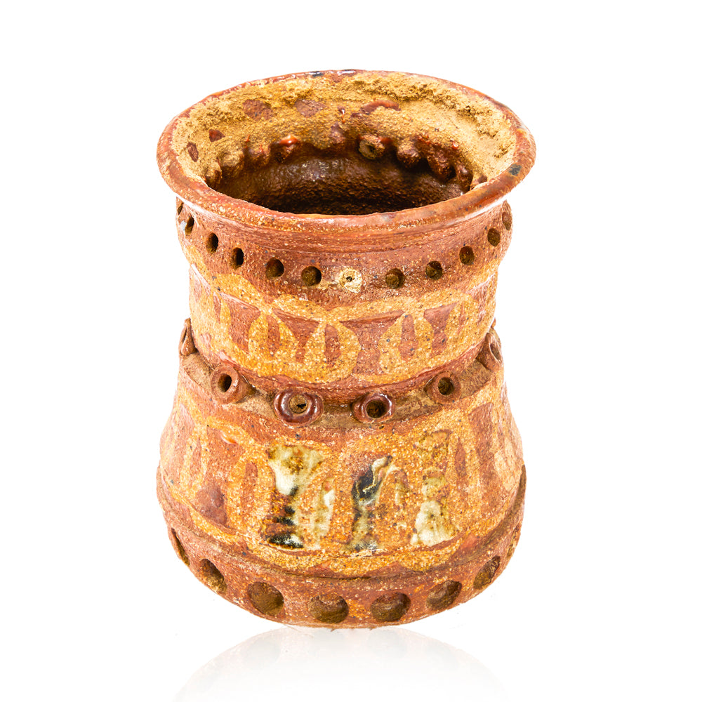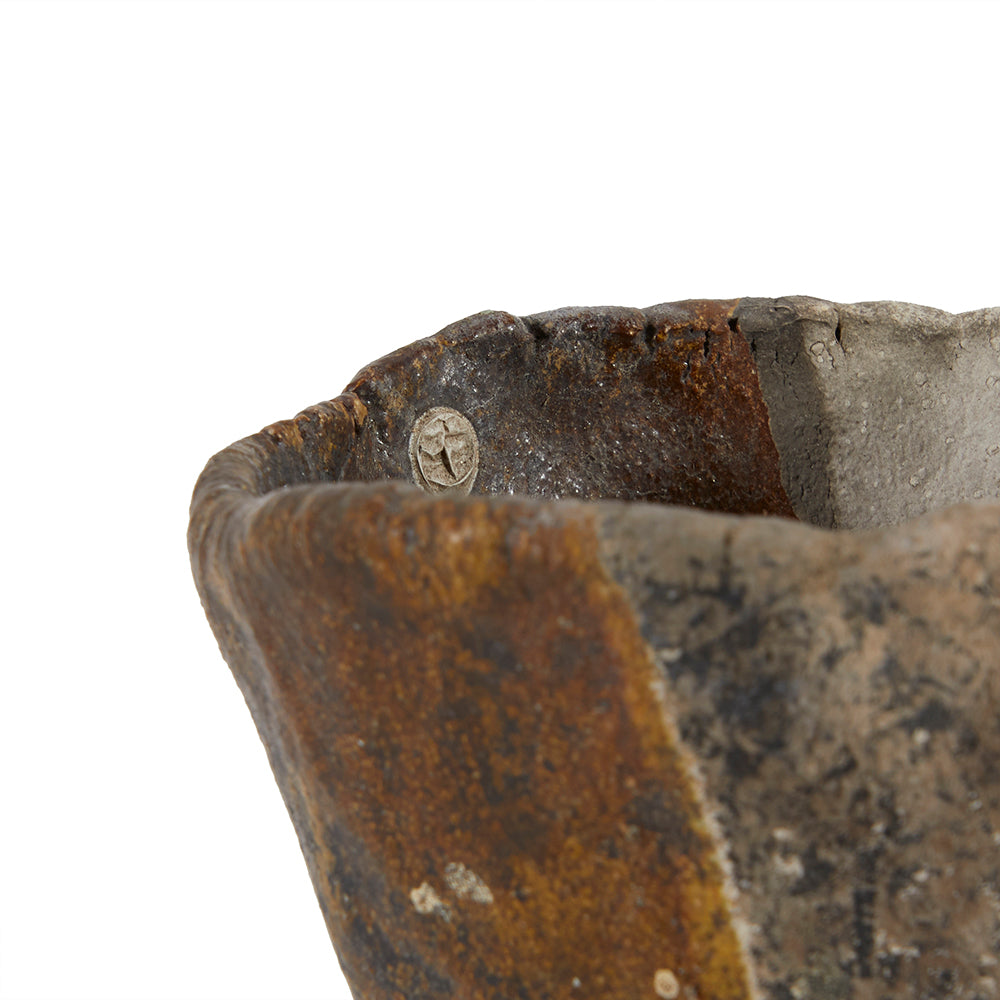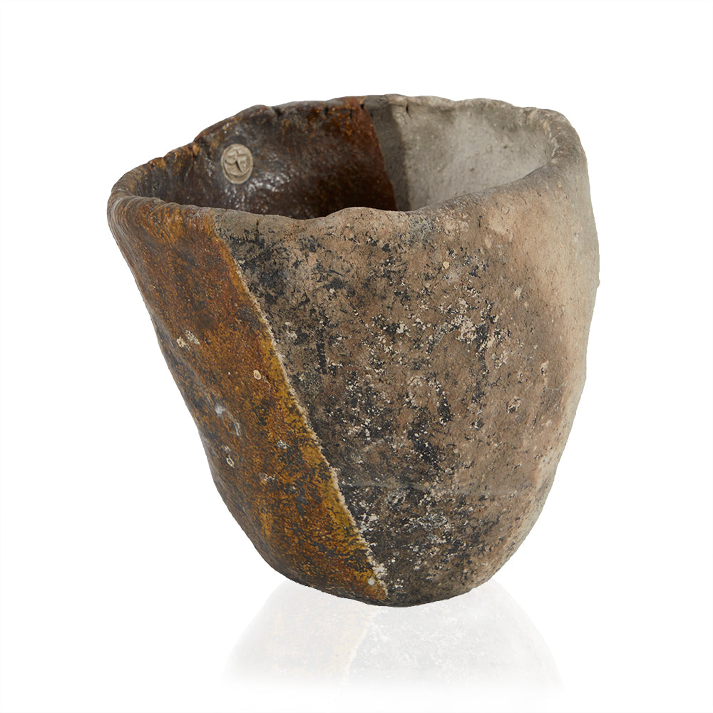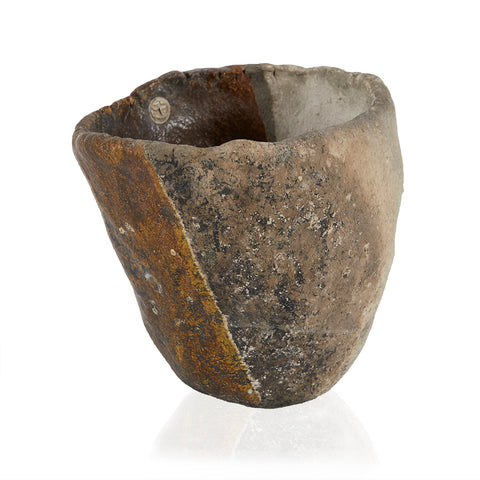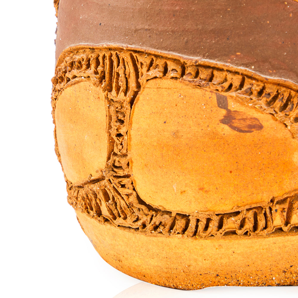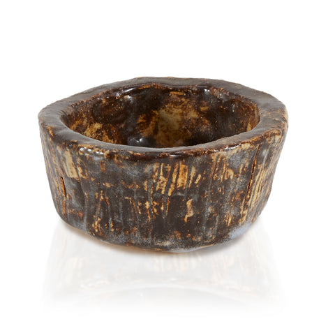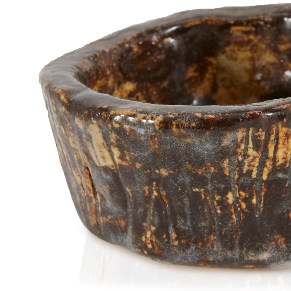 Details: Brown stoneware ceramic pinch pot with rudimentary glaze and design elements Dimensions: 3" H x 5" W x 5" D