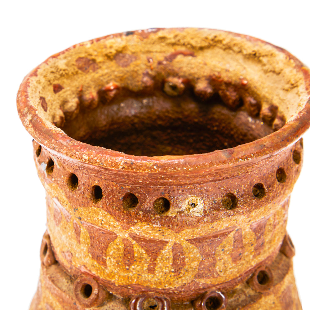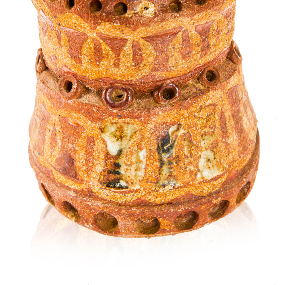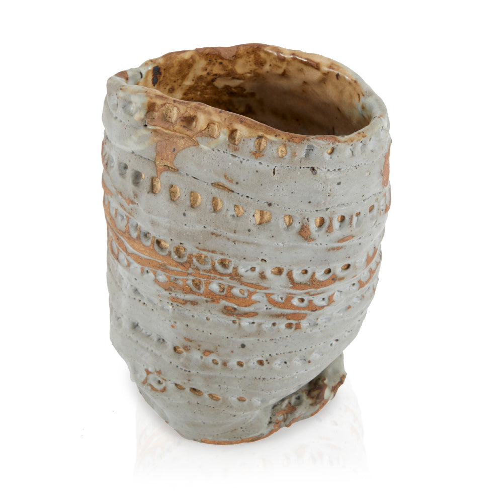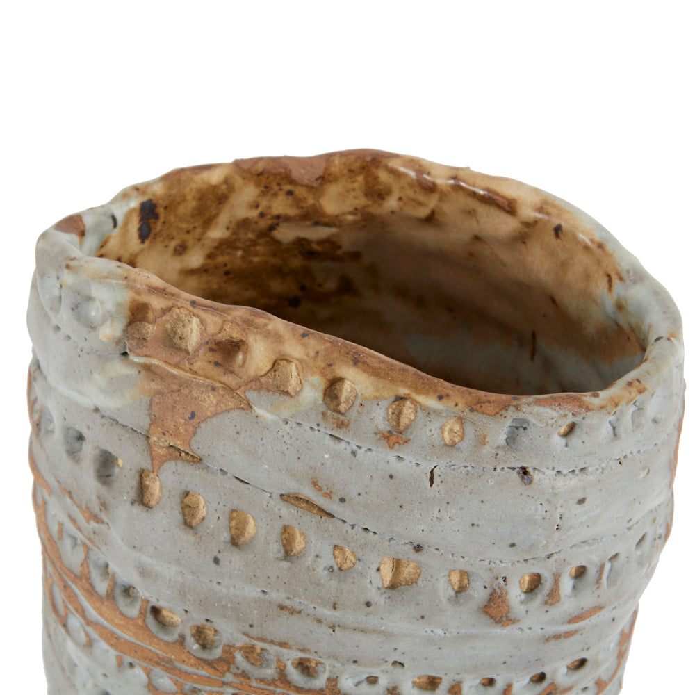 Details: Hand built ceramic coil vase with crude grey paint and exterior design Dimensions: 9" H x 4" W x 6.5" D Quantity: 1