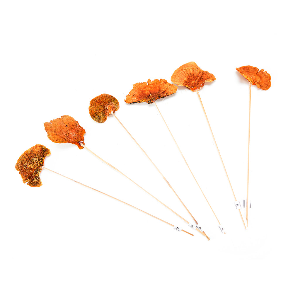 Details: Various mushrooms on wooden sticks for display Dimensions: 19" H x 5" W x 1" D Quantity: 6