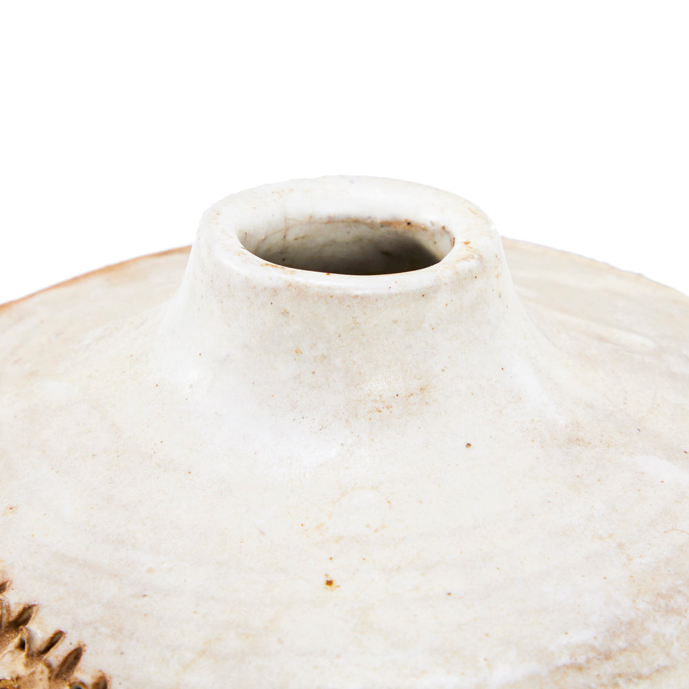 Details: Ceramic jug vase with white glazed top and primitive scoring design Dimensions: 6.5" H x 6" W x 6" D Quantity: 1