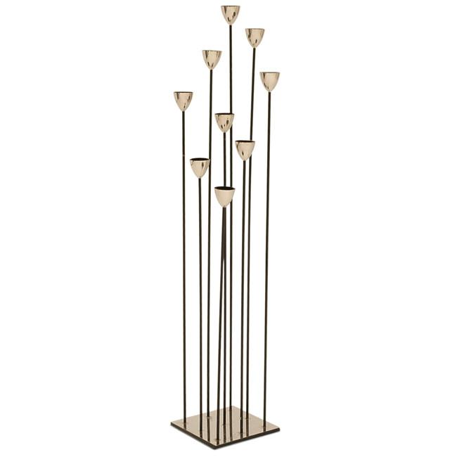 Details: Chrome candelabra with thin black rods of varying heights suspending chrome candle holders on a square base