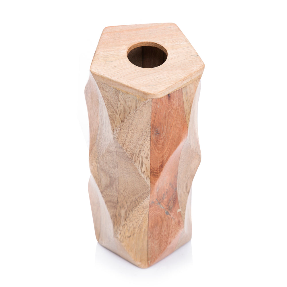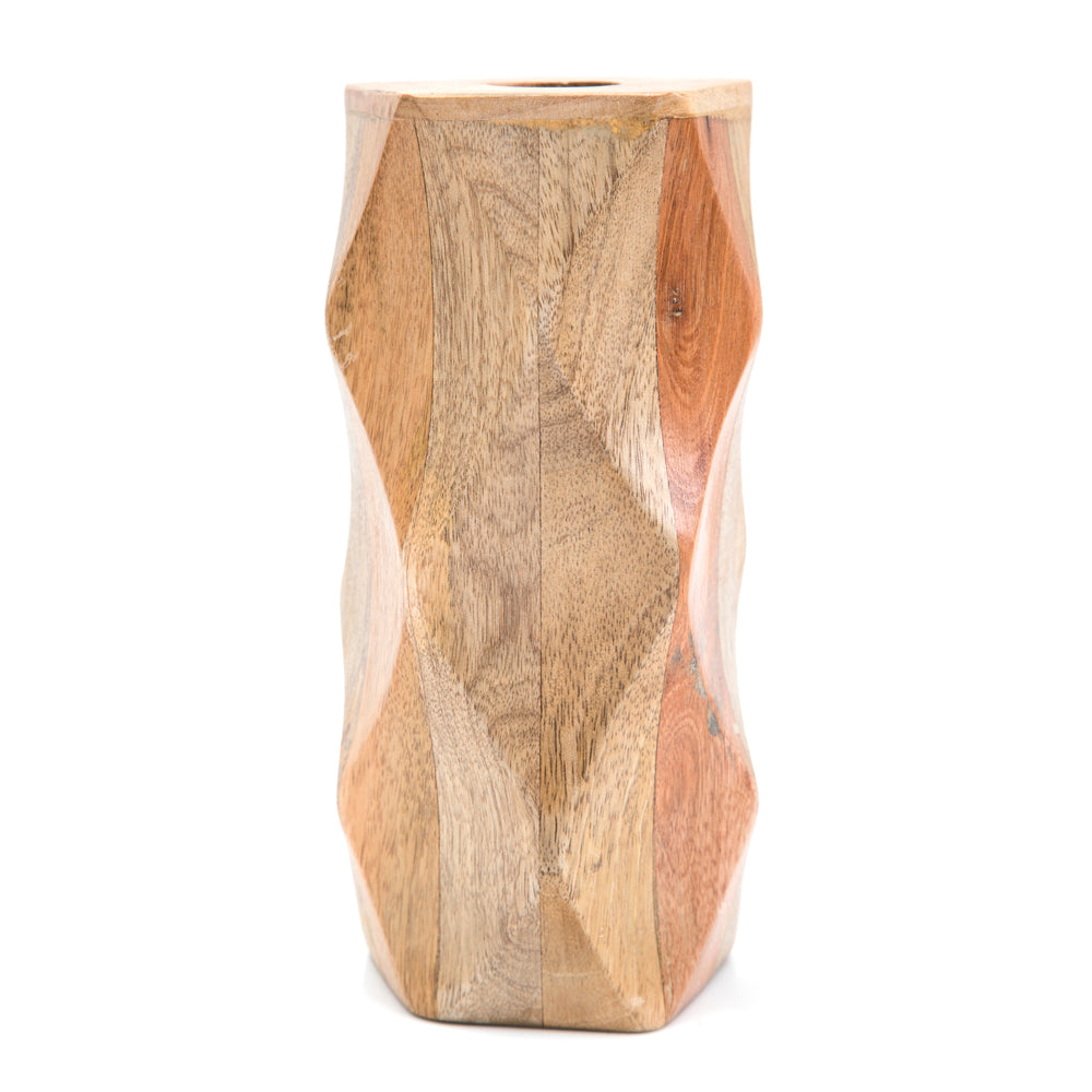Details: Contemporary wood vase with diamond cut faceted sides.