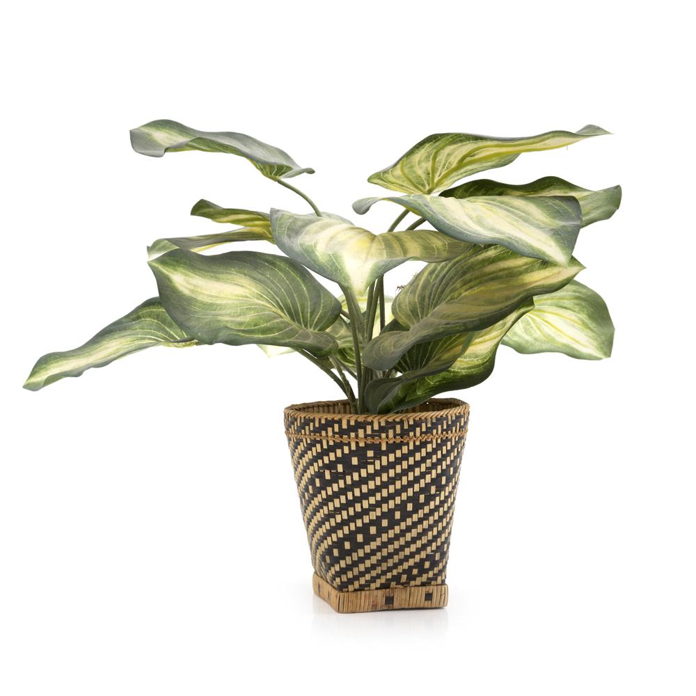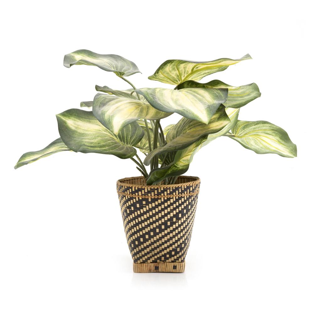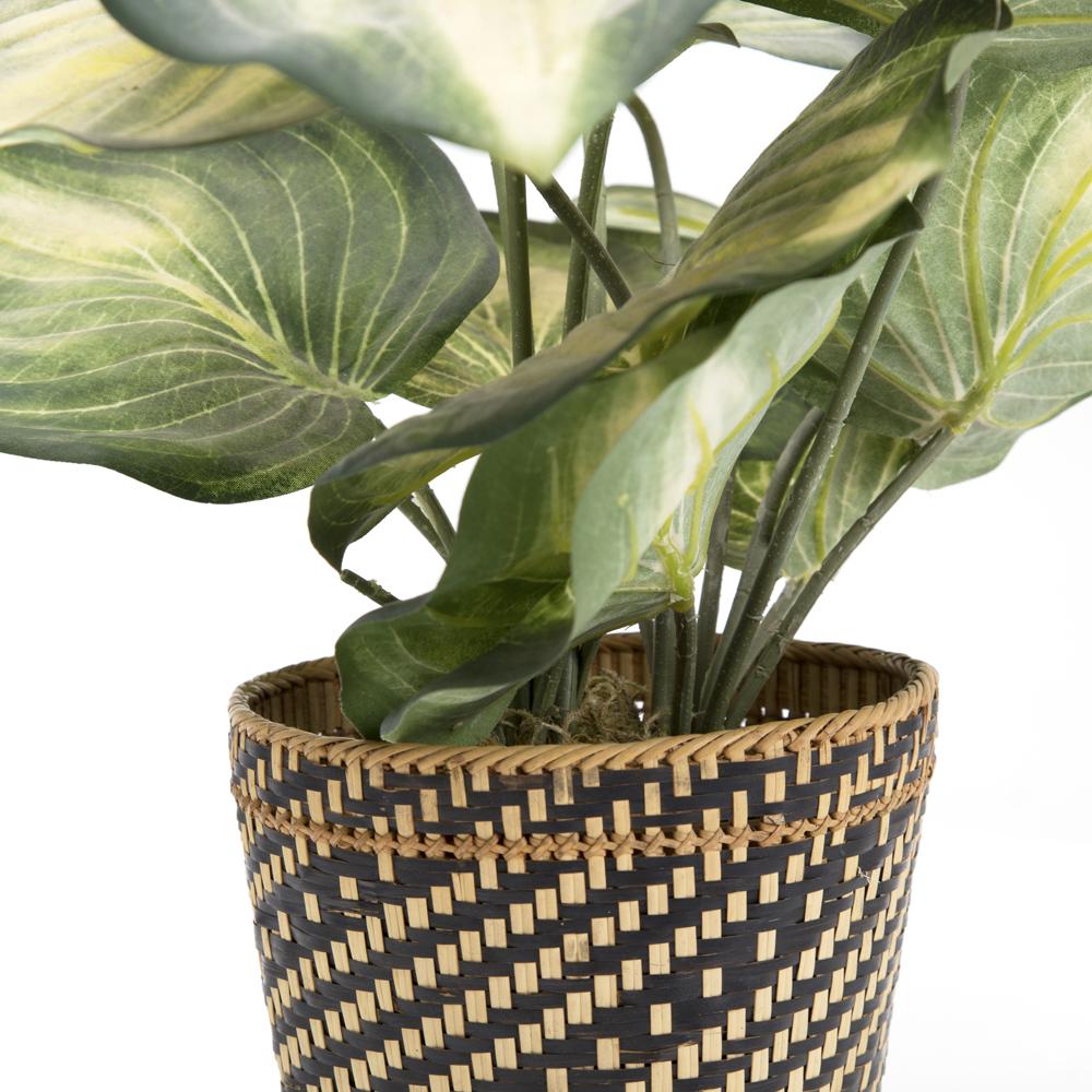 Details: Black and tan woven wicker planter with faux plant