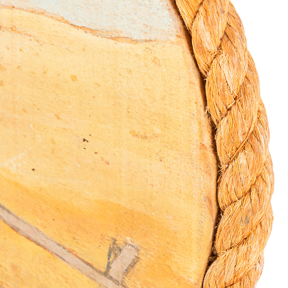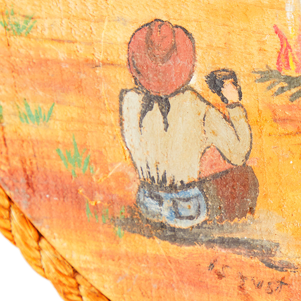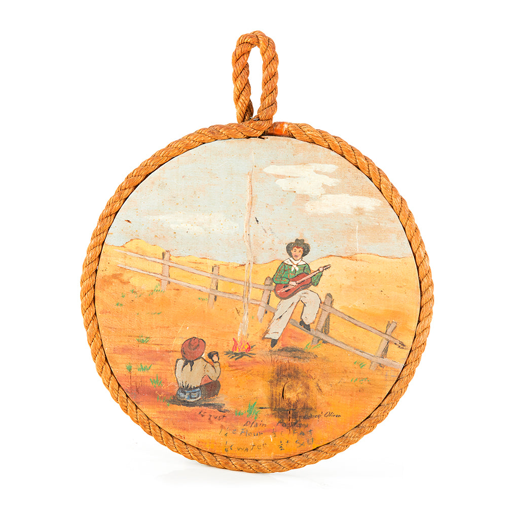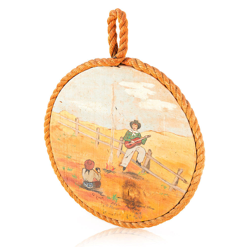 Details: Hanging circular painting with rope trim and cowboys on a ranch Dimensions: 16" H x 12" W x 1" D Quantity: 1