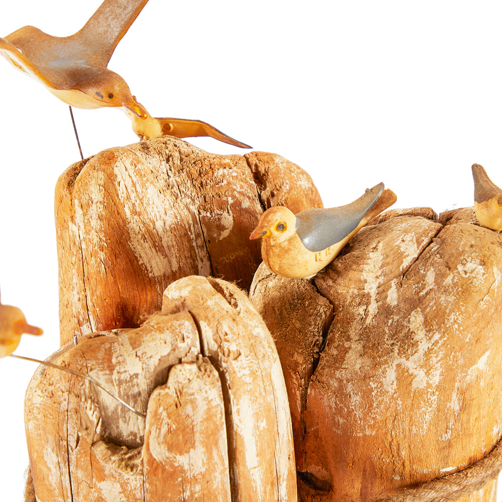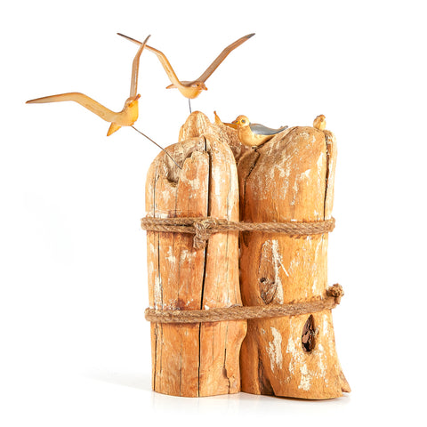 Details: Sculpture displaying resin birds and wooden pier posts Dimensions: 9" H x 8" W x 6" D Quantity: 1