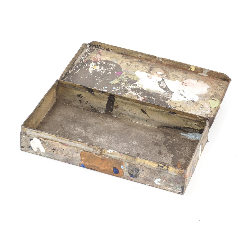 Details: Rustic box messily covered in paint, perhaps used to store paint supplies Dimensions: 1" H x 6" W x 3" D