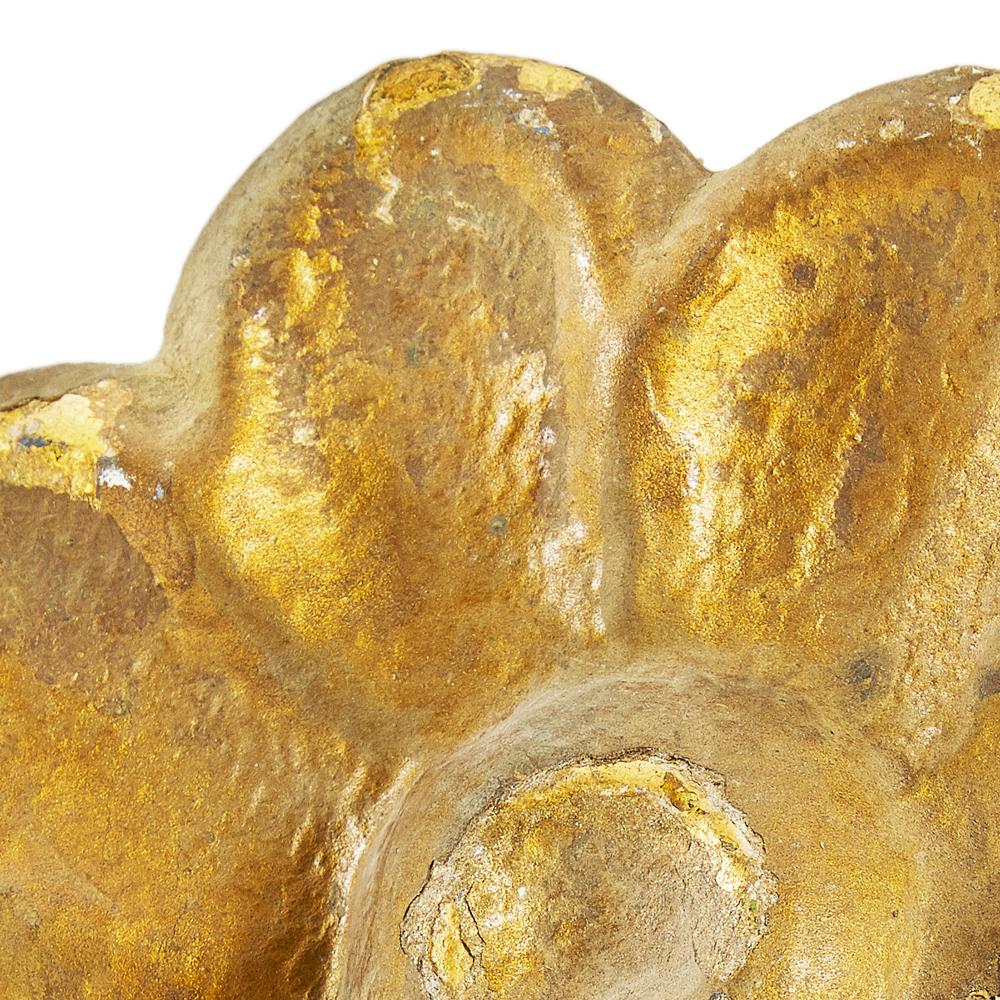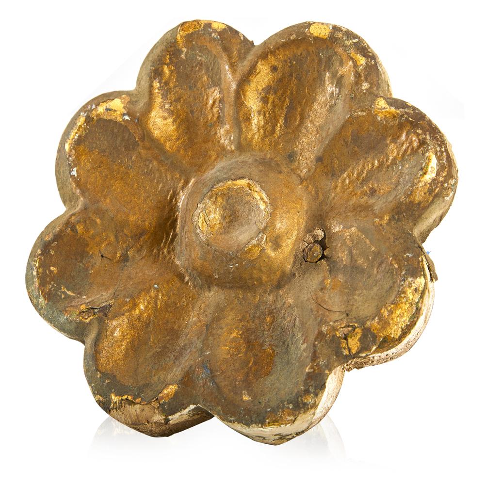 Details: Wooden flower decoration painted with gold leaf Dimensions: 4.75" H x 4.75" W x 1" D Quantity: 1