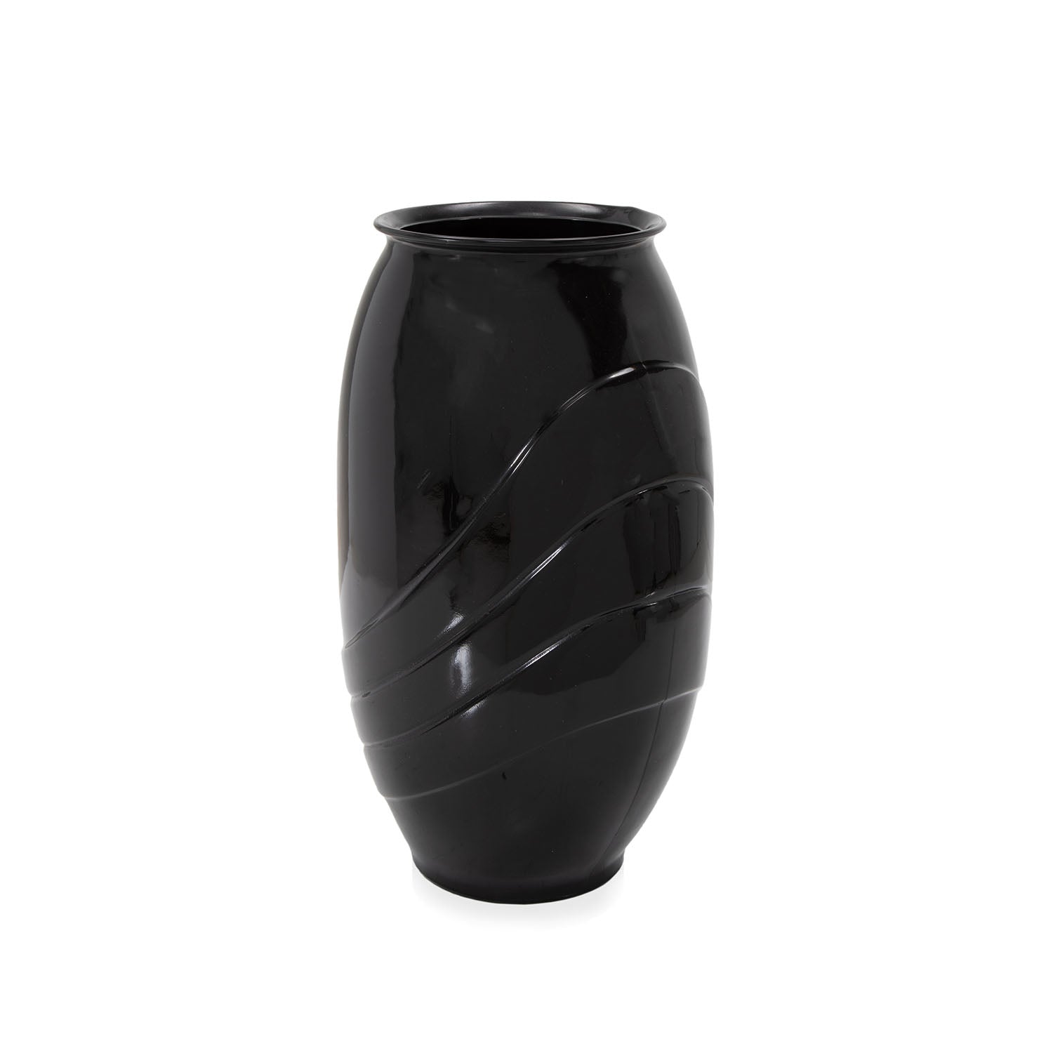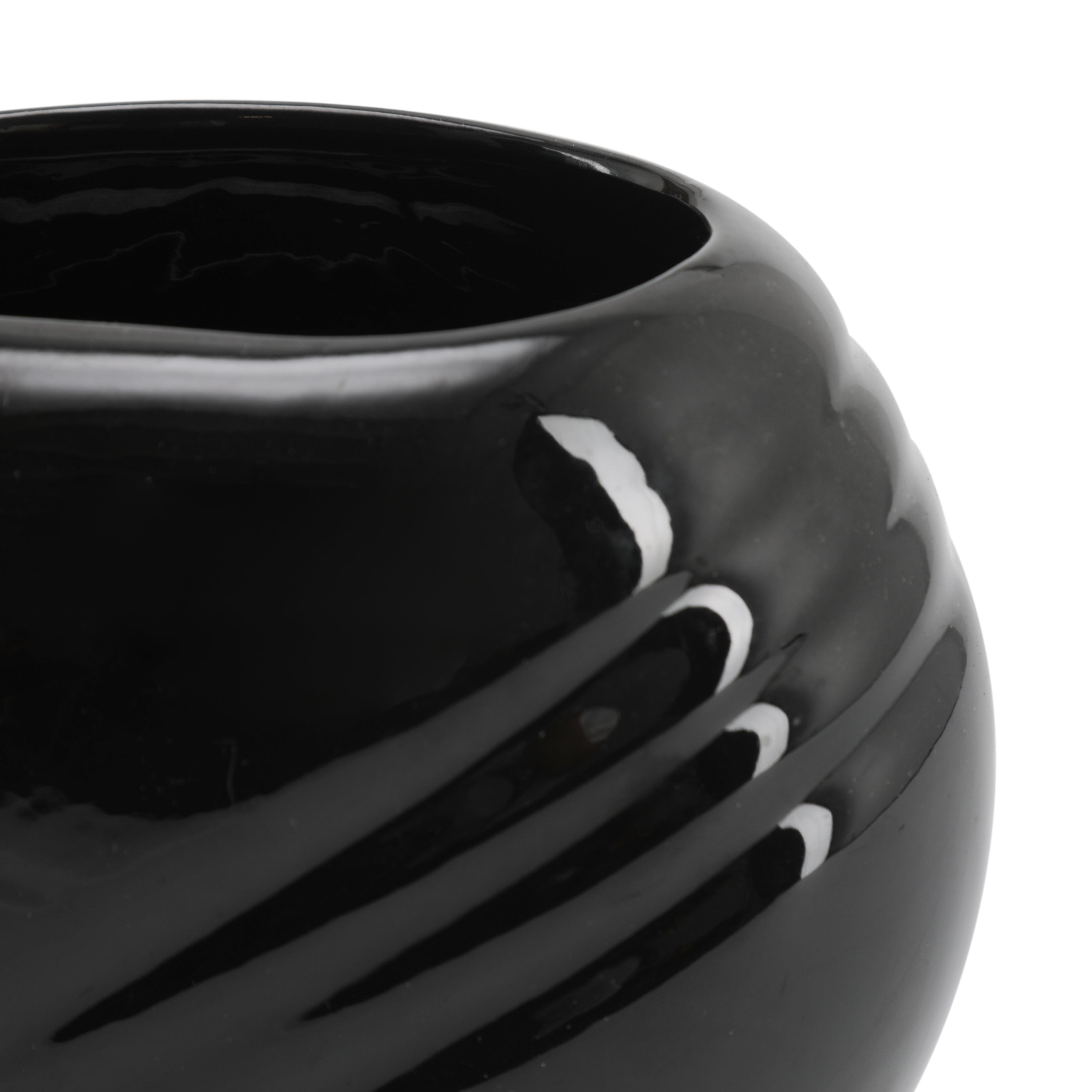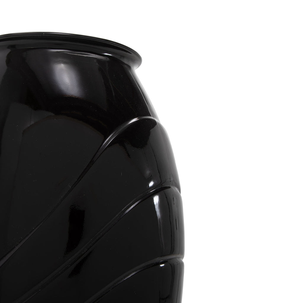 Details: Black ceramic vase with embossed lines and rounded shape. Dimensions: 6" H x 6" W x 4" D