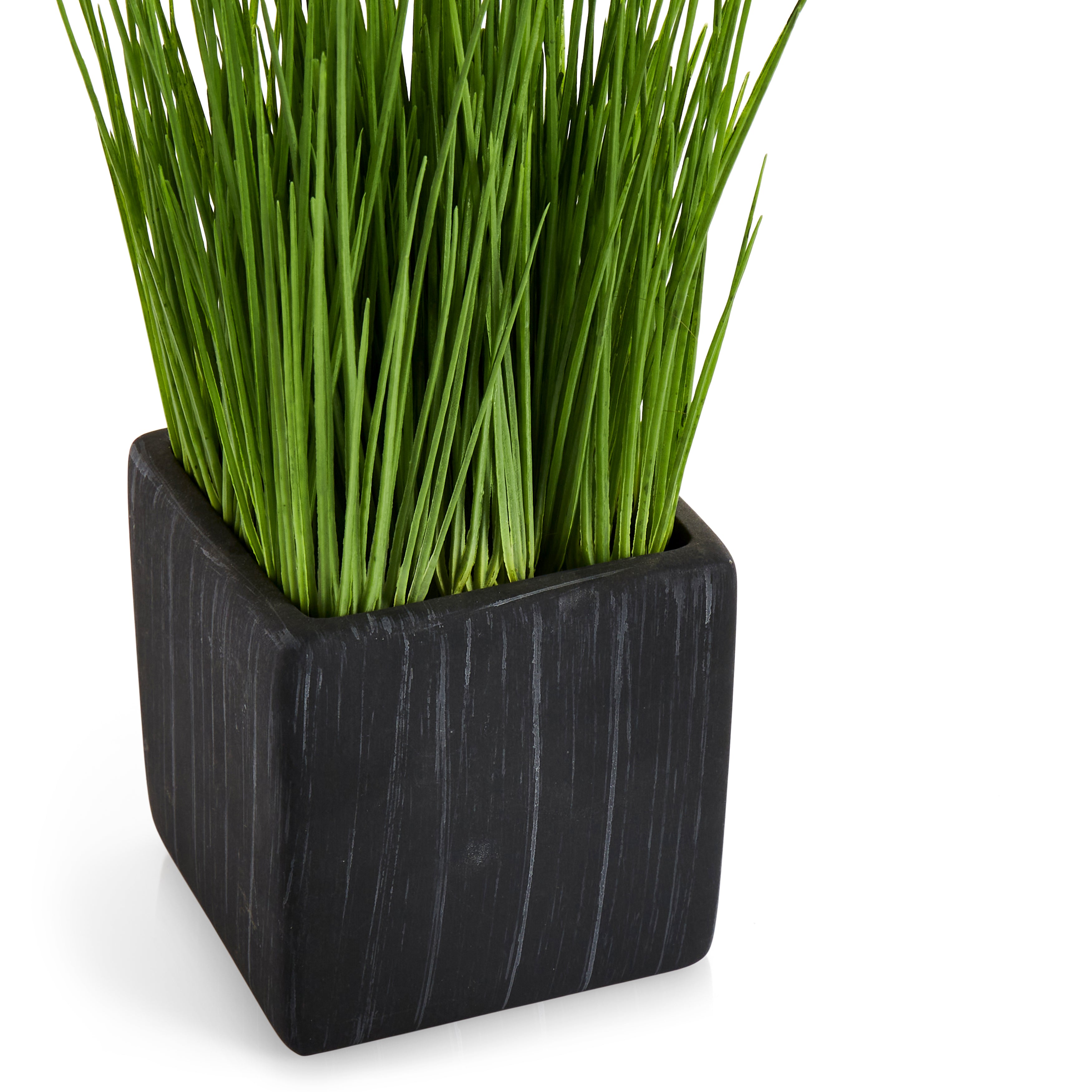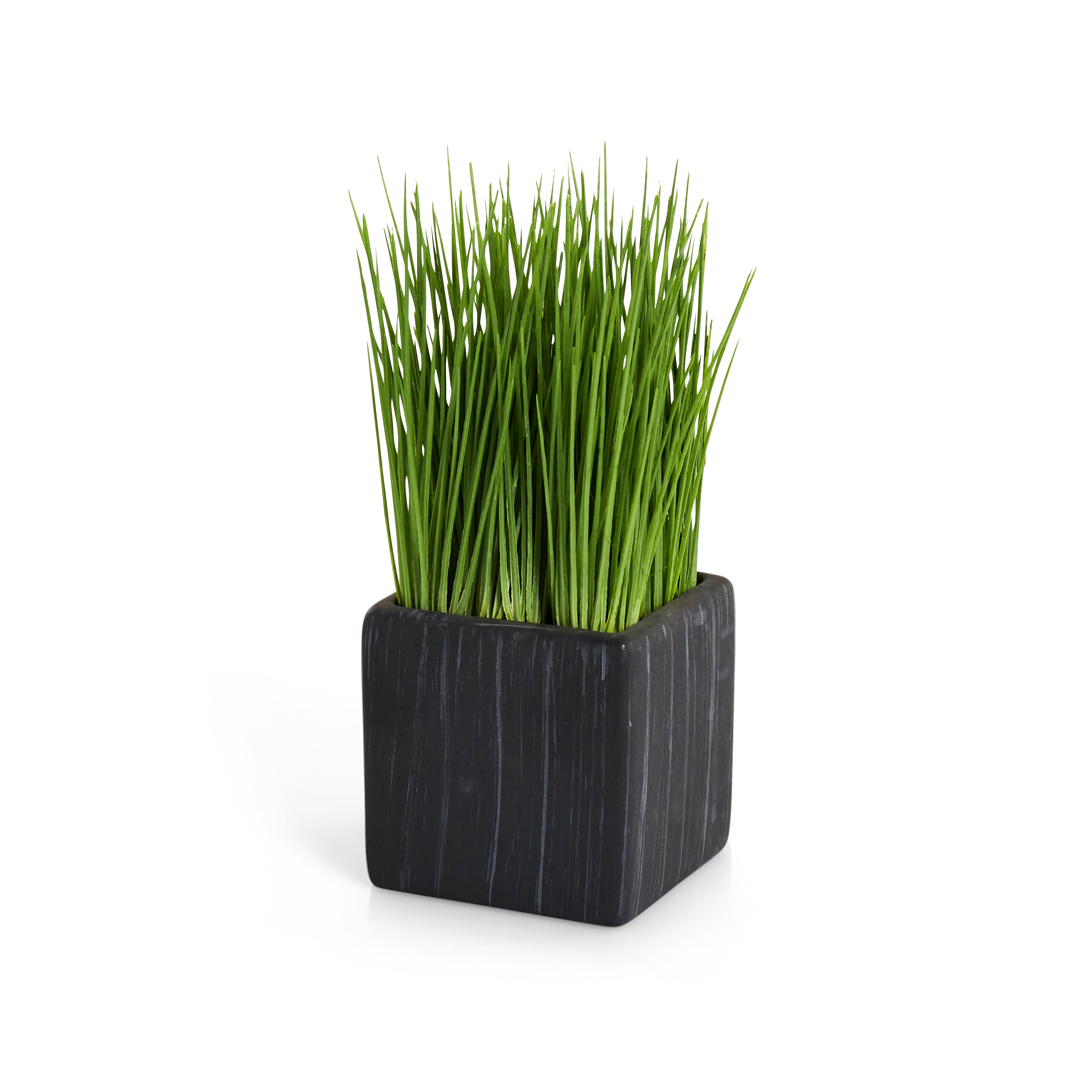 Details: Black ceramic cube planter with gray streaks and grass. Dimensions: 9" H x 4" W x 4" D