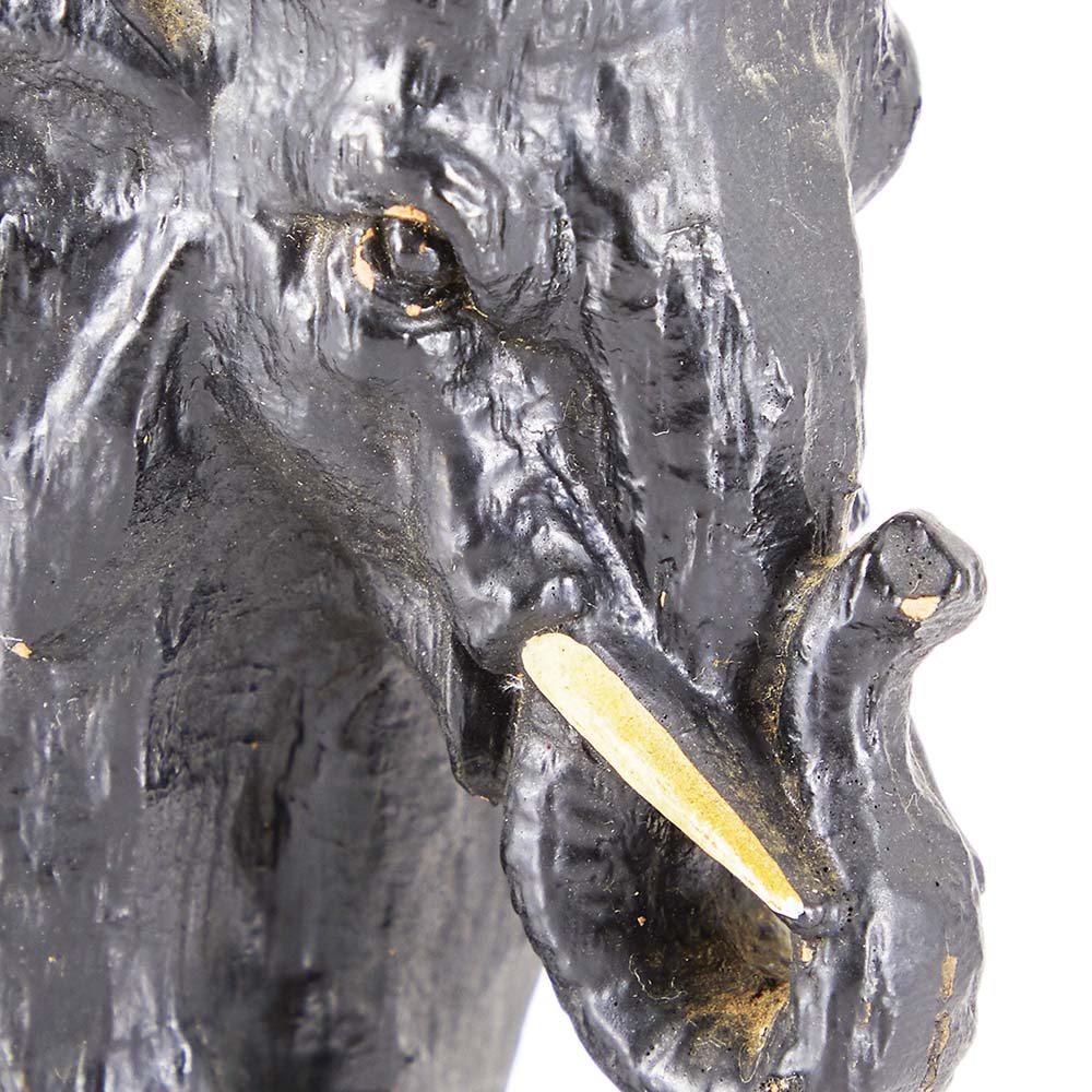Details: Black painted elephant table sculpture with cloth headdress Dimensions: 19" H x 6" W x 19" D Quantity: 1