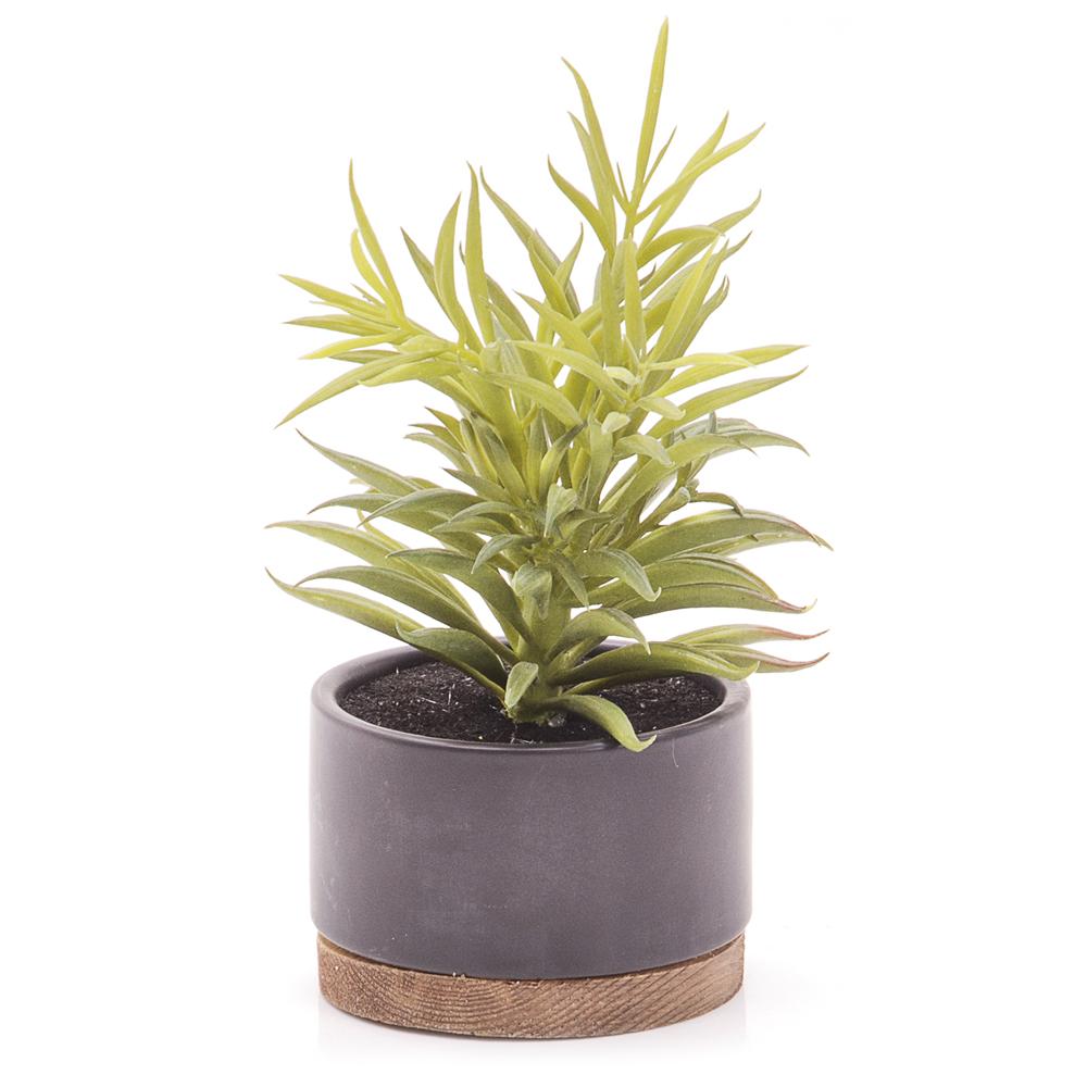 Details: Black minimalist ceramic pot with green artificial succulent Dimensions: 9" H x 4" W x 4" D