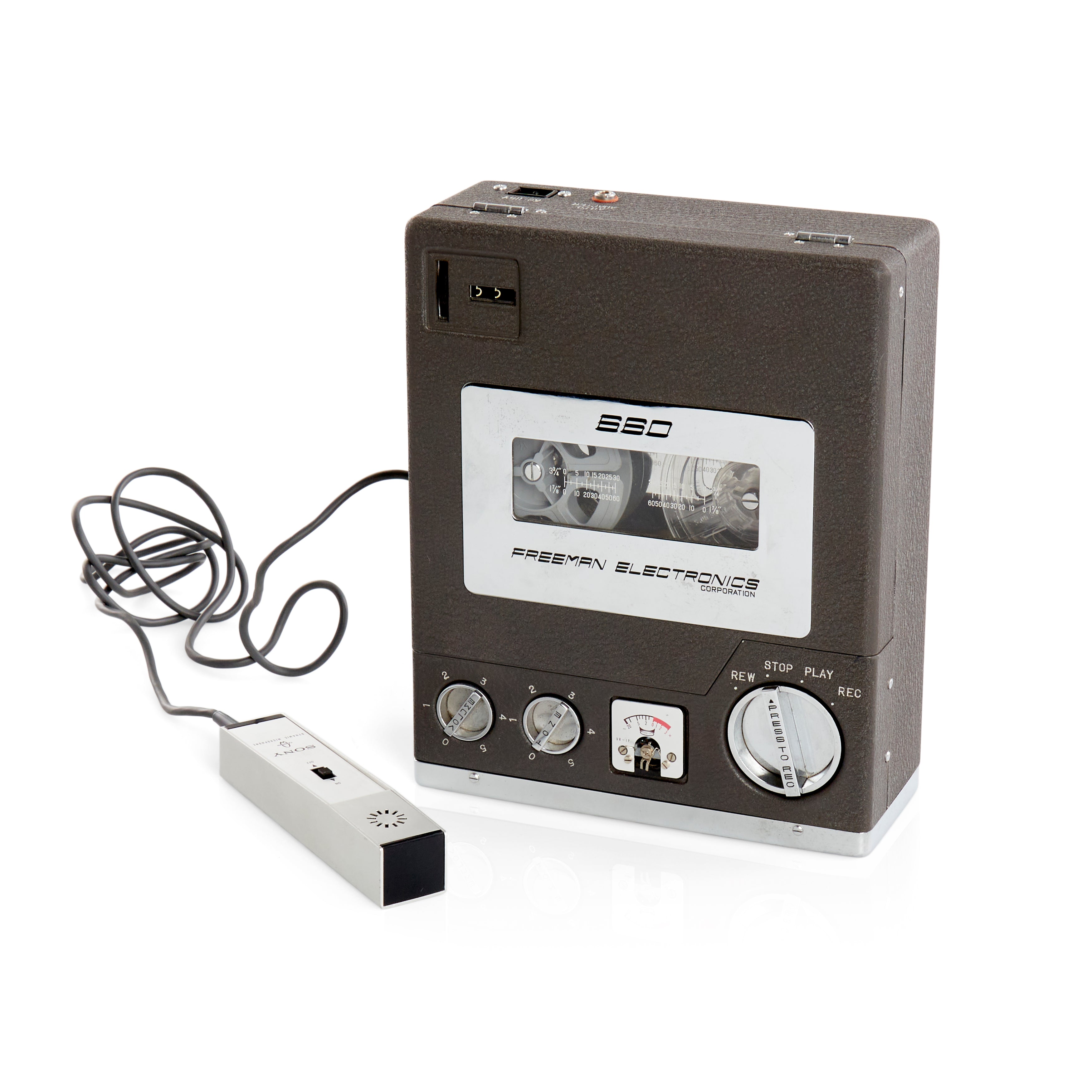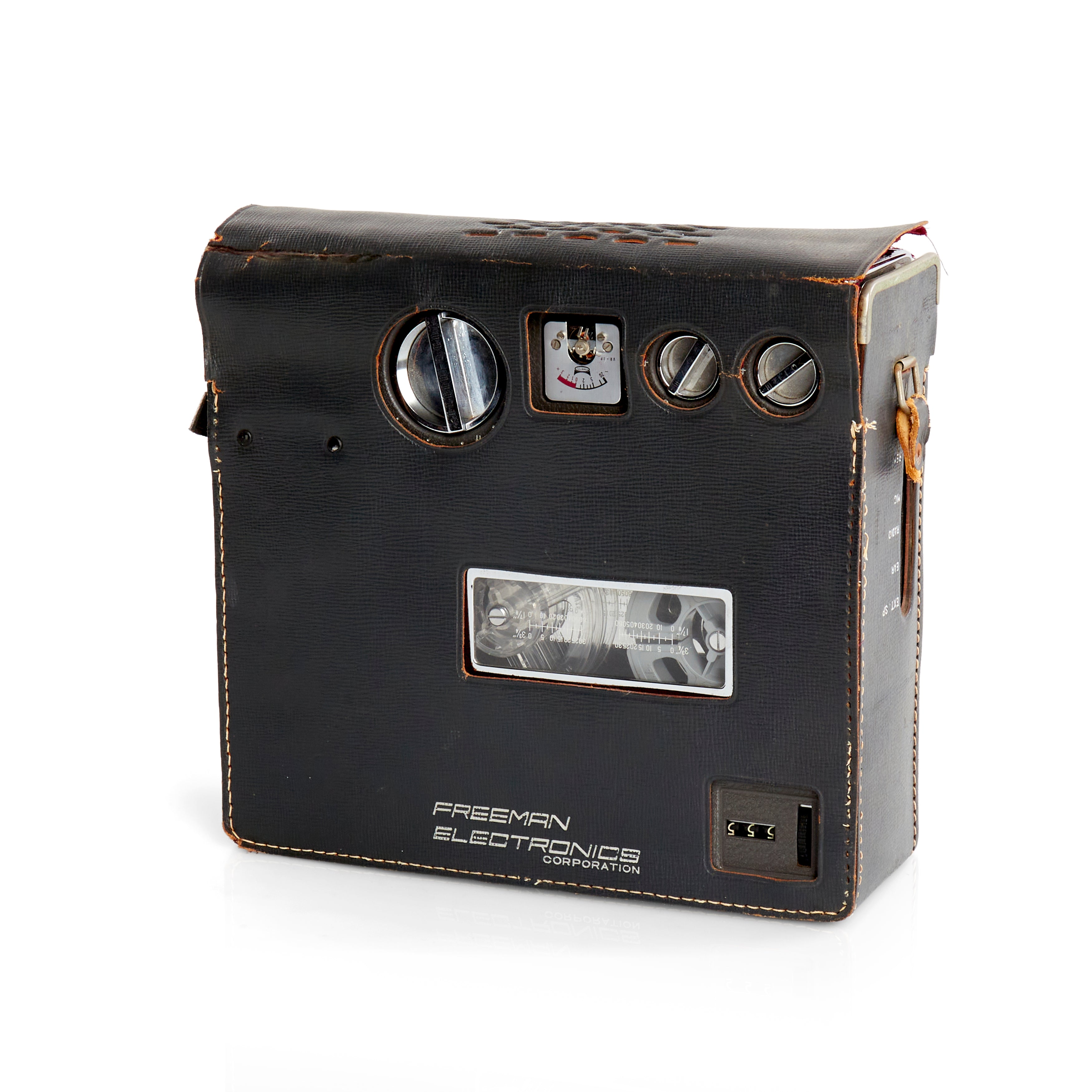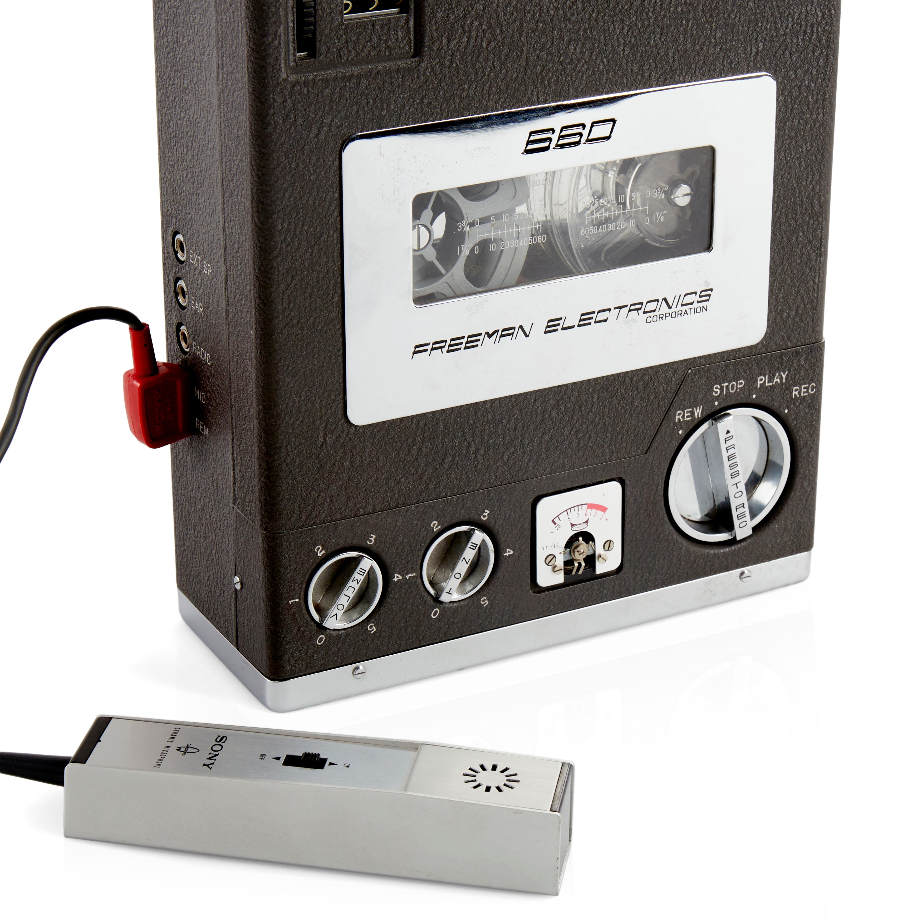 Details: Brown metal reel to reel tape recorder and player with small microphone and leather case Dimensions: 9" H x 8" W x 3" D