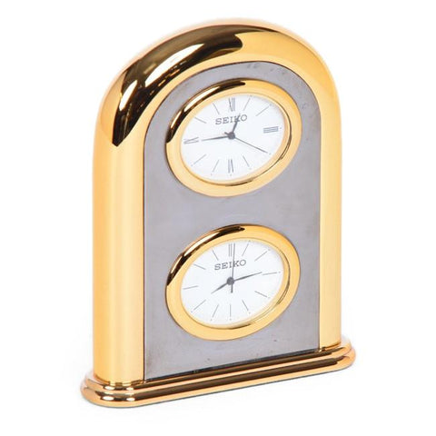 Details: Seiko, Dome Shaped, Clock, Table Top, Two Round Faces, GoldDimensions: 3.75" H x 3.25" W x 1" D