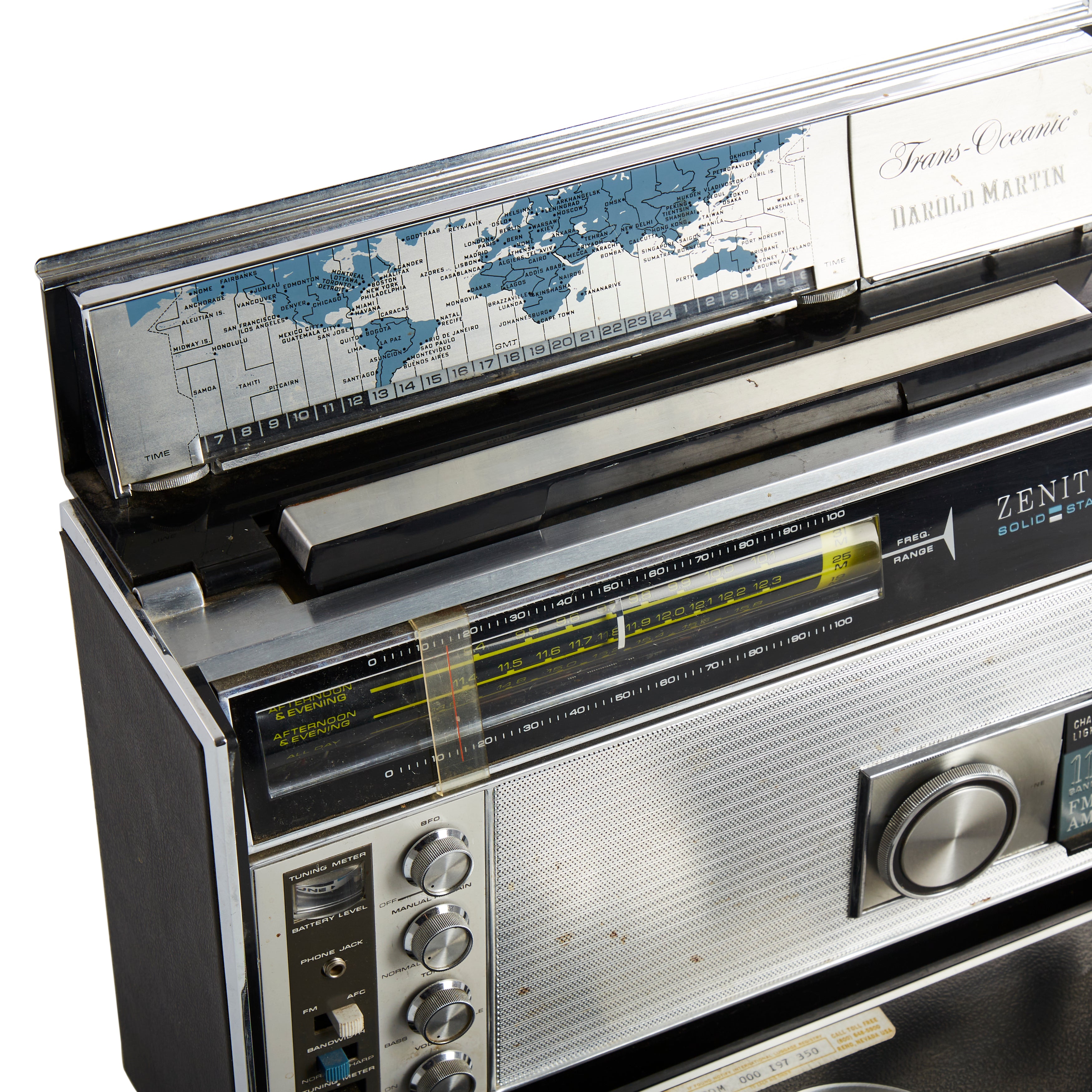 Description: Black and silver Sharp brand stereo boombox with a built-in CD player. The body is constructed of silver metal and black plastic. Dimensions:...