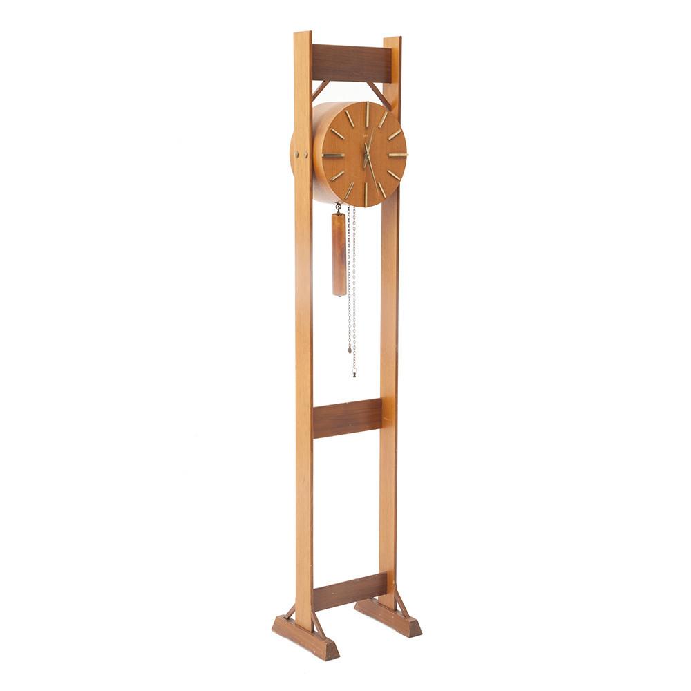 Details: Wooden frame with an aluminum case and black & white clock inside with pendulum Dimensions: 63" H X 16" W X 11" D