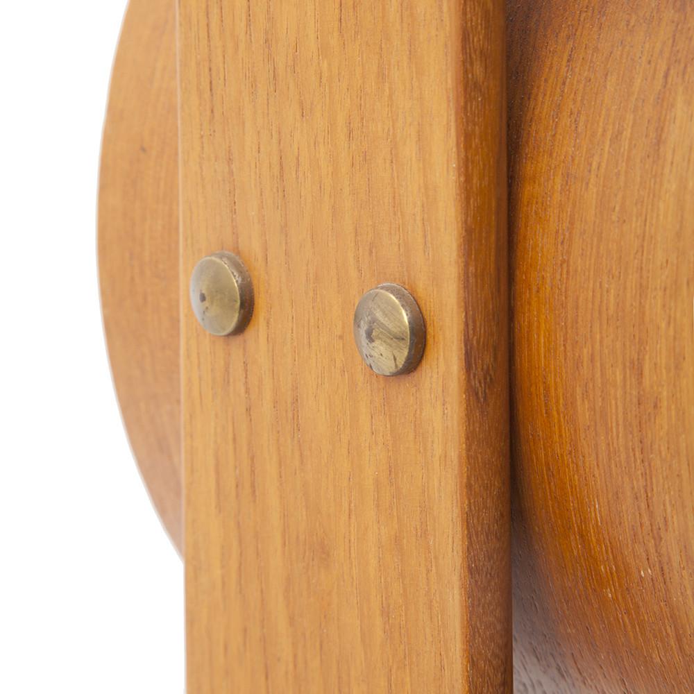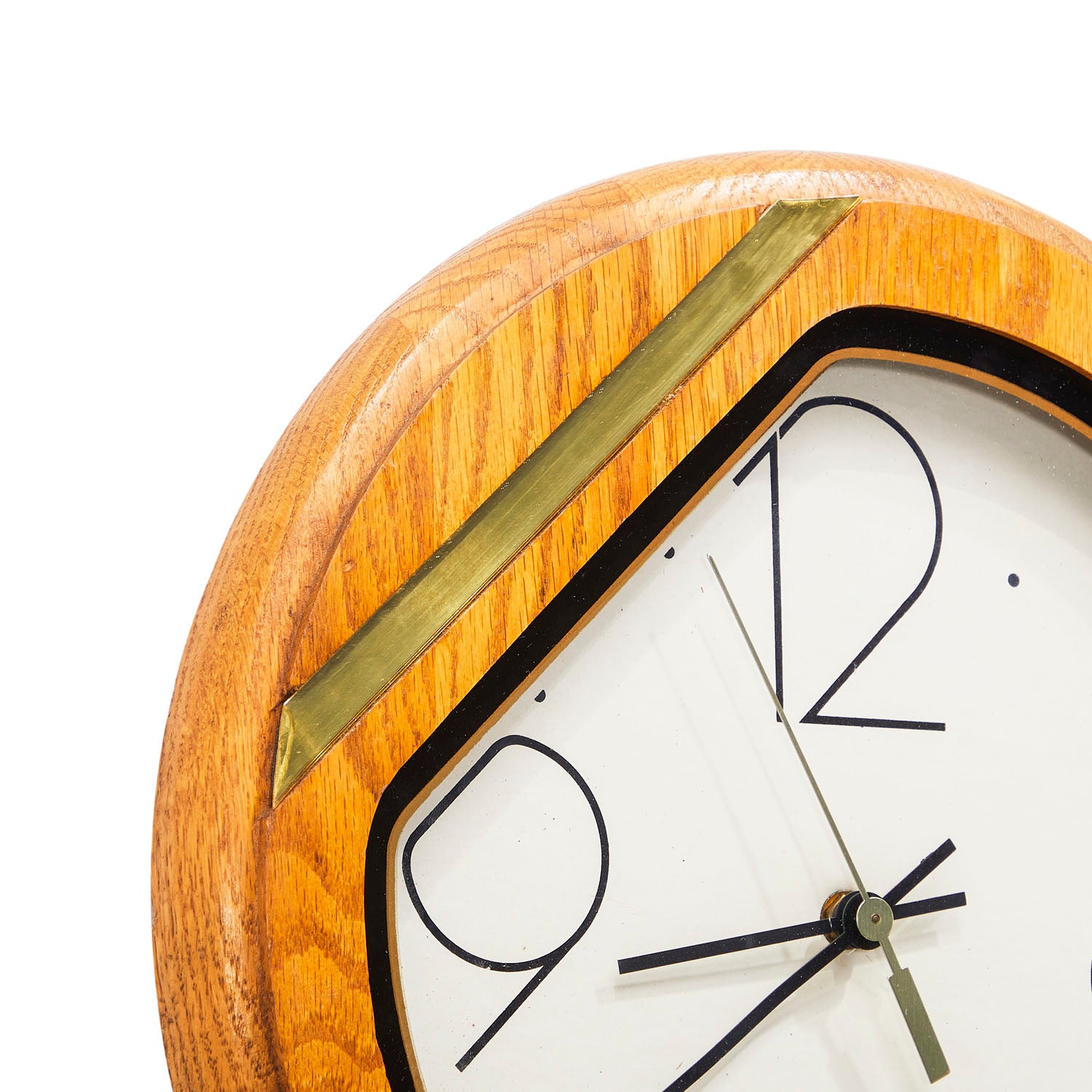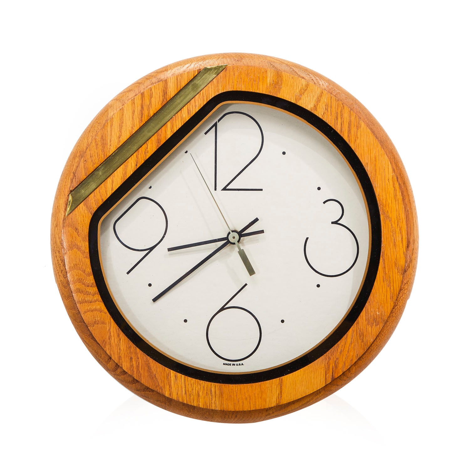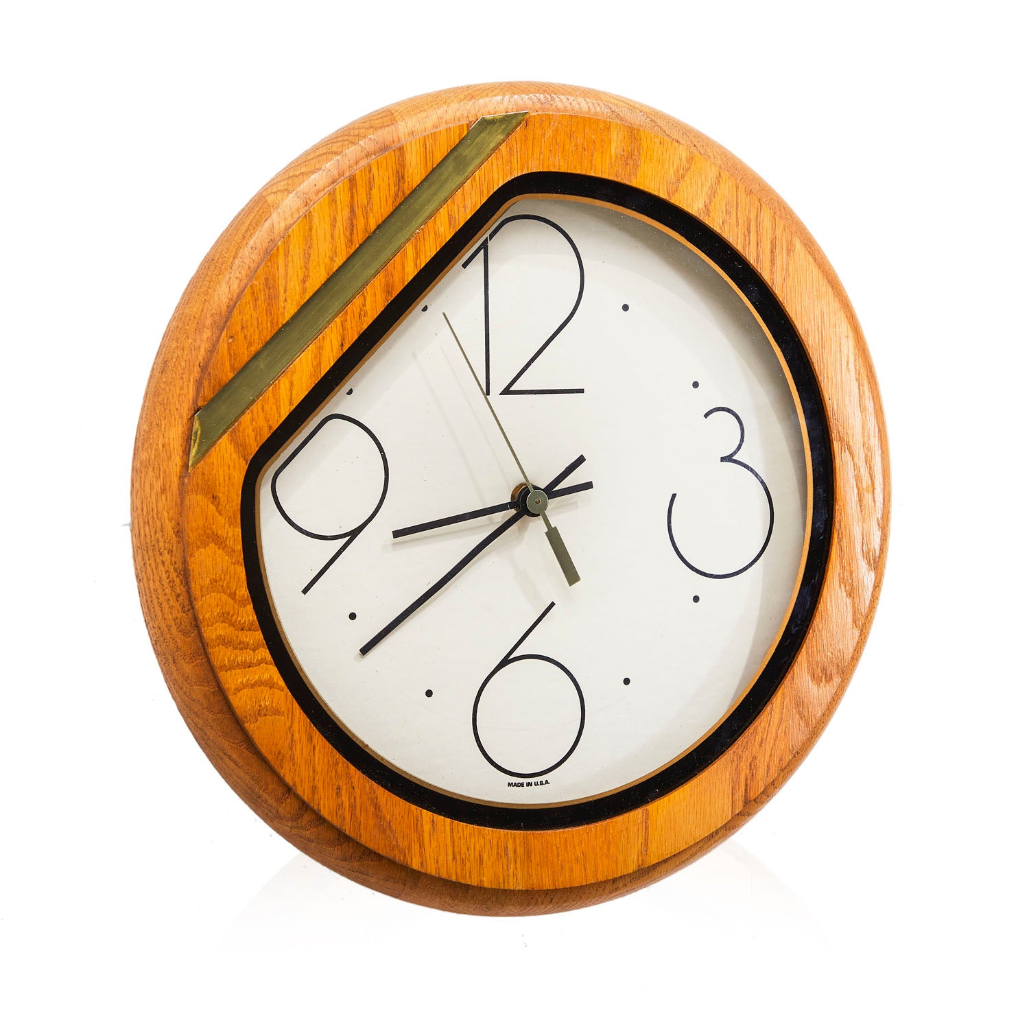 Details: Round wooden wall clock with oversized numbers and brass stripe detail on corner Dimensions: 13" H x 13" W x 1.5" D