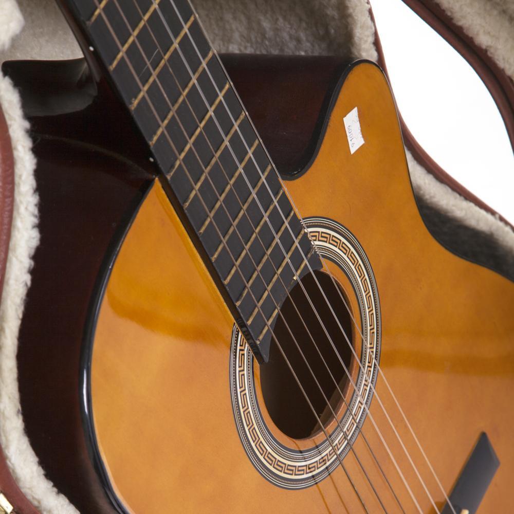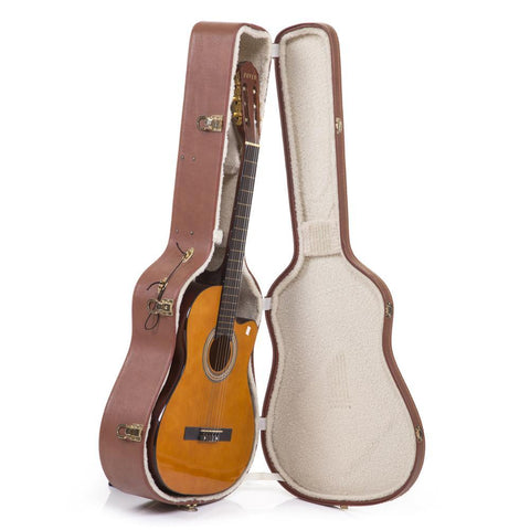 Details: Acoustic fever brand guitar with brown leather case Dimensions: 43" L x 17.5" W x 16.5"