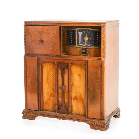 Details: Antique Zenith 'Long Distance' radio and phonograph wooden cabinet console with embedded speaker *DOES NOT WORK* Dimensions: 39" H x 33.5" W x 17" D...