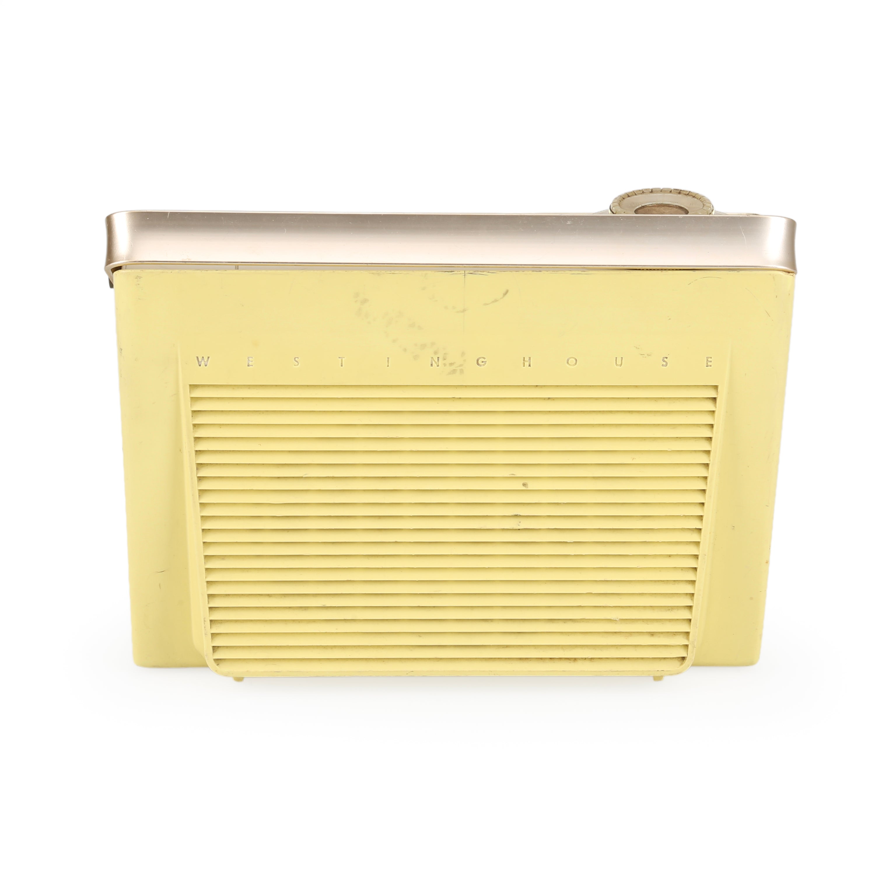 Details: Vintage yellow TV with antenna and knobs. Dimensions: 11" H x 15" W x 12" *NOT WORKING*