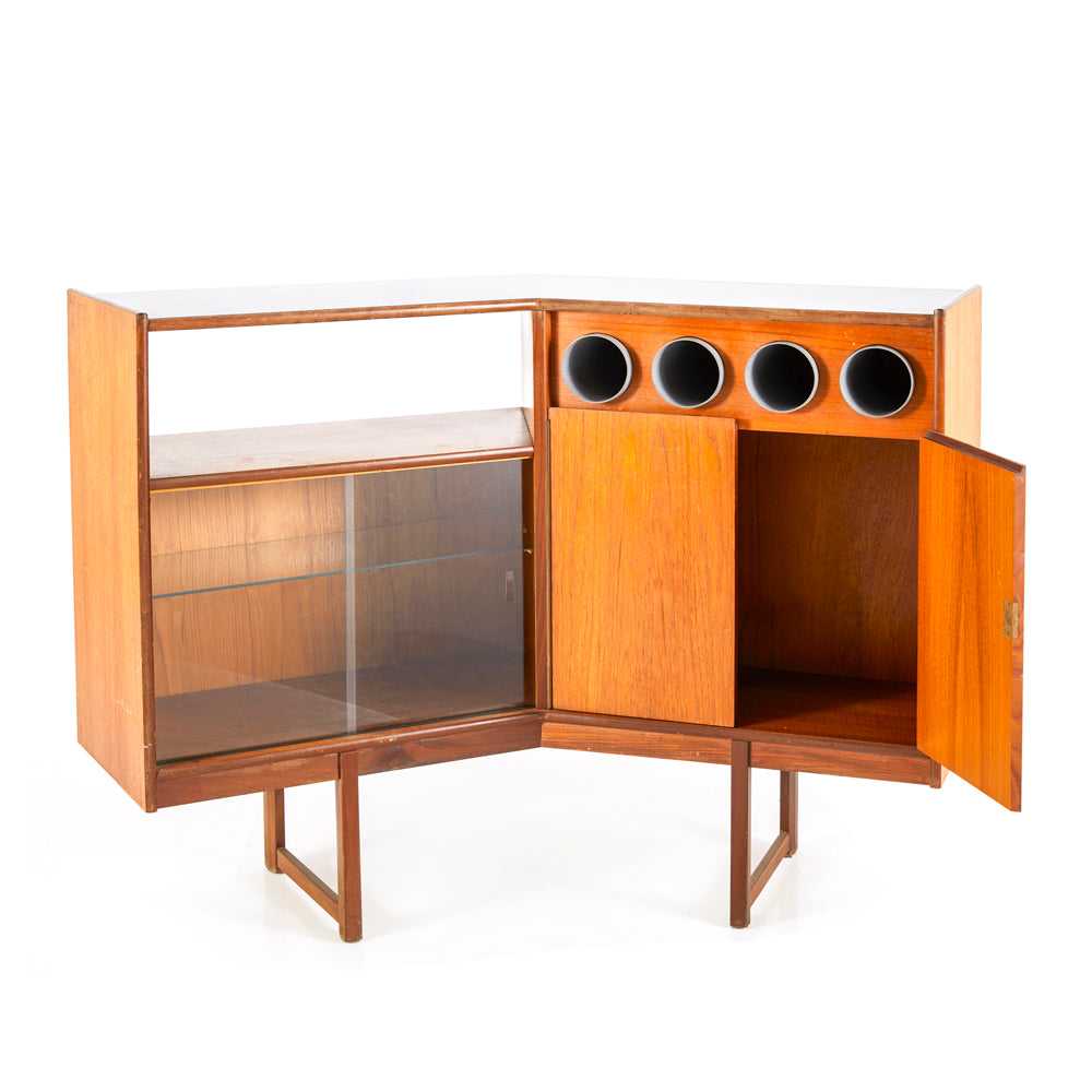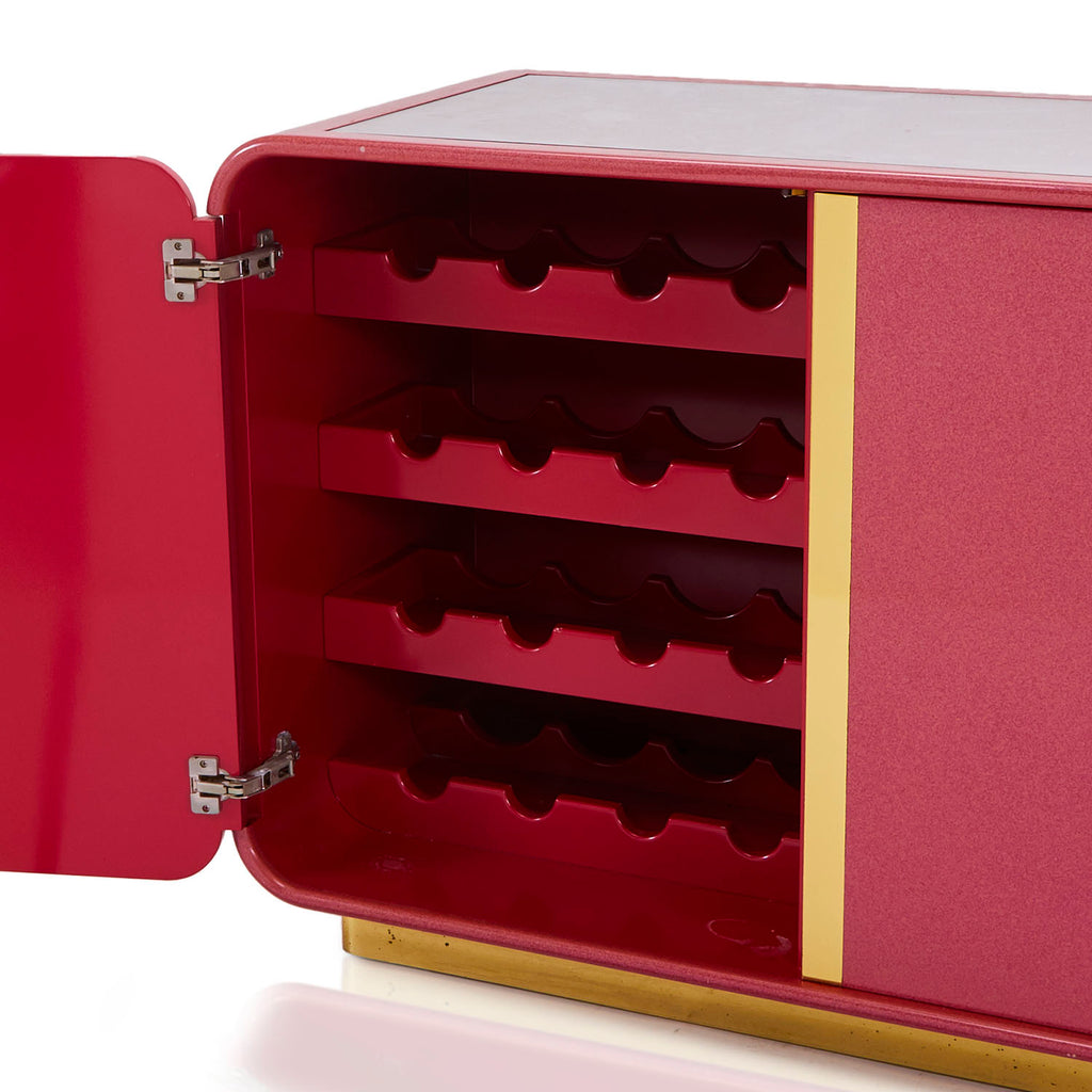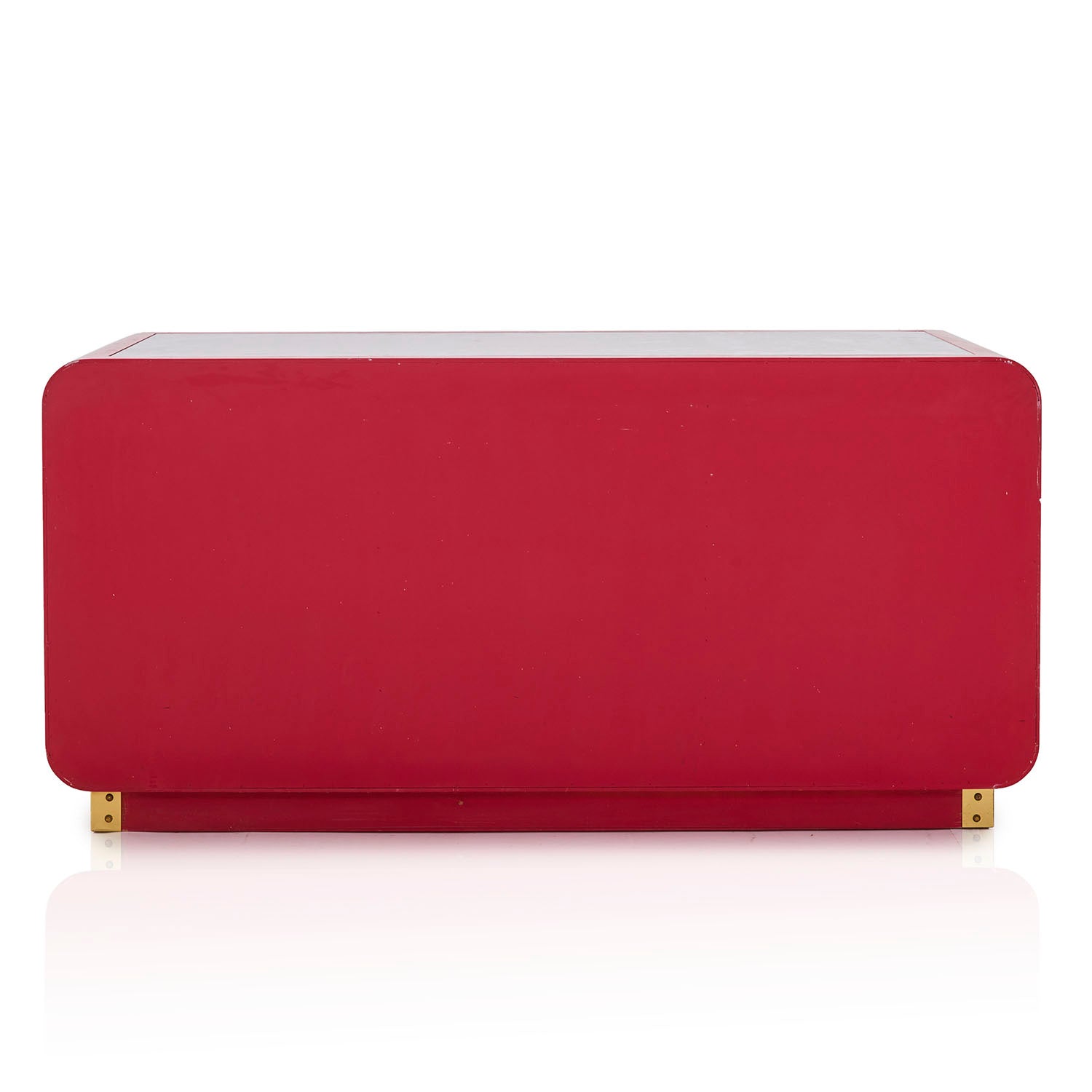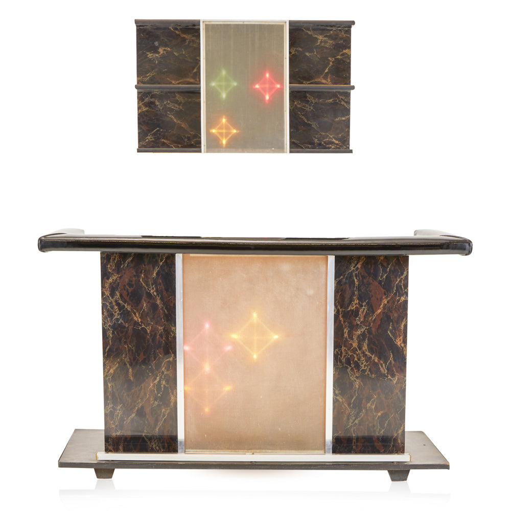 Details: Wood vintage television stand with TV removed, replaced with lit bottle display area, with velvet shelves, and intricate wallpaper Dimensions: 30" H x 45"...