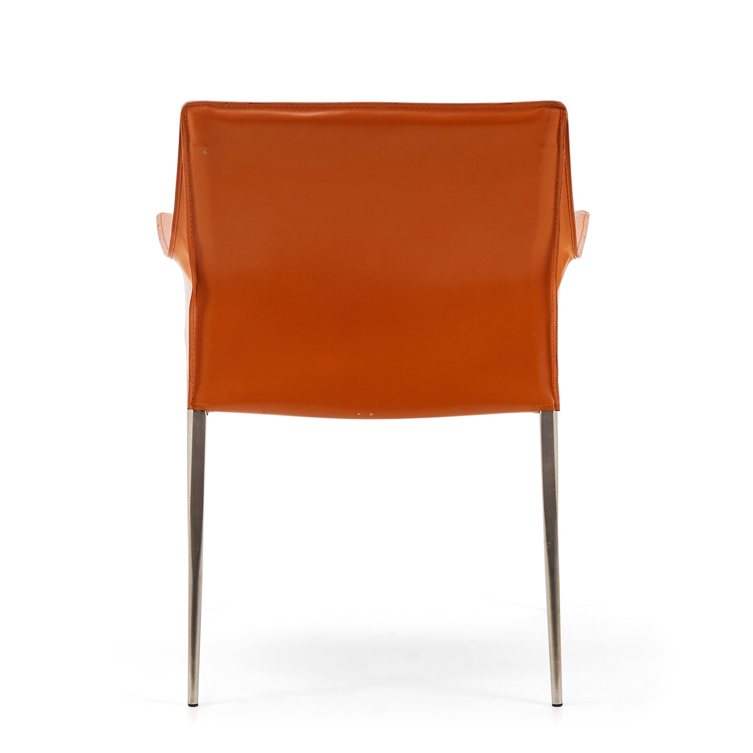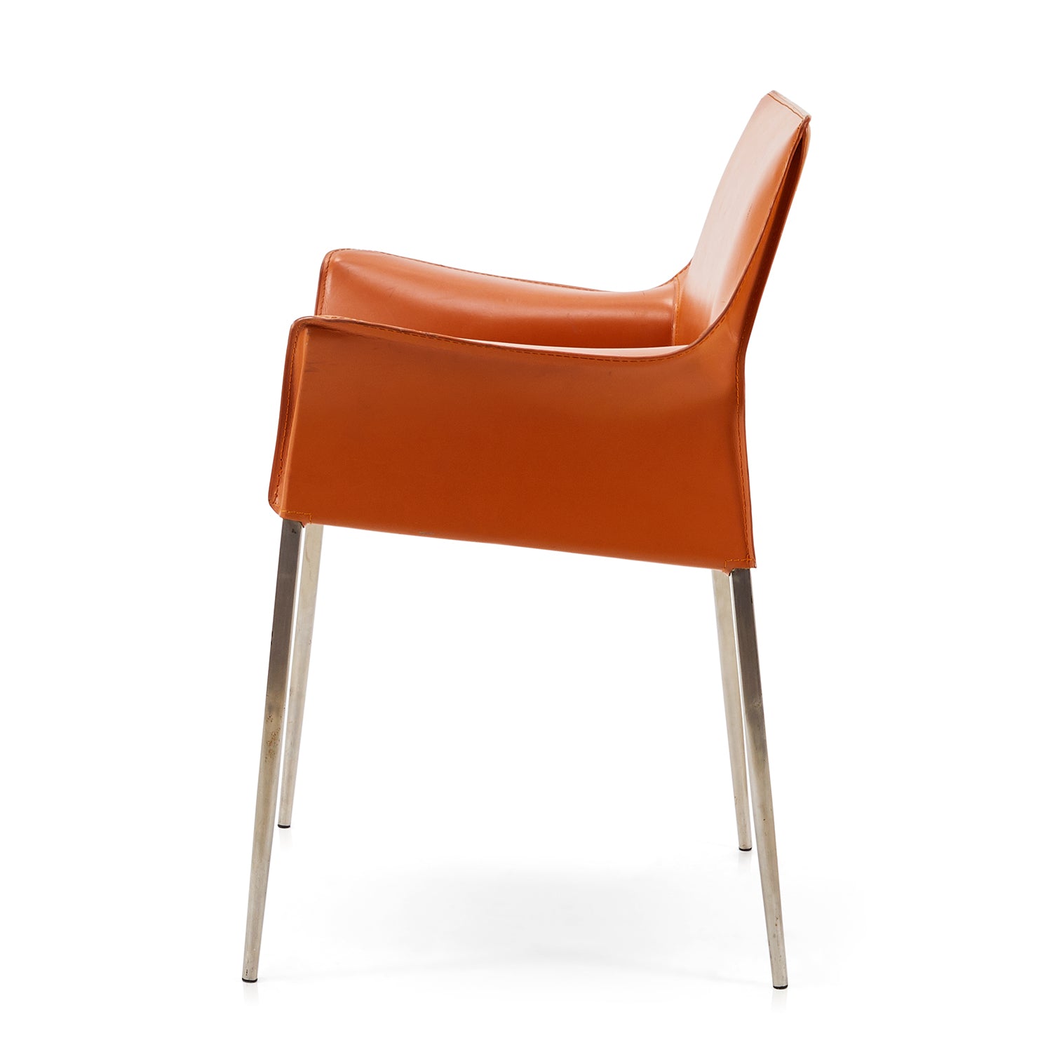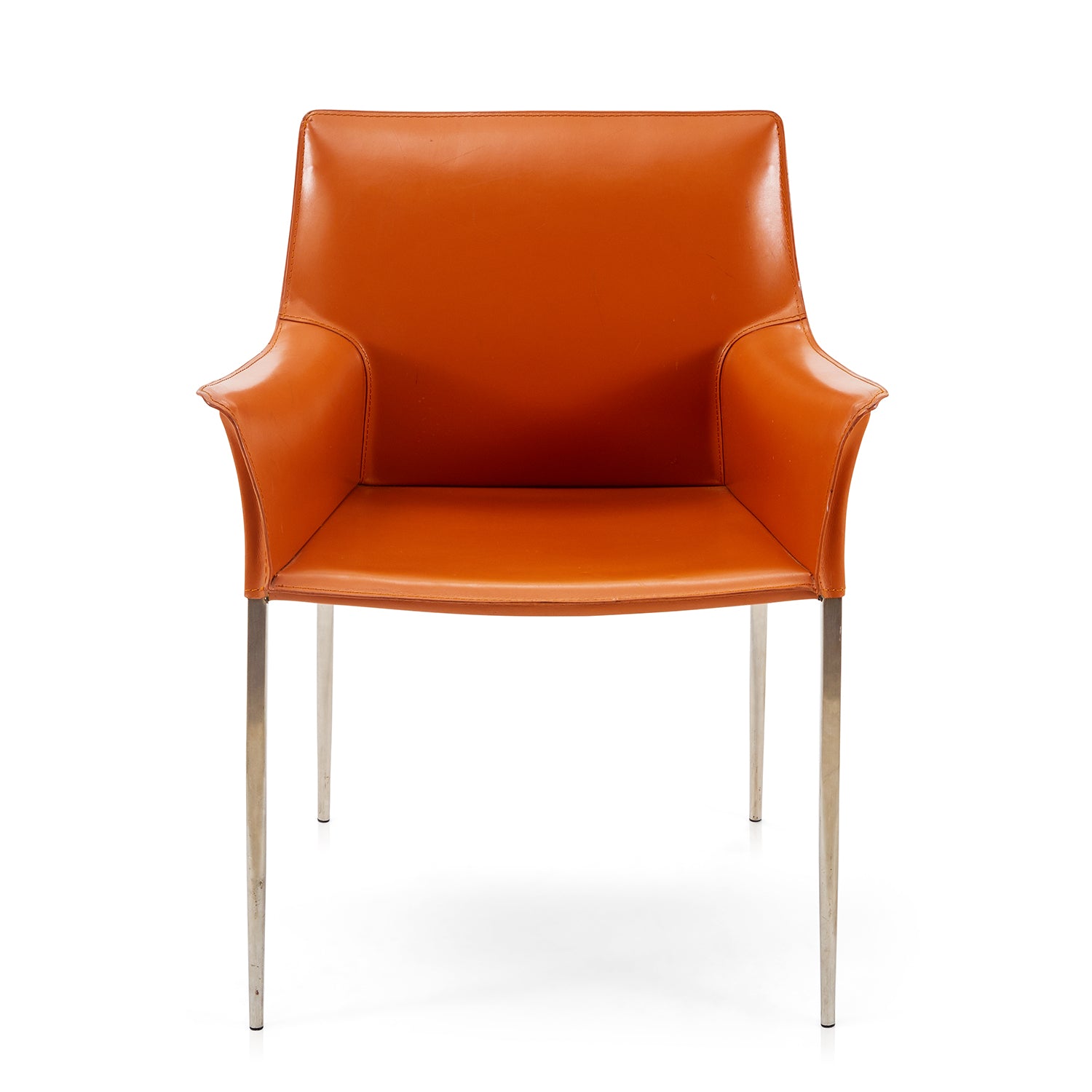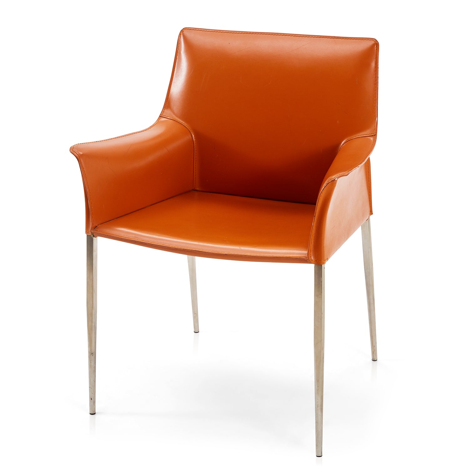 Details: Orange leather side chair with leather seat and arms and aluminum frame Dimensions: 33" H x 26" W x 20.5" D Quantity: 3