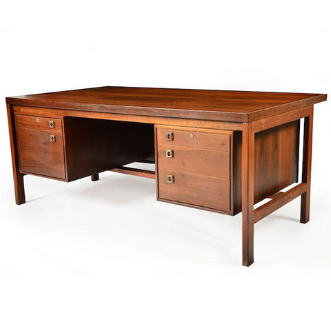 Details: Large wooden desk with "floating" side compartments, brass hardware Dimensions: H x W x D Quantity: 1