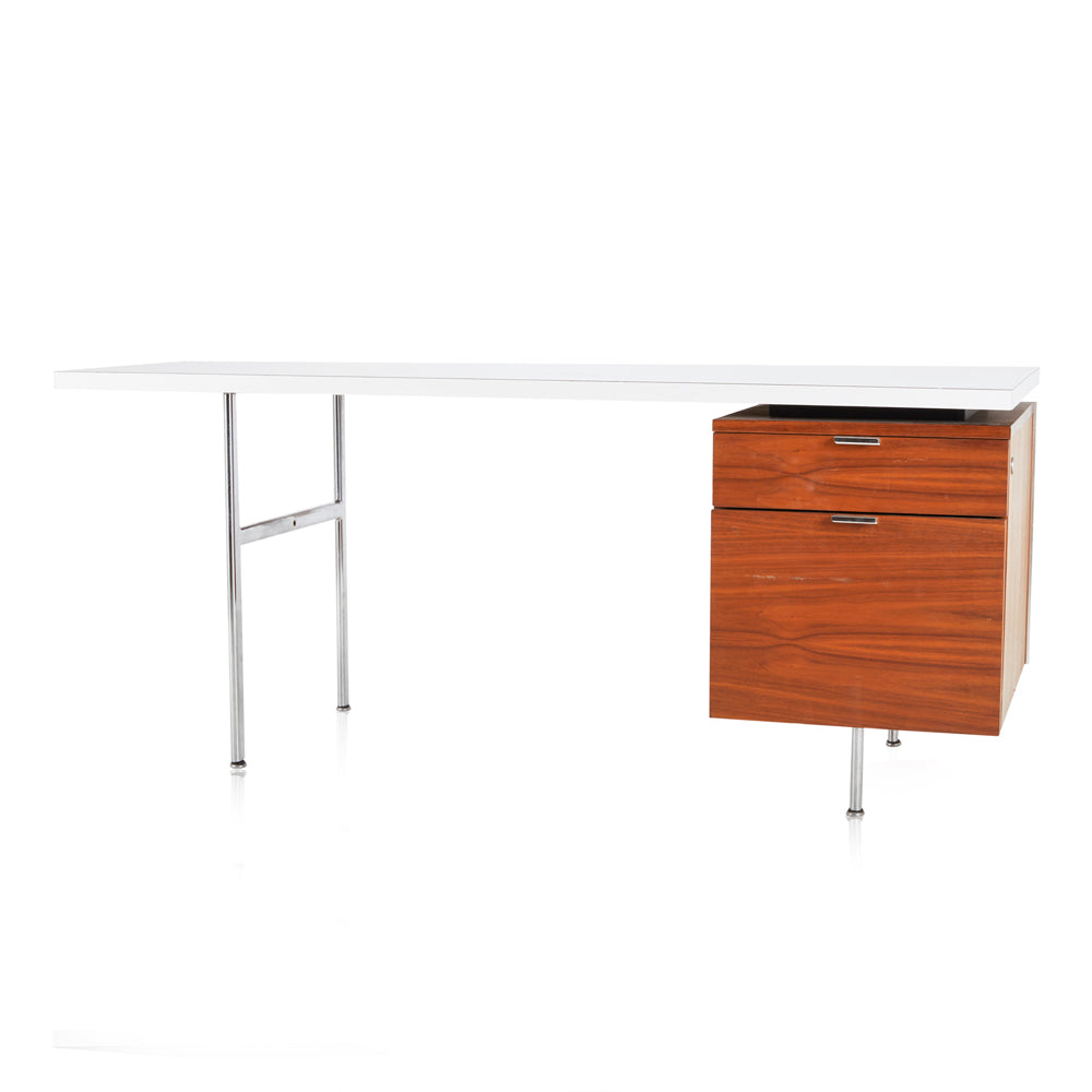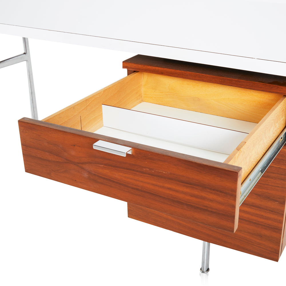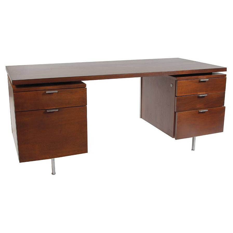 Details: Varnished dark wood George Nelson-style desk with chrome drawer handles and legs Dimensions: 28" H x 65" W x 29.5" D
