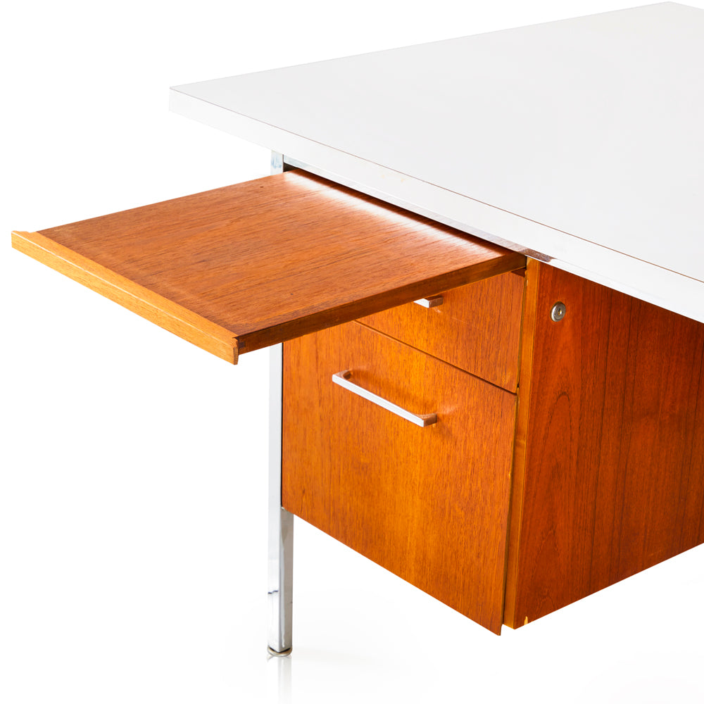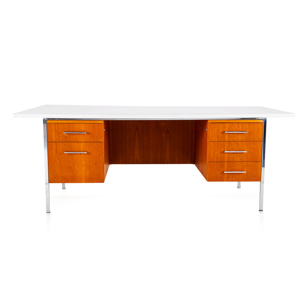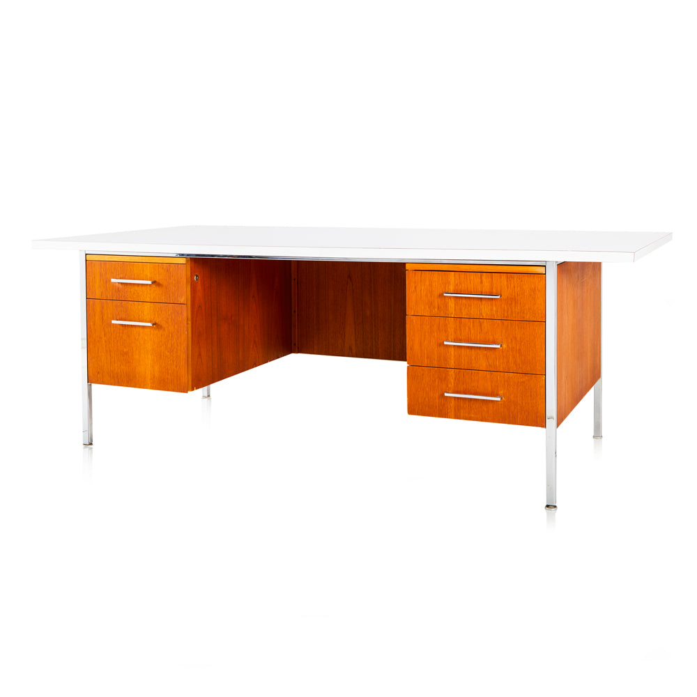 Details: Wood 1950's executive desk with steel frame and white tabletop Dimensions: 28" H x 71" W x 30" D
