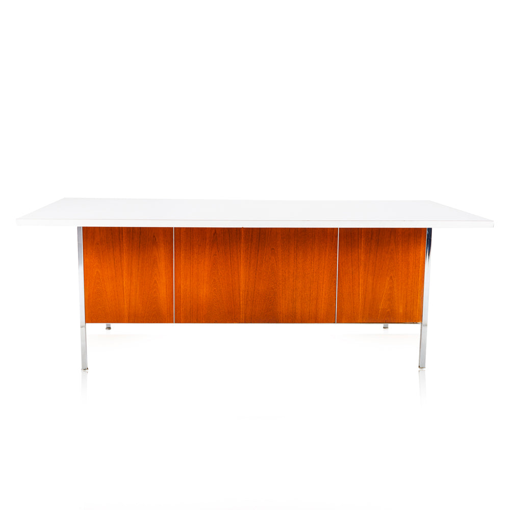 Details: White top mid century modern office desk with chrome frame, handles, and wood body Dimensions: 29" H x 81" W x 38" D