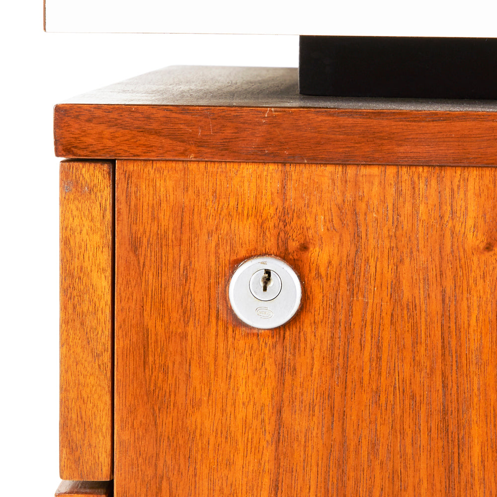 Details: Walnut desk with overhanging rectangular top, multiple drawers, and a locking top cabinet out of four Dimensions: 30" H x 84" W x 36"...