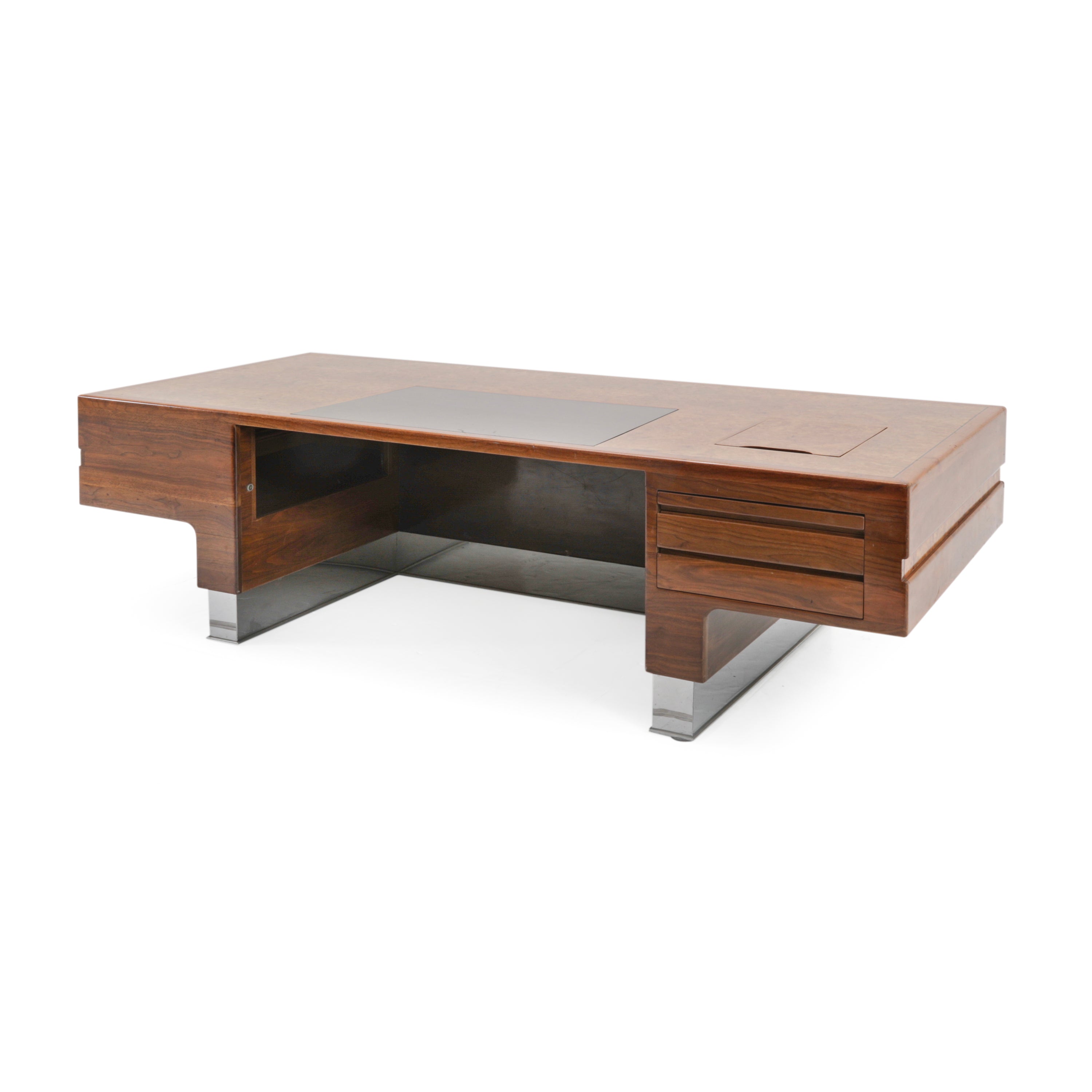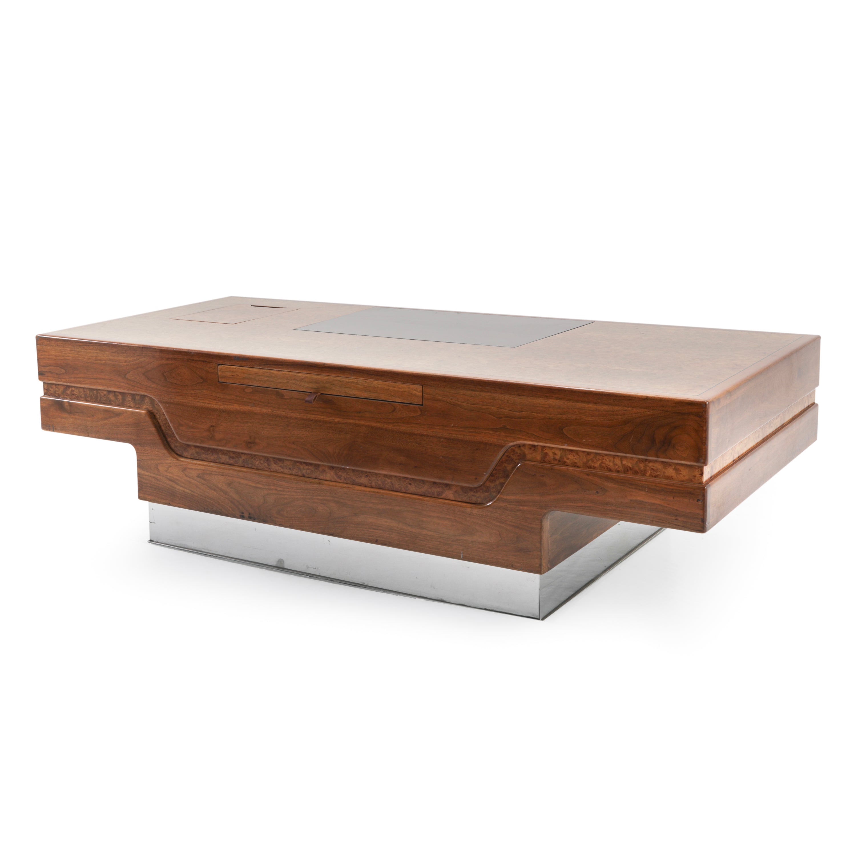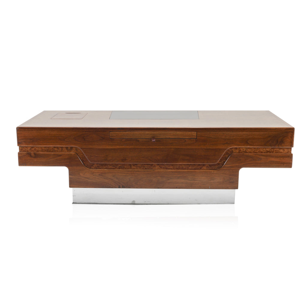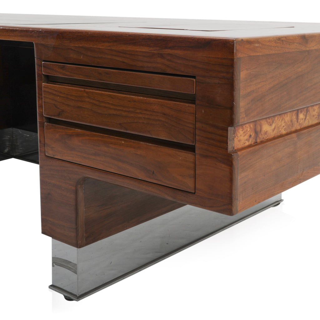 Details: Large wooden Monte Verdi executive desk with recessed drawers and burlwood table top. Chrome base. Part of a set of 3 (priced per piece)....