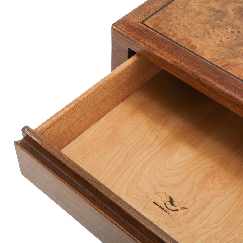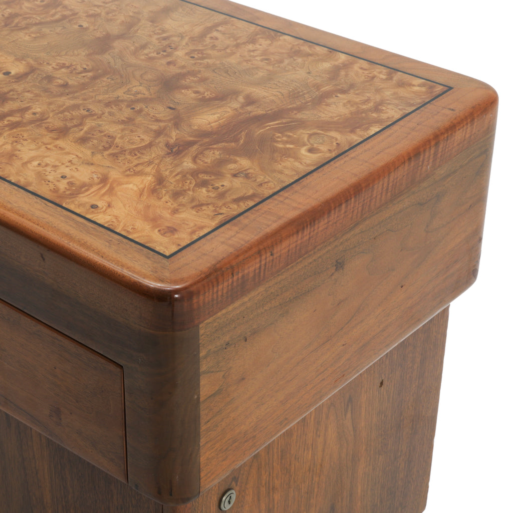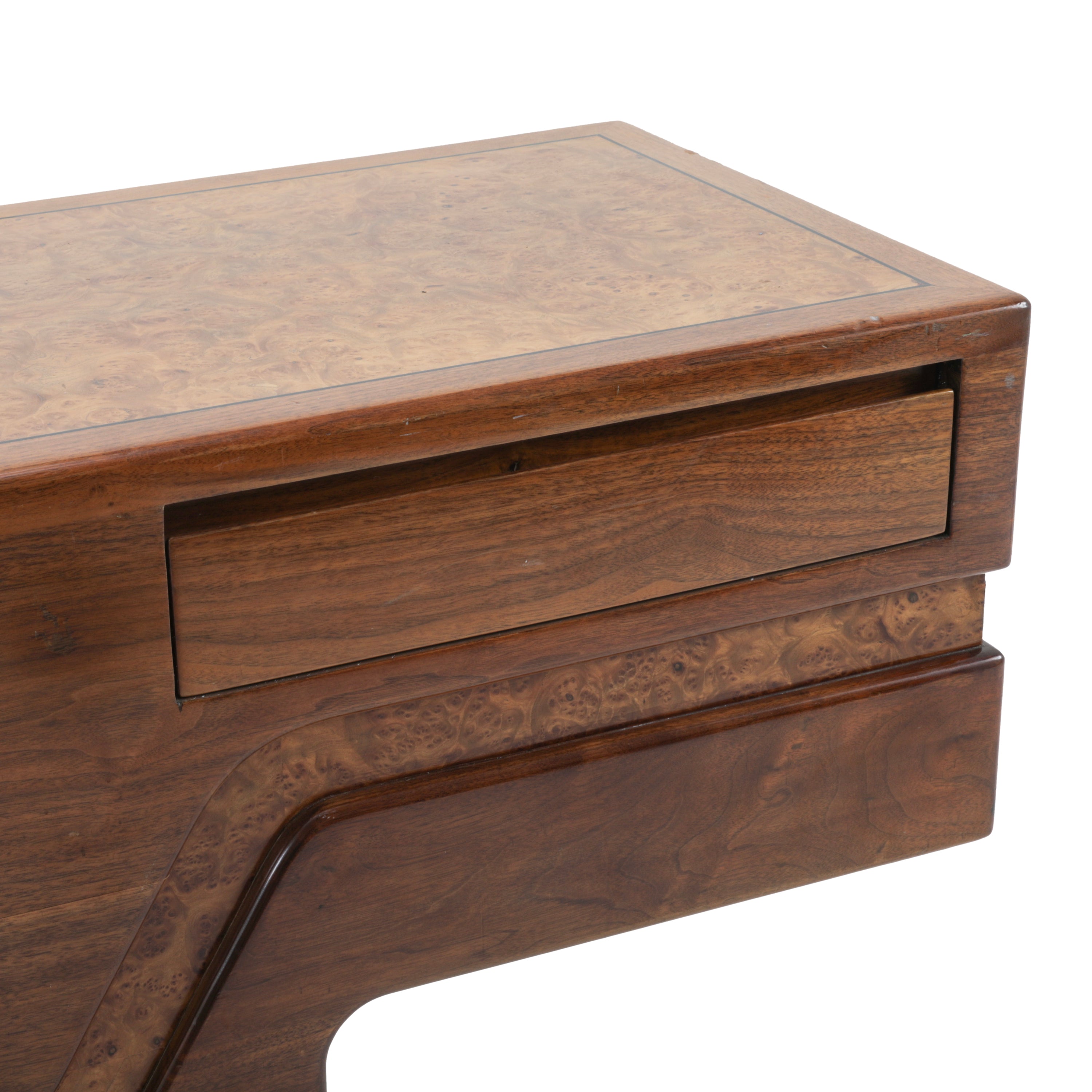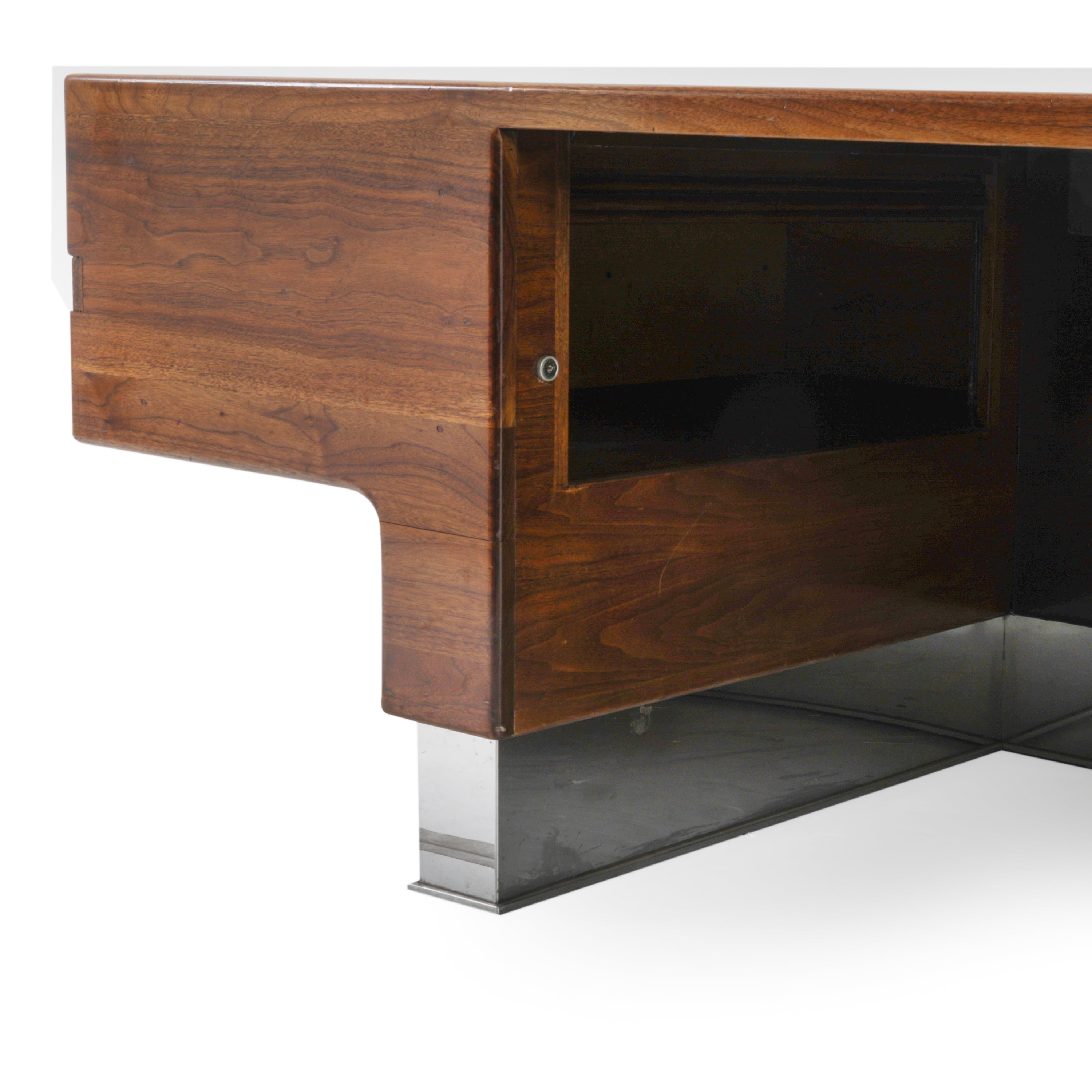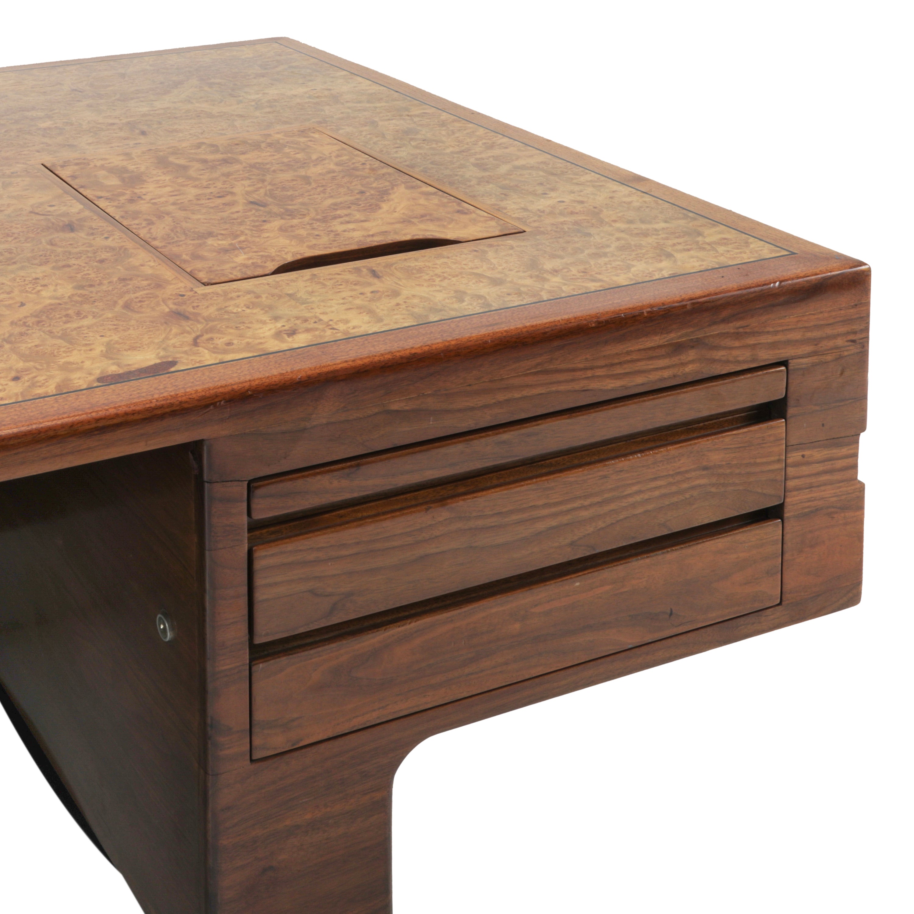 Details: Large wooden Monte Verdi executive desk with recessed drawers and burlwood table top. Chrome base. Part of a set of 3 (priced per piece)....