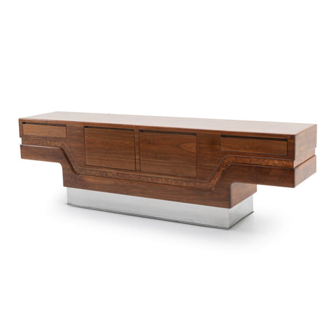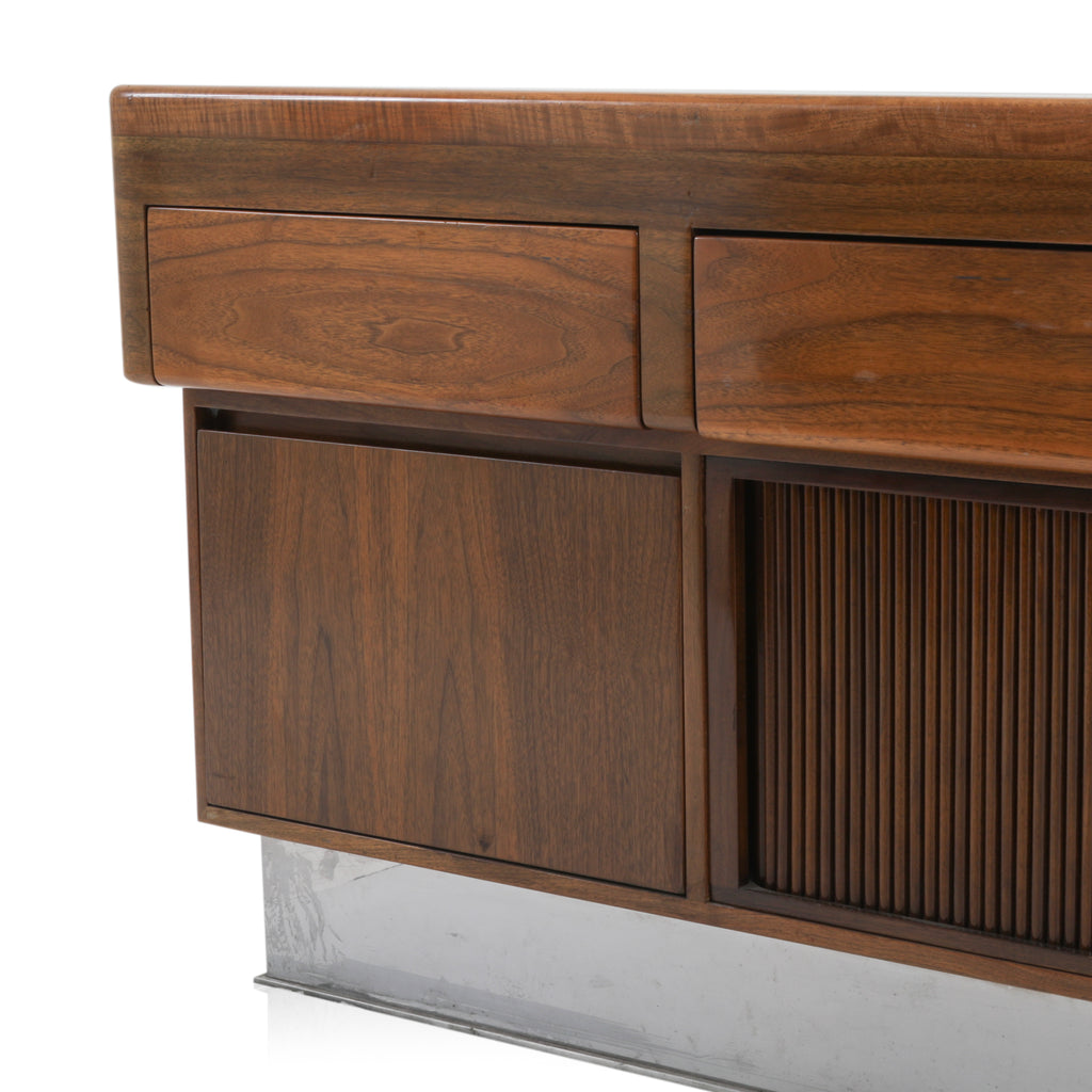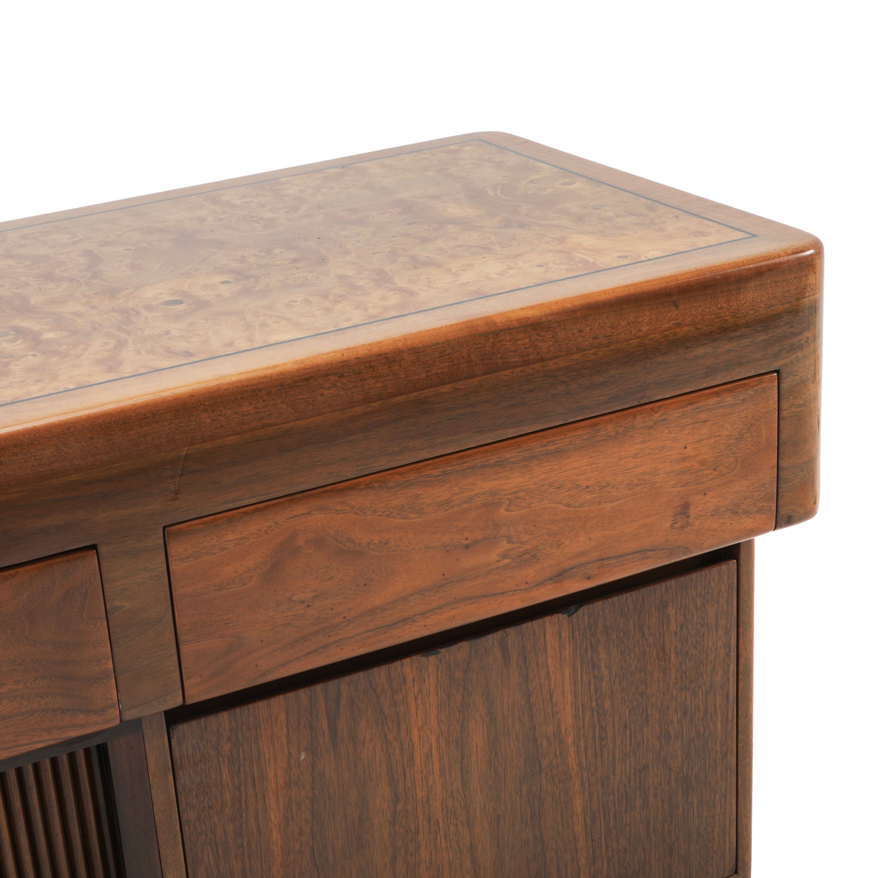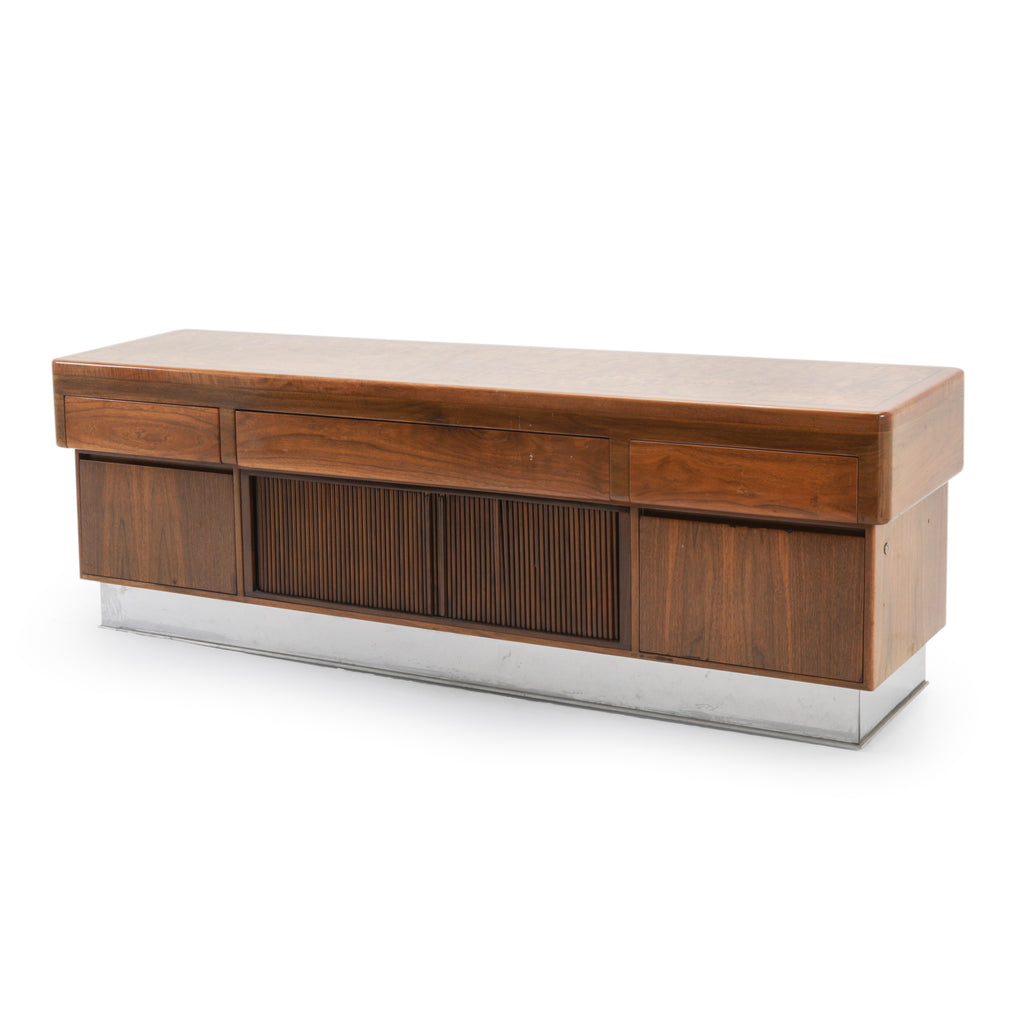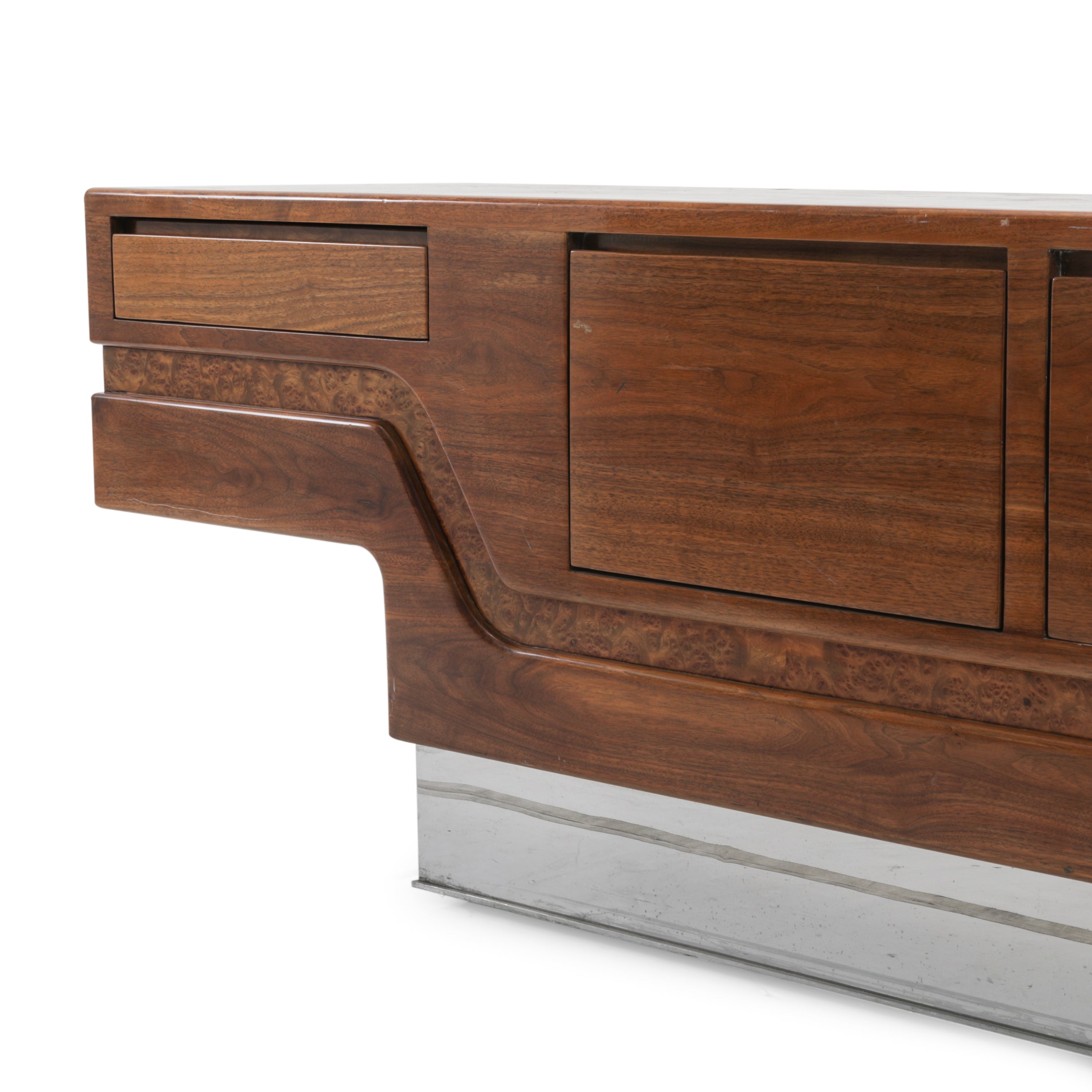 Details: Large wooden Monte Verdi office credenza with rolling accordion doors, recessed drawers, and burlwood table top. Chrome base. Part of a set of 3...