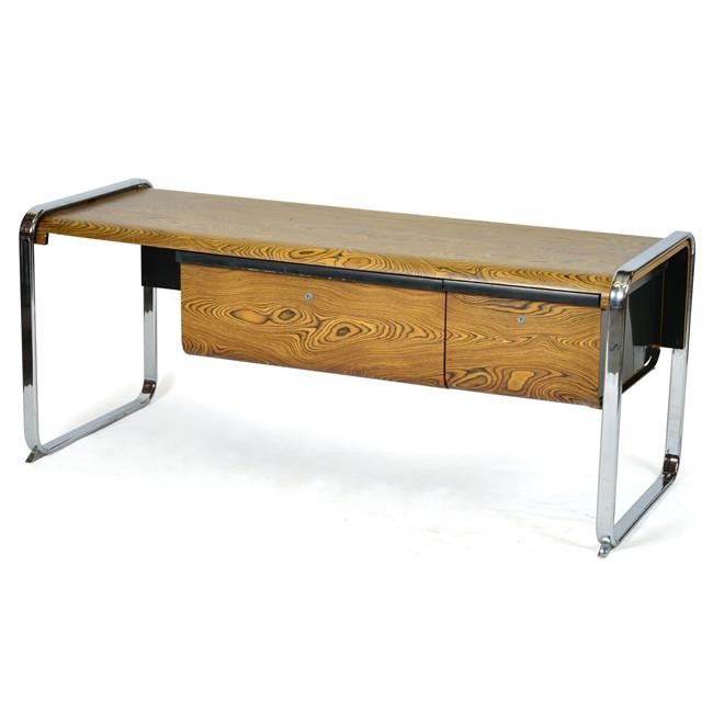 Details: Laminate wood desk with curved chrome frame and cabinets