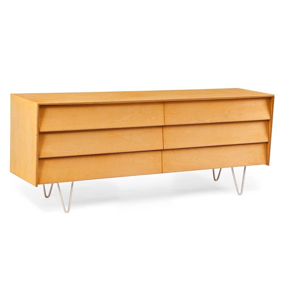 Details: Light natural wood Case Study double-wide dresser with bent metal v-leg legs Dimensions: 29.5" H x 74.25" W x 18" D