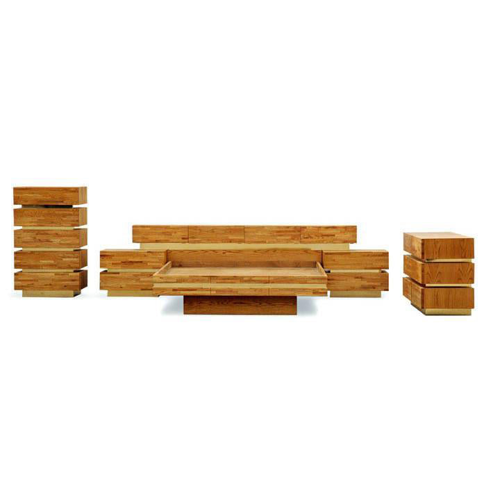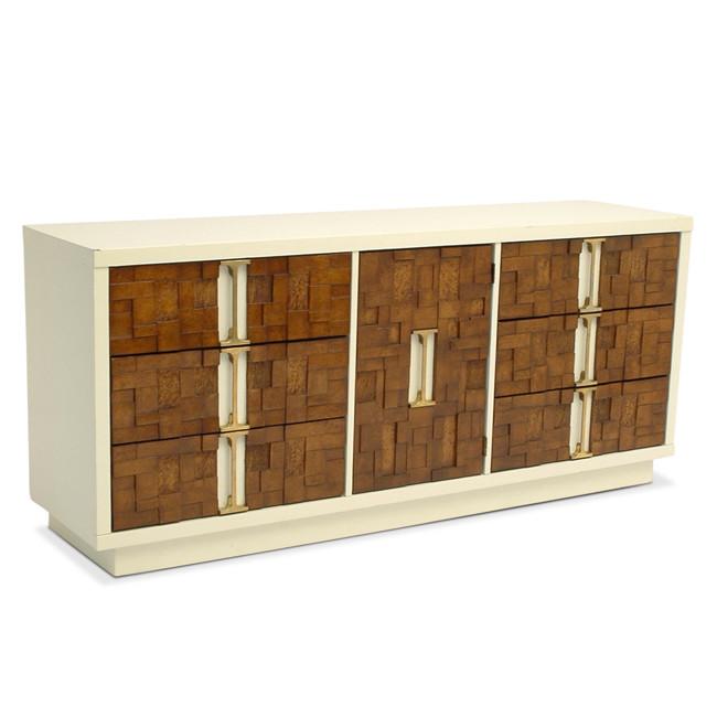 Details: Wood and brass vintage mid-century modern dresser with multi-stained wood paneling, part of a matching set Dimensions: