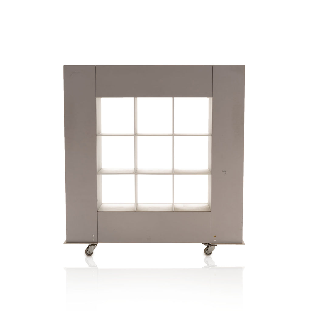 Details: Metal grid-shaped shelving unit on wheels, with cubbies on both sides Dimensions: 72" H x 67" W x 25" D