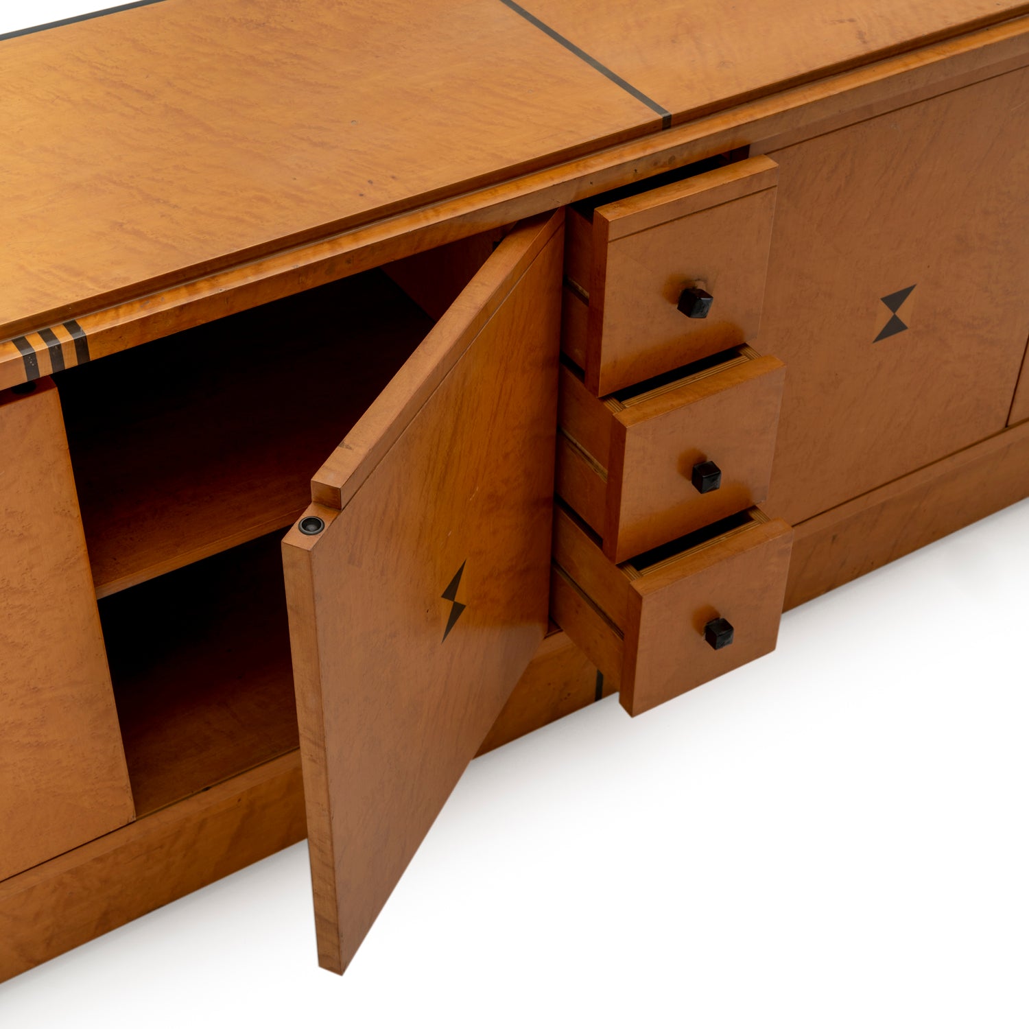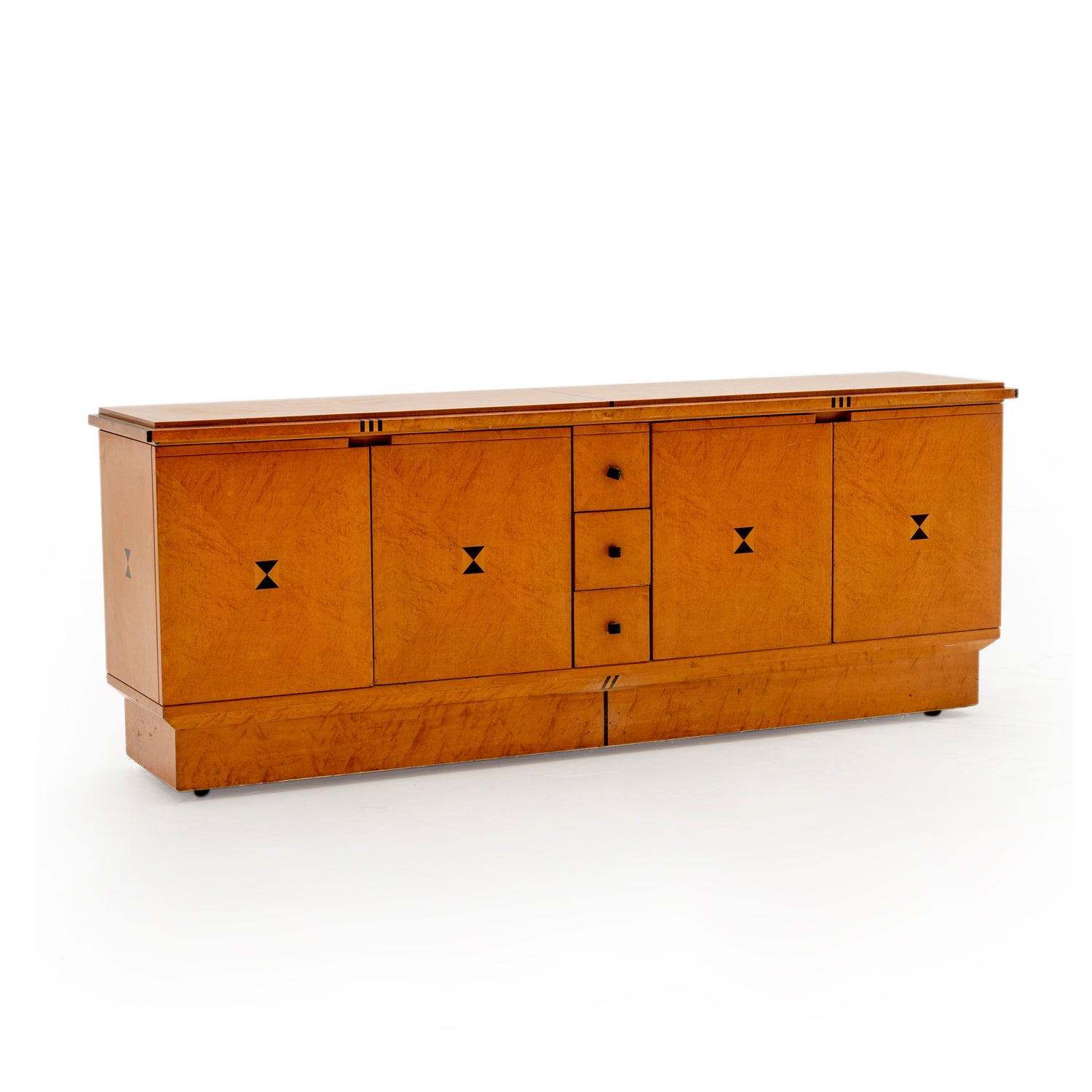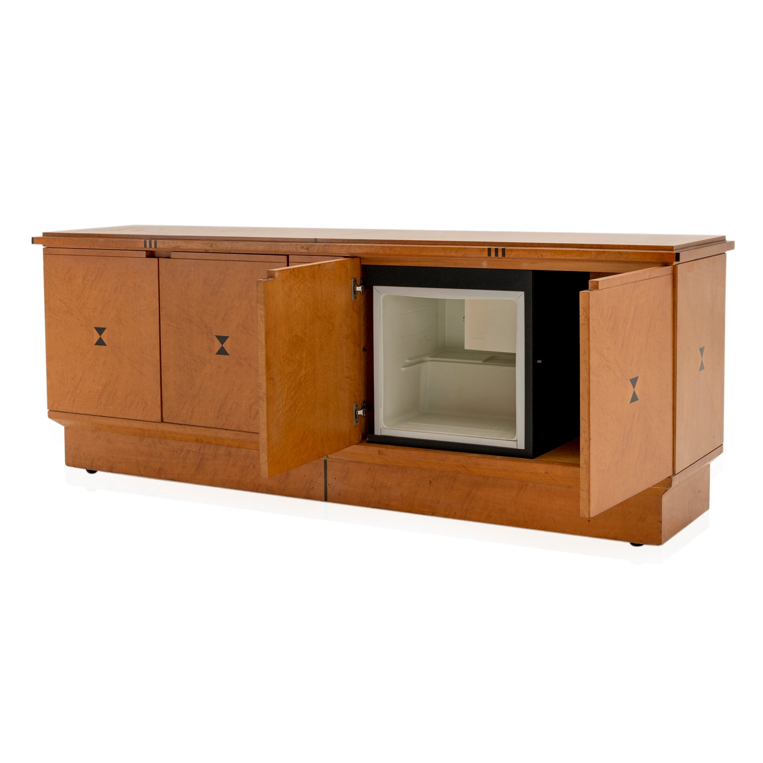 Details: Large wood credenza-bar-combo cabinet with black inlay detailing and small interior mini-fridge Dimensions: 33" H x 86" W x 19" D