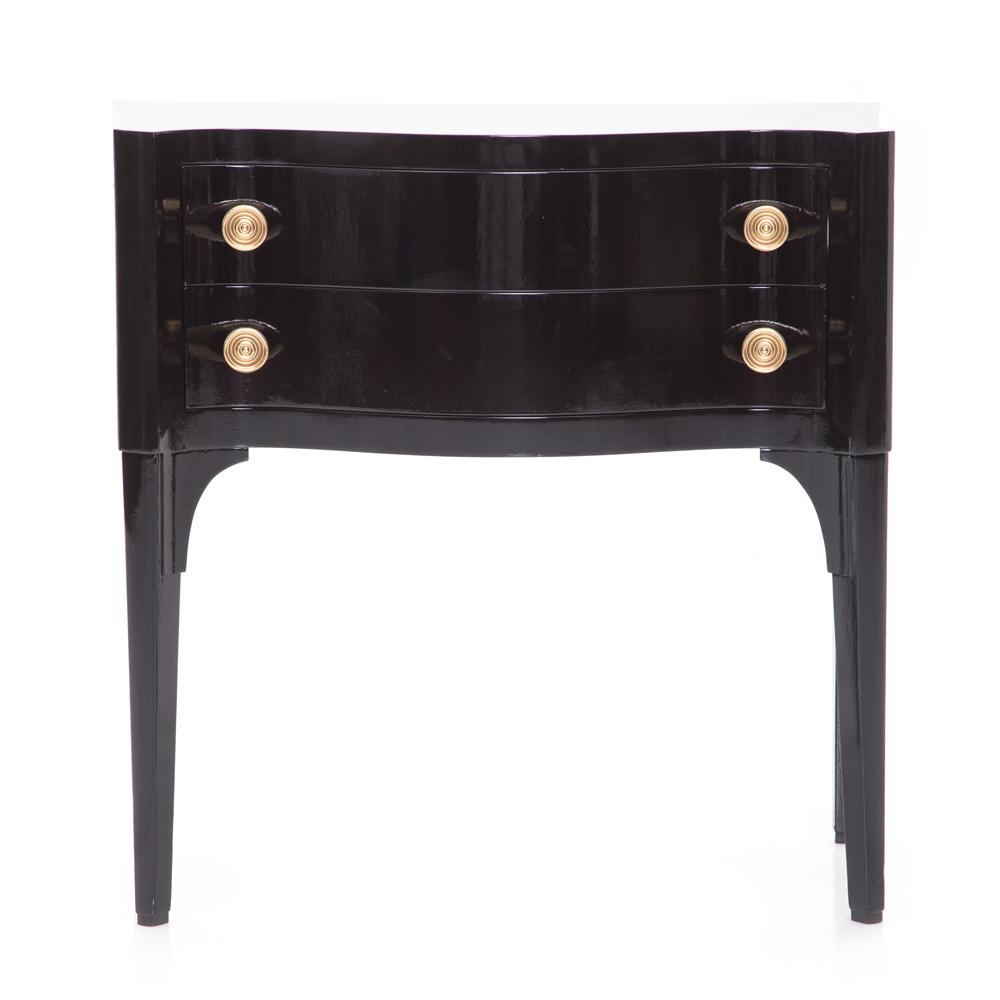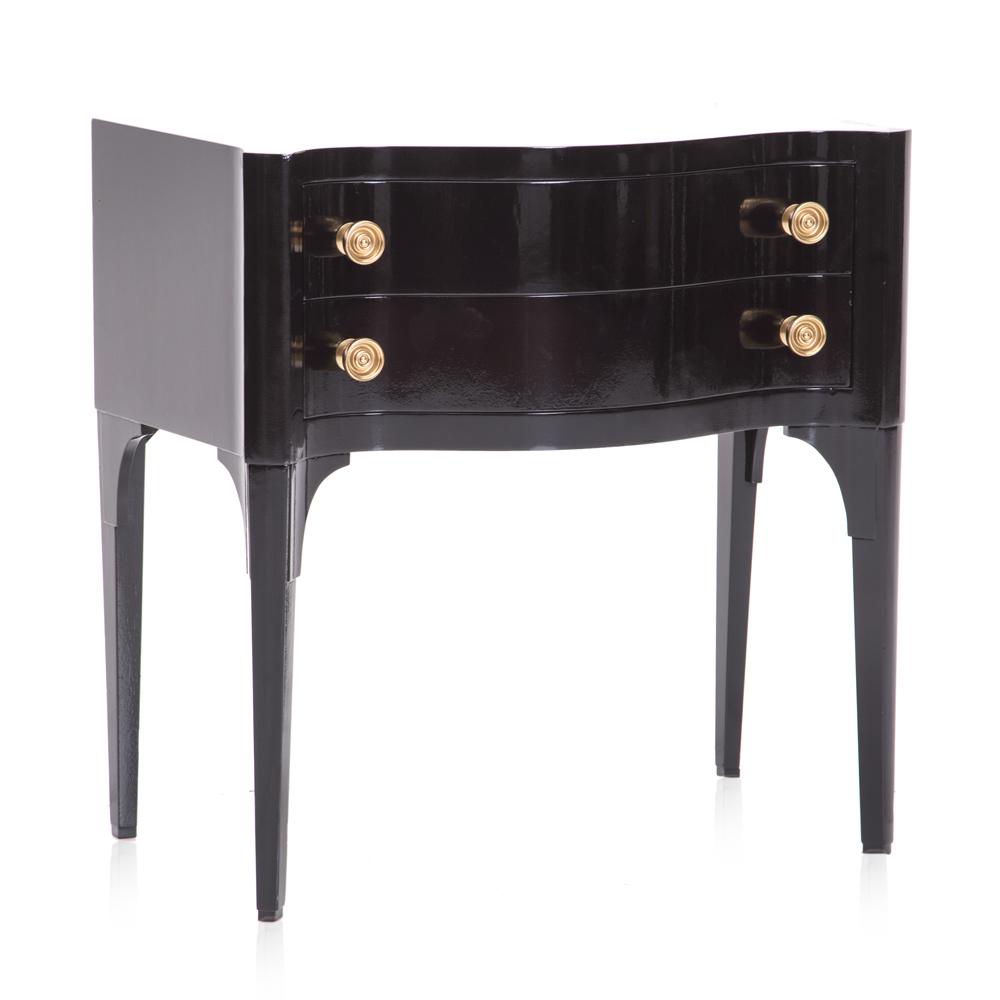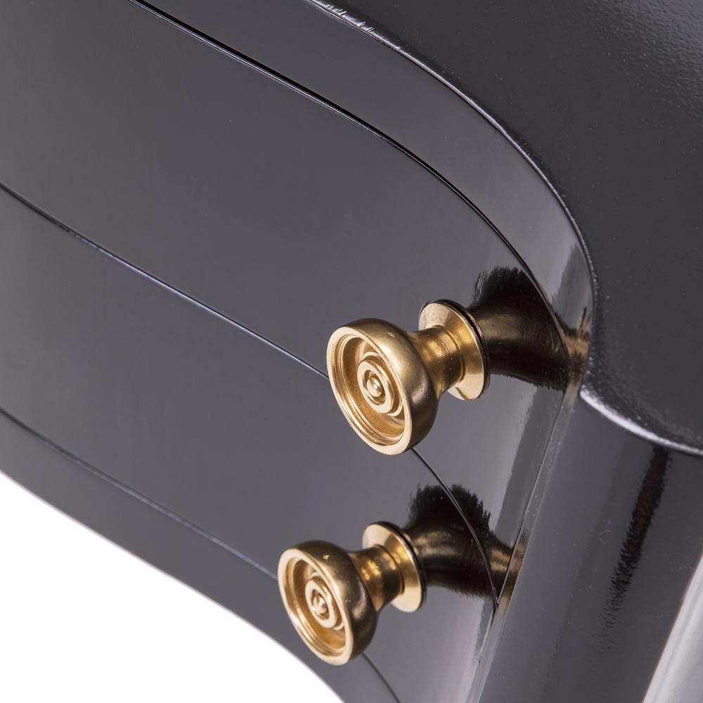 Details: Black small glossy console table with drawers and gold knobs Dimensions: 32" H x 31" W x 17" D