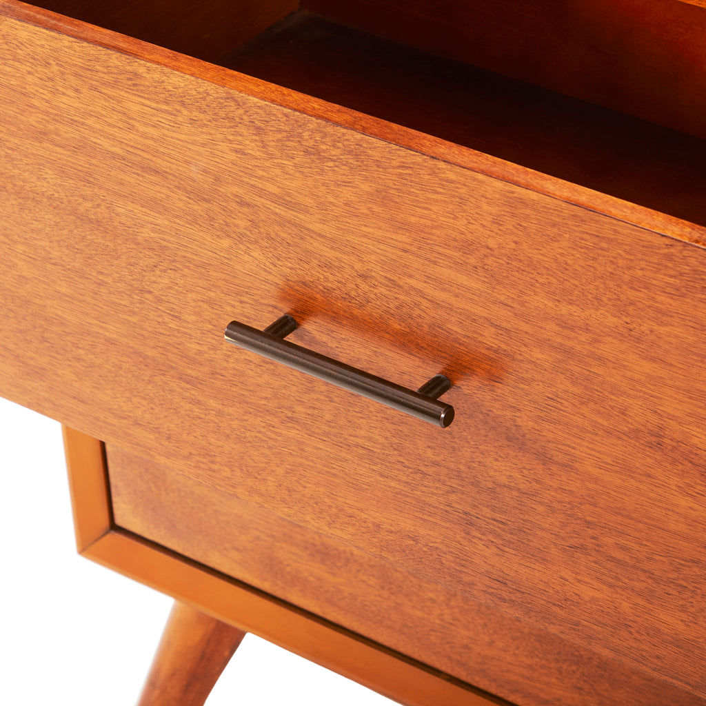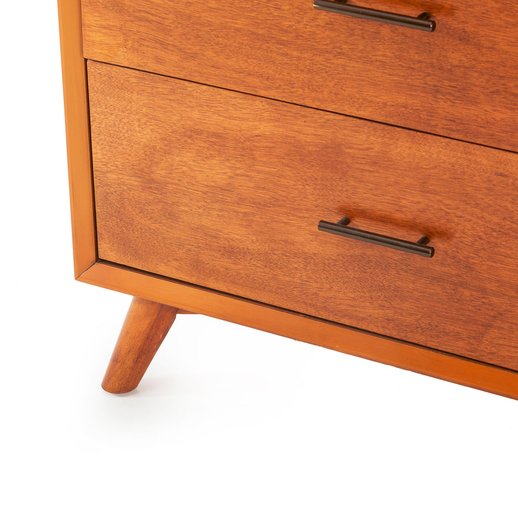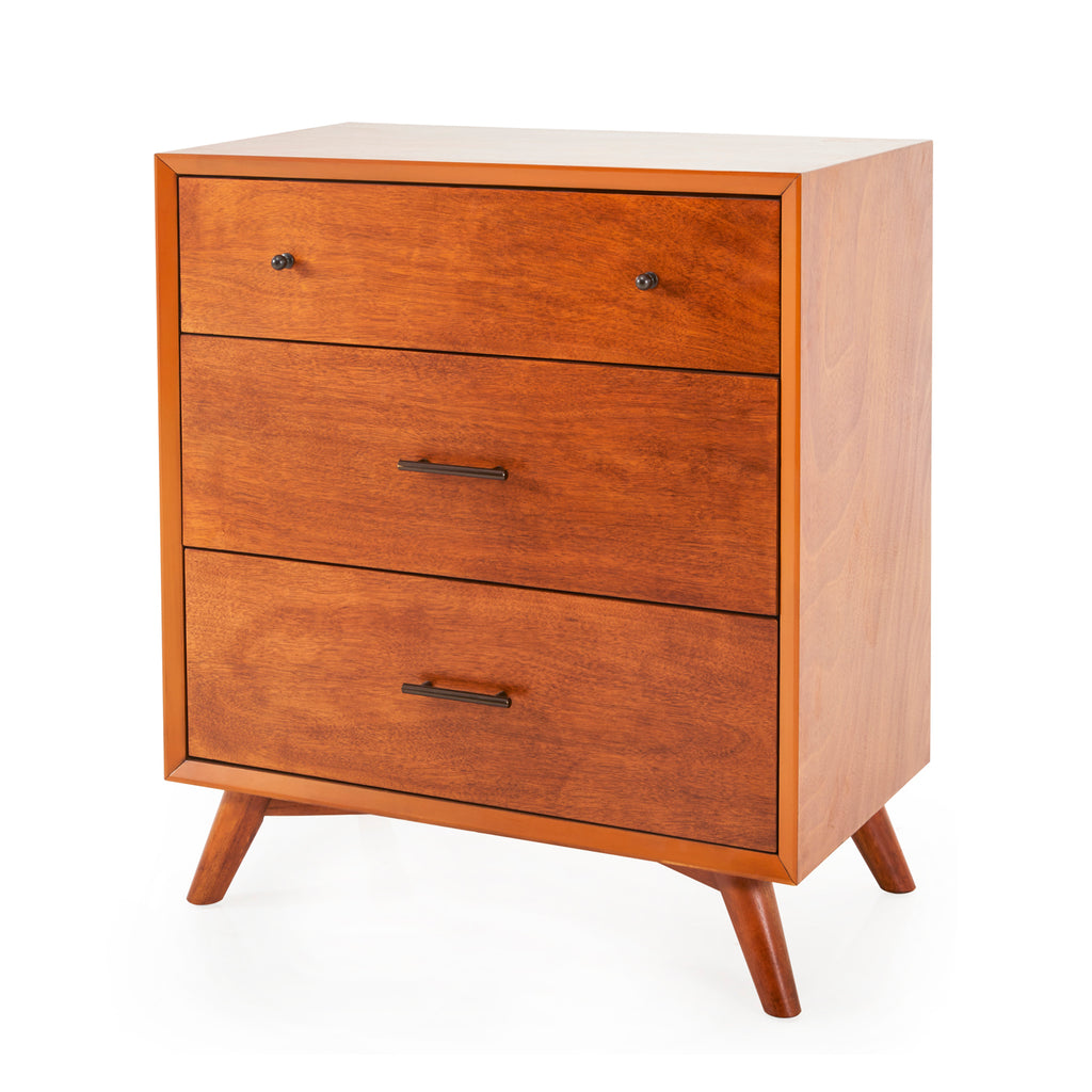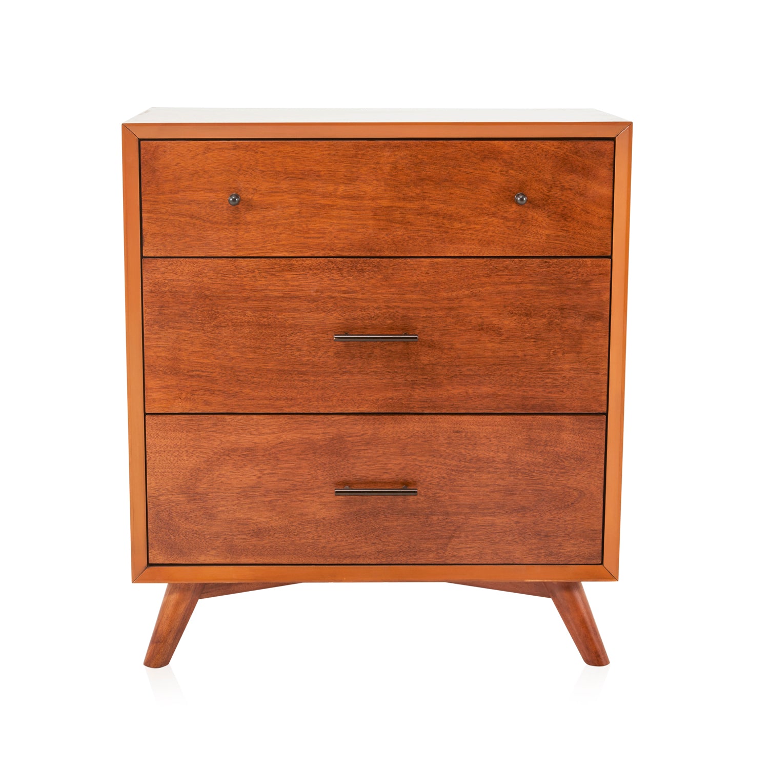 Details: Mid-century modern three-drawer wood dresser with angled wood legs and black modern handles Dimensions: 36" H x 32" W x 18" D