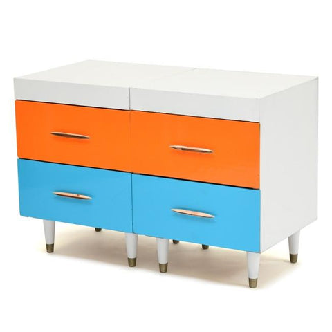 Details: White mod Formica dresser with four blue and orange drawers, with retro-futuristic chrome handles