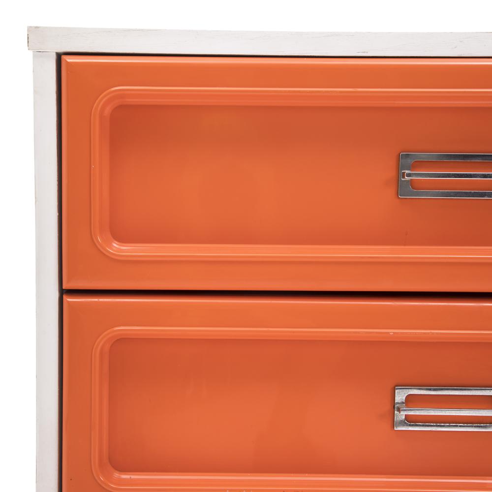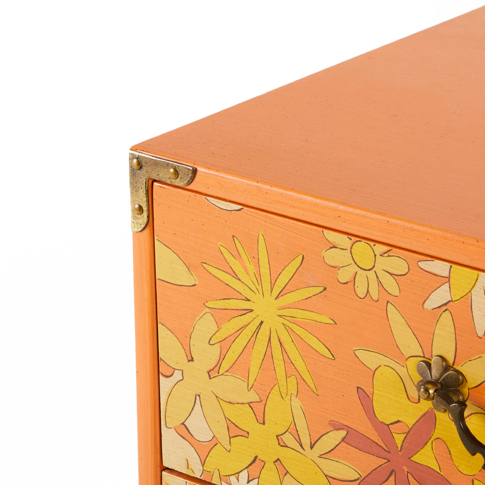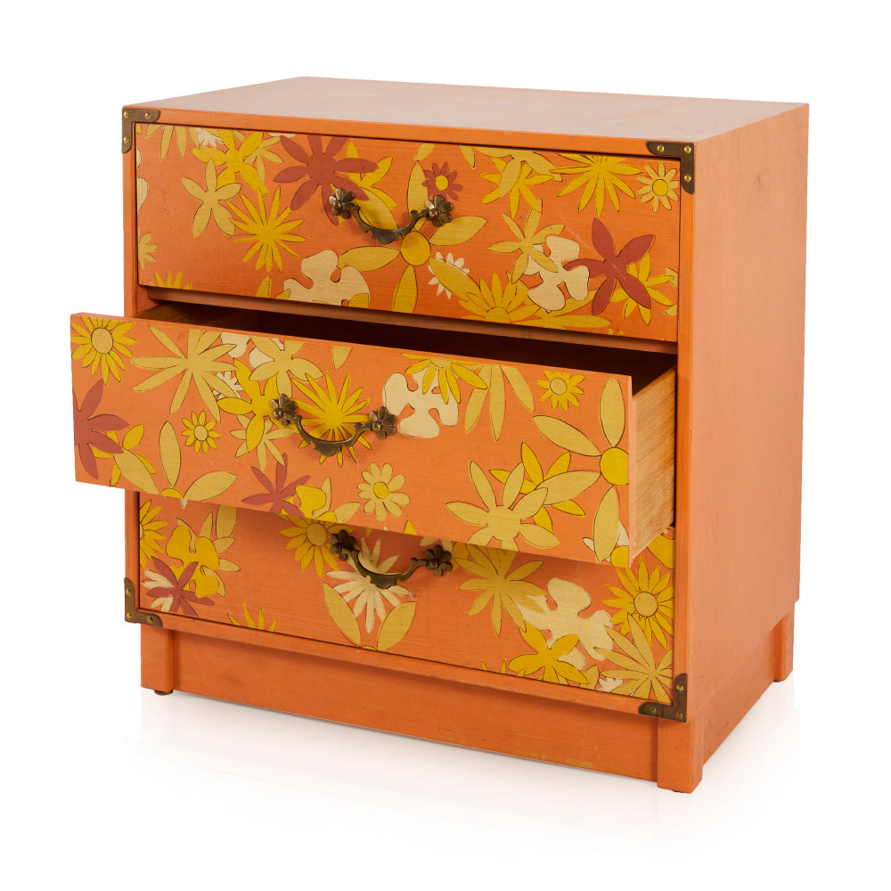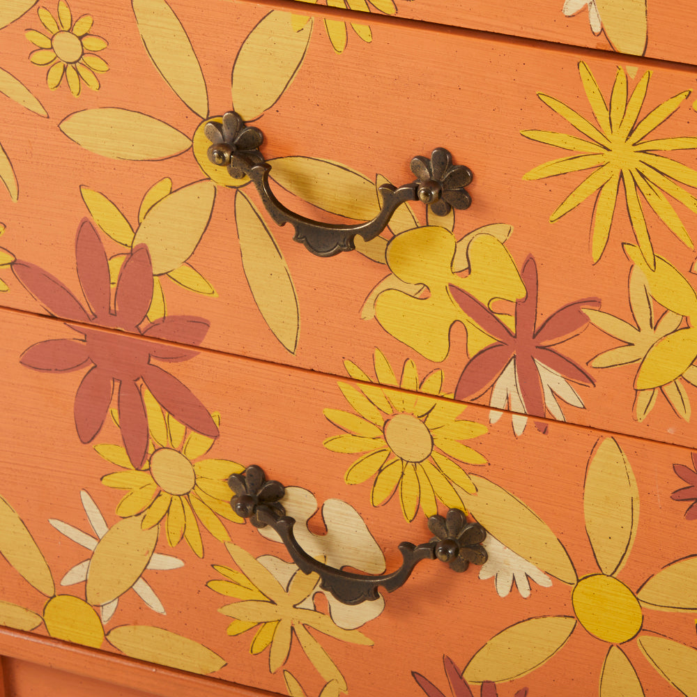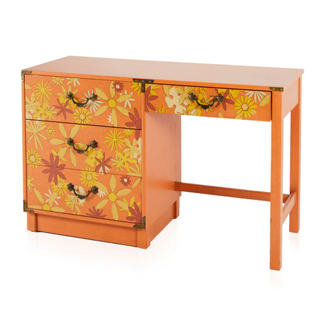 Details: Orange painted wood furniture set, orange, and yellow floral details, with three pieces, small desk and matching three-drawer dressers