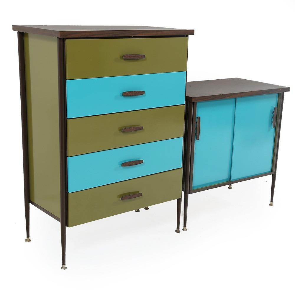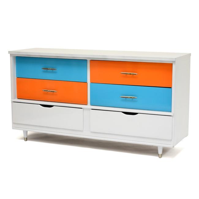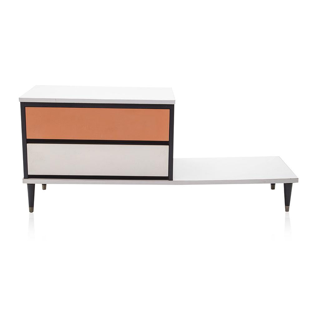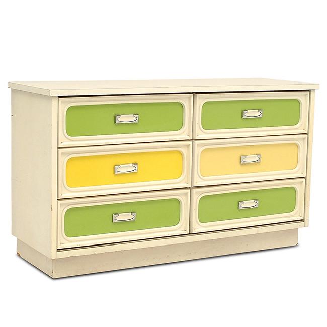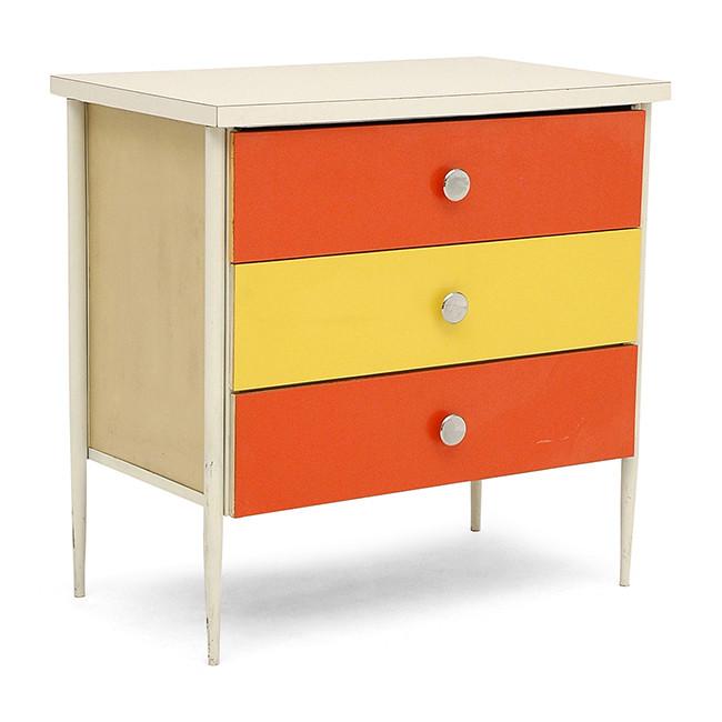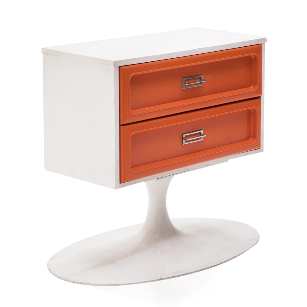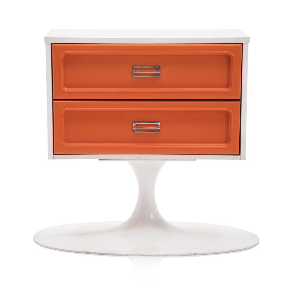 Details: Orange painted wood furniture set, orange, and yellow floral details, with three pieces, small desk and matching three-drawer dressers