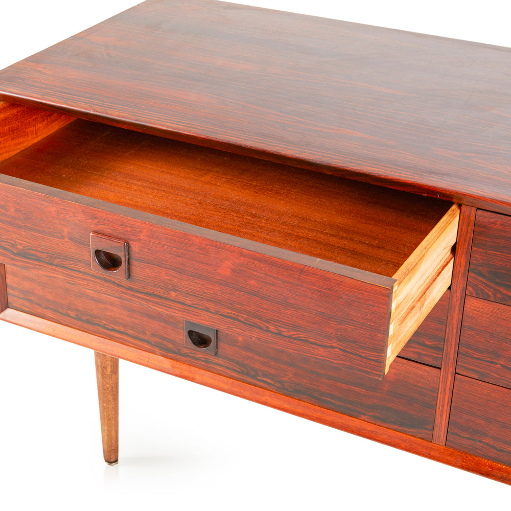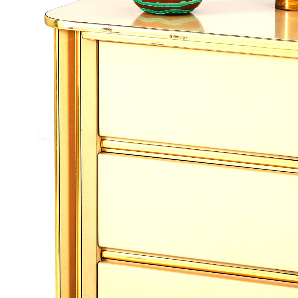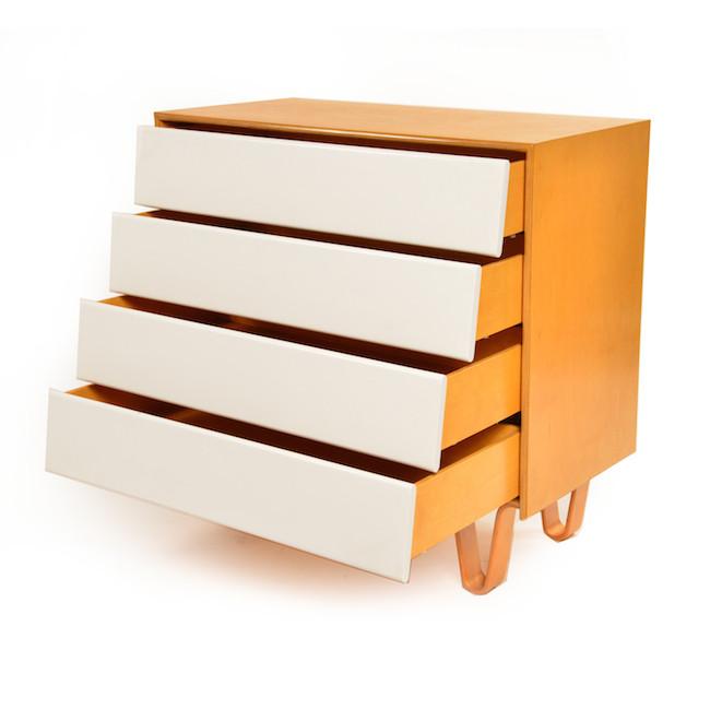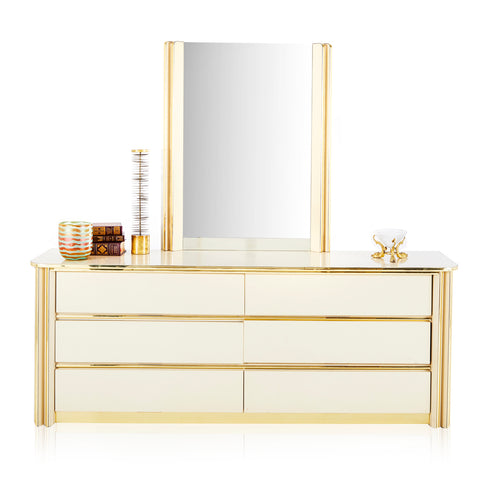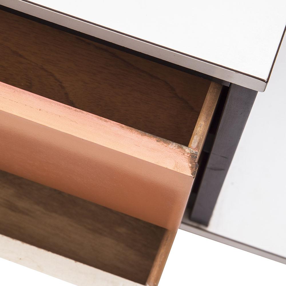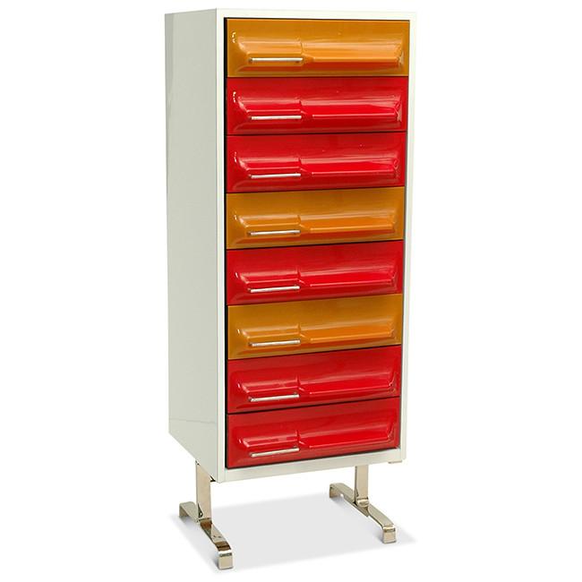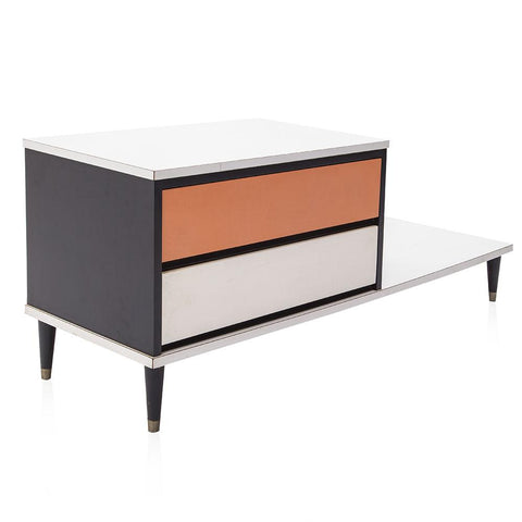 Details: Orange painted wood furniture set, orange, and yellow floral details, with three pieces, small desk and matching three-drawer dressers