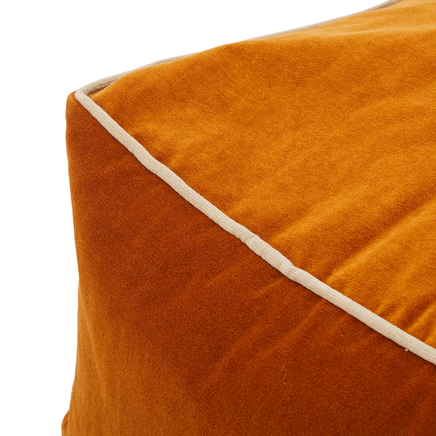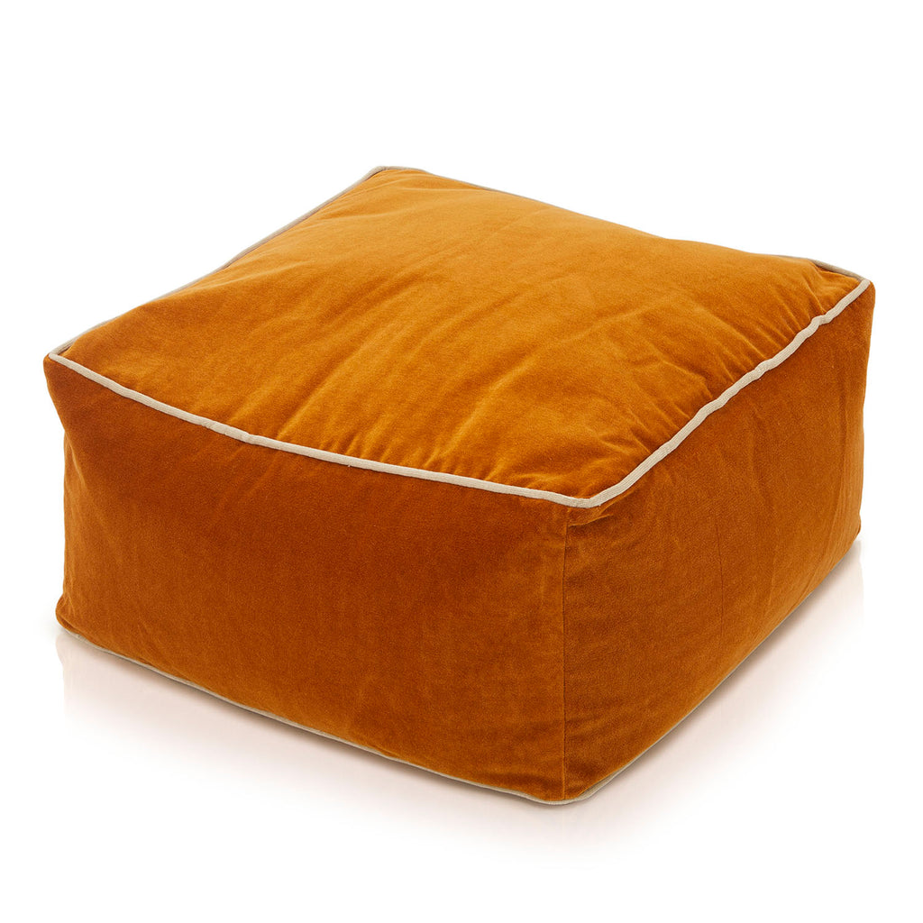 Details: Burnt orange velvet pouf square seat with cream color seam detail