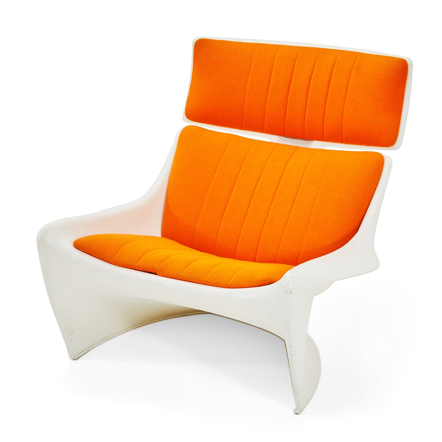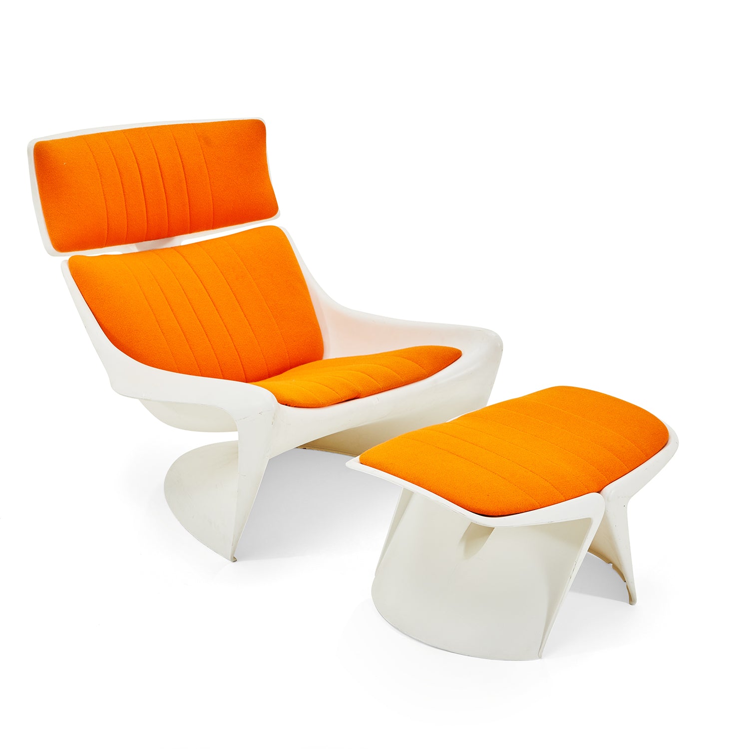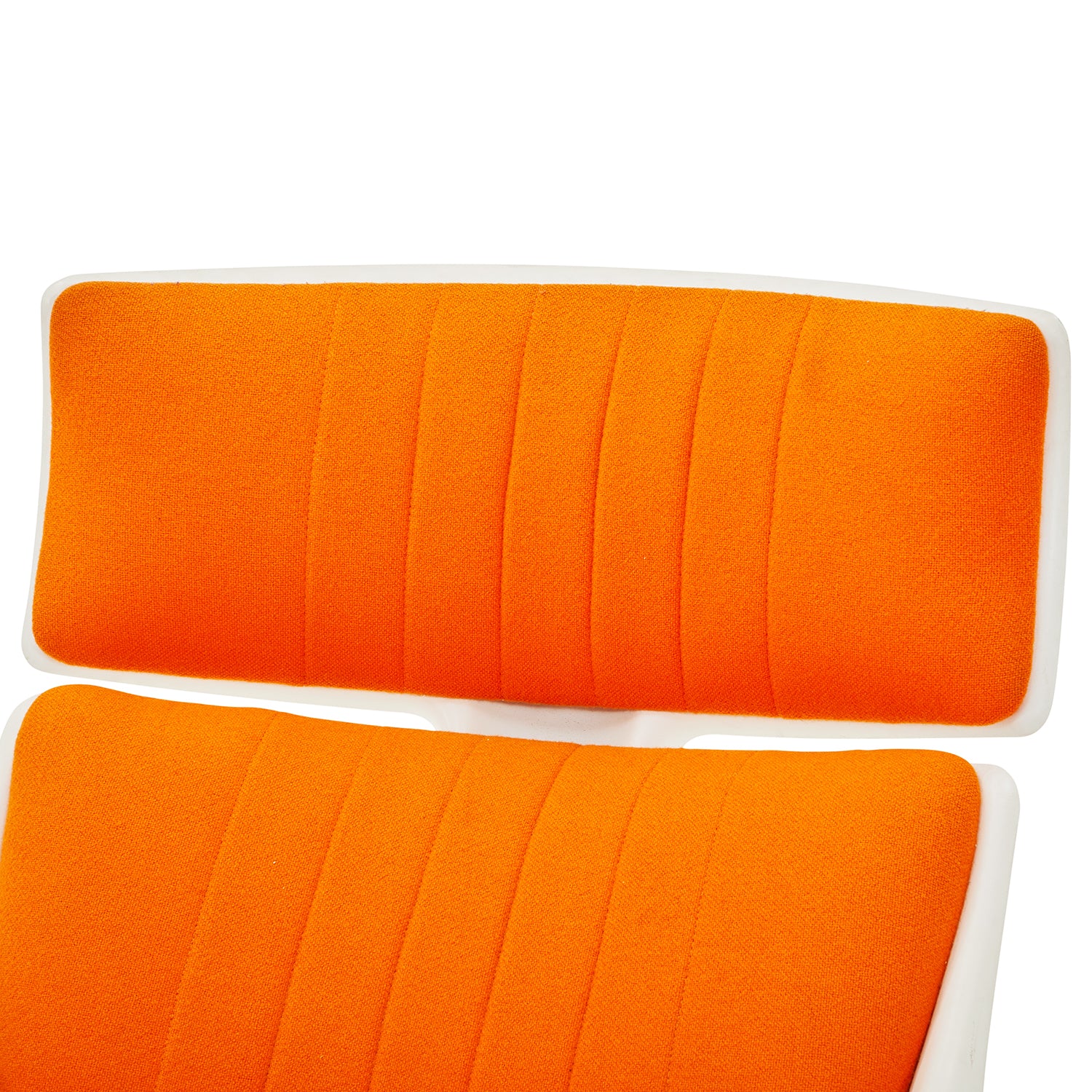 Details: White mod lounge chair with orange cushions, with matching ottoman