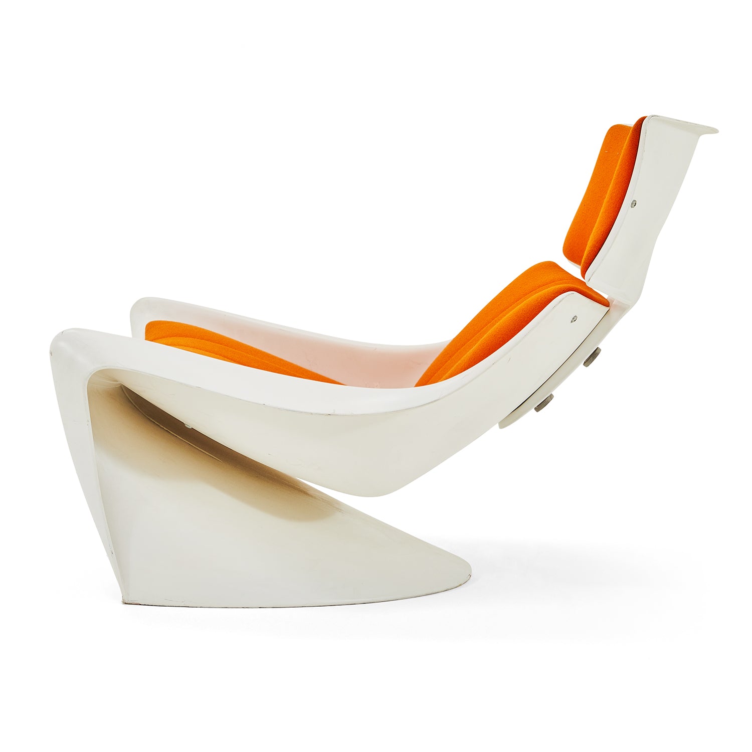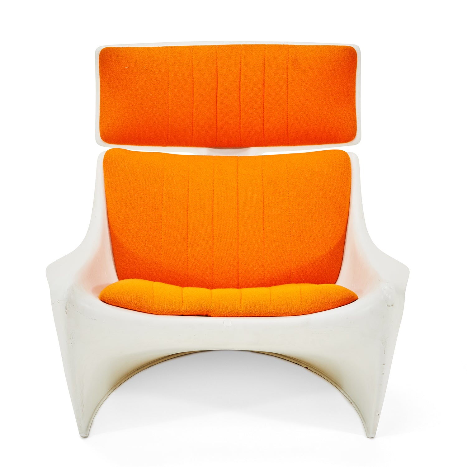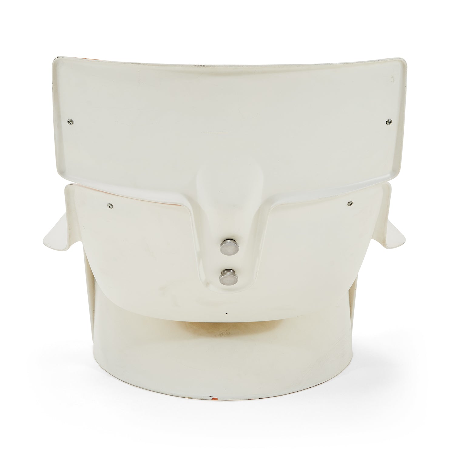 Details: White mod lounge chair with orange cushions, with matching ottoman