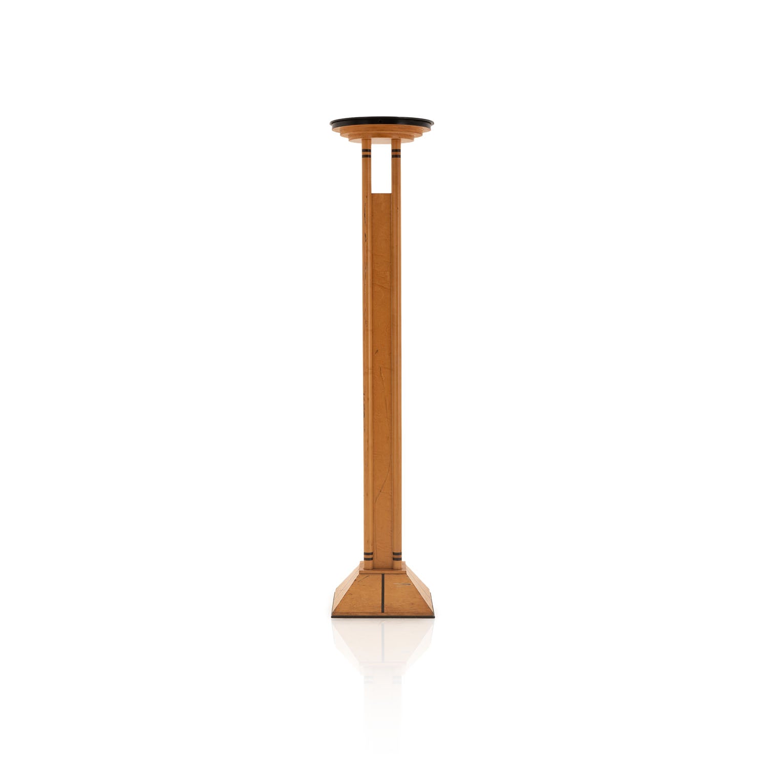 Details: Light wood pedestal with four columns, circular top, square / pyramid base and black inlay details Dimensions: 32" H x 14.5" W x 14.5" D ...