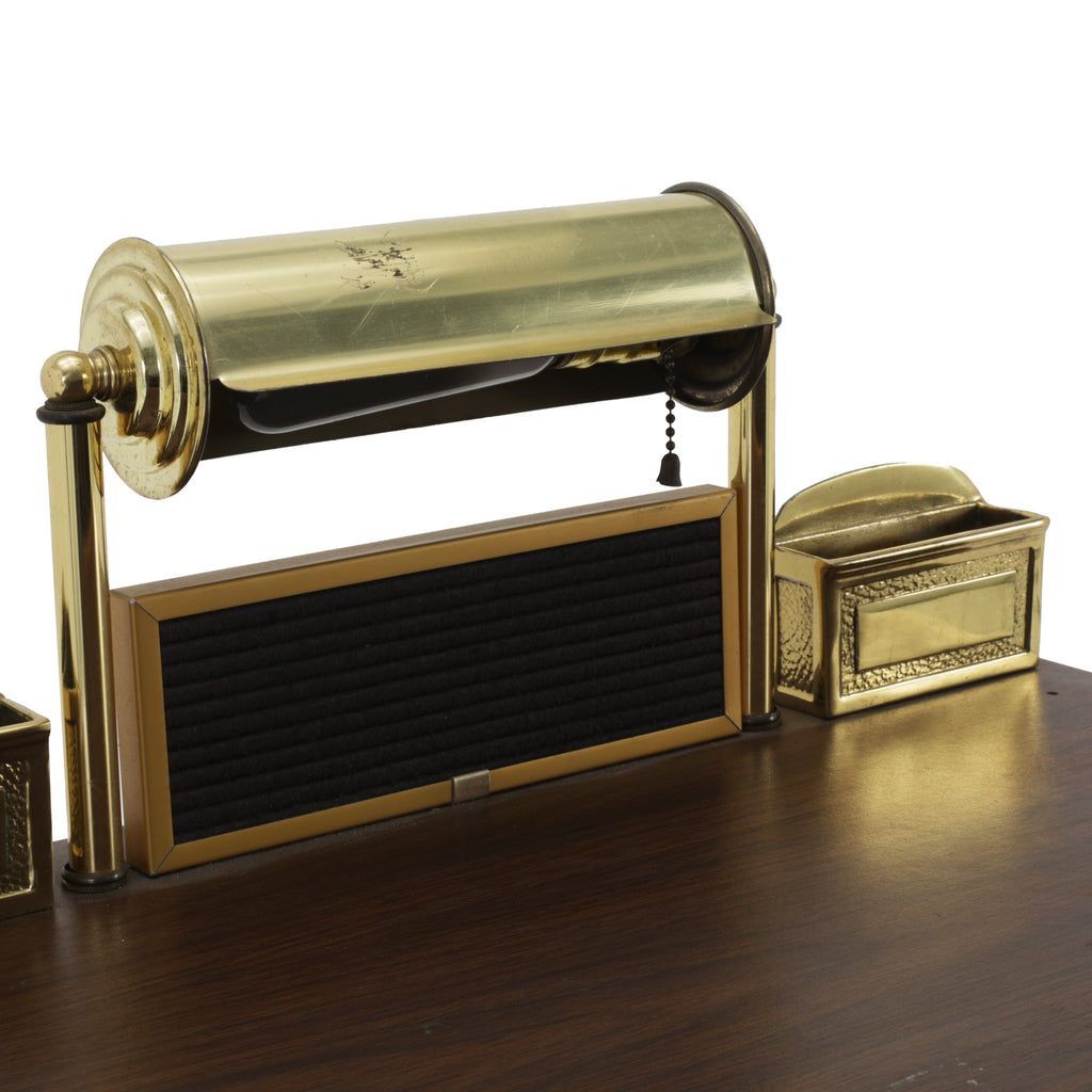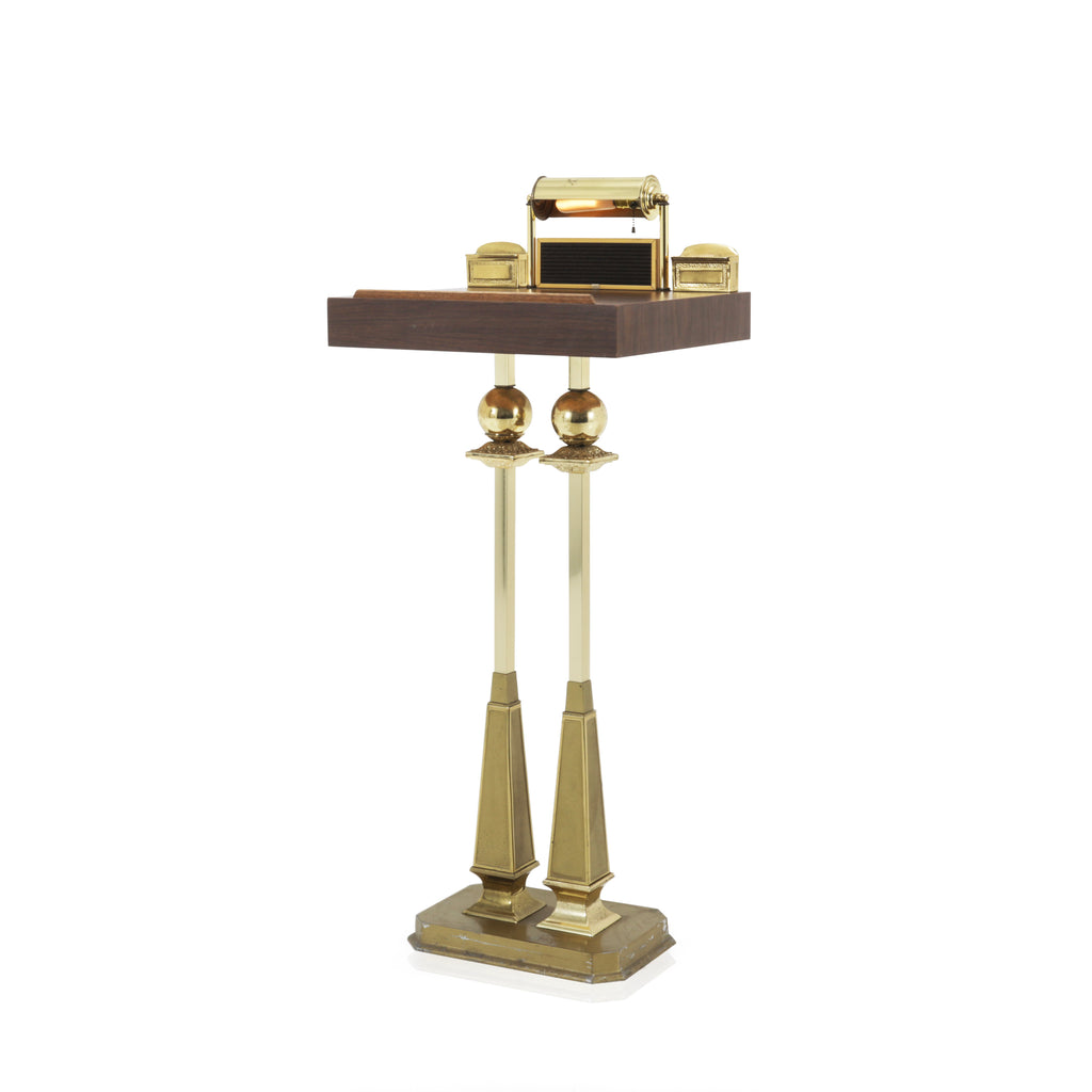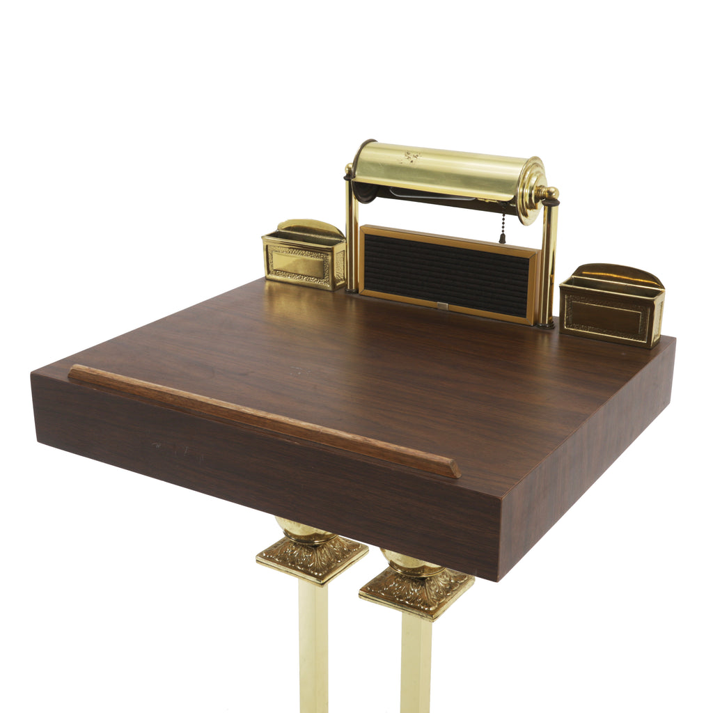 Details: Vintage wood top podium with gold details & legs. Reading lamp on top.