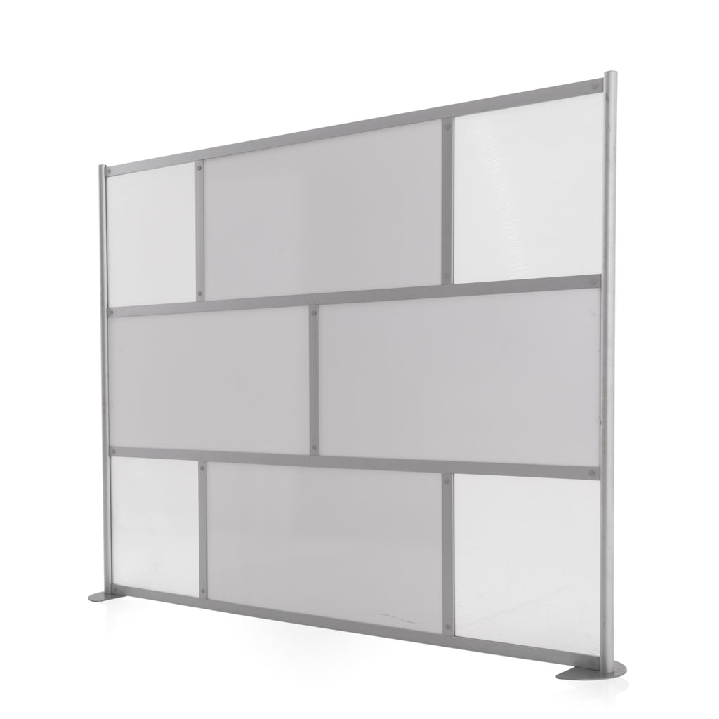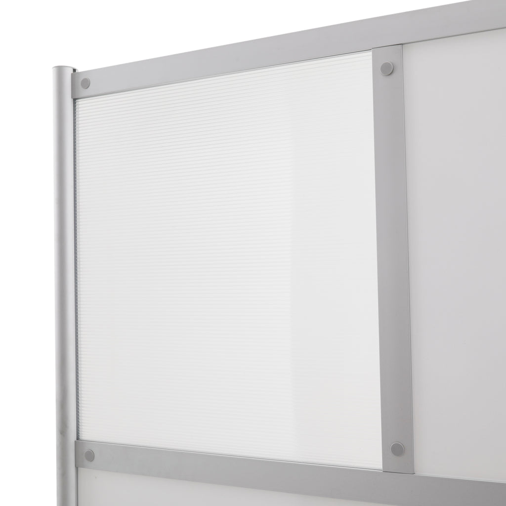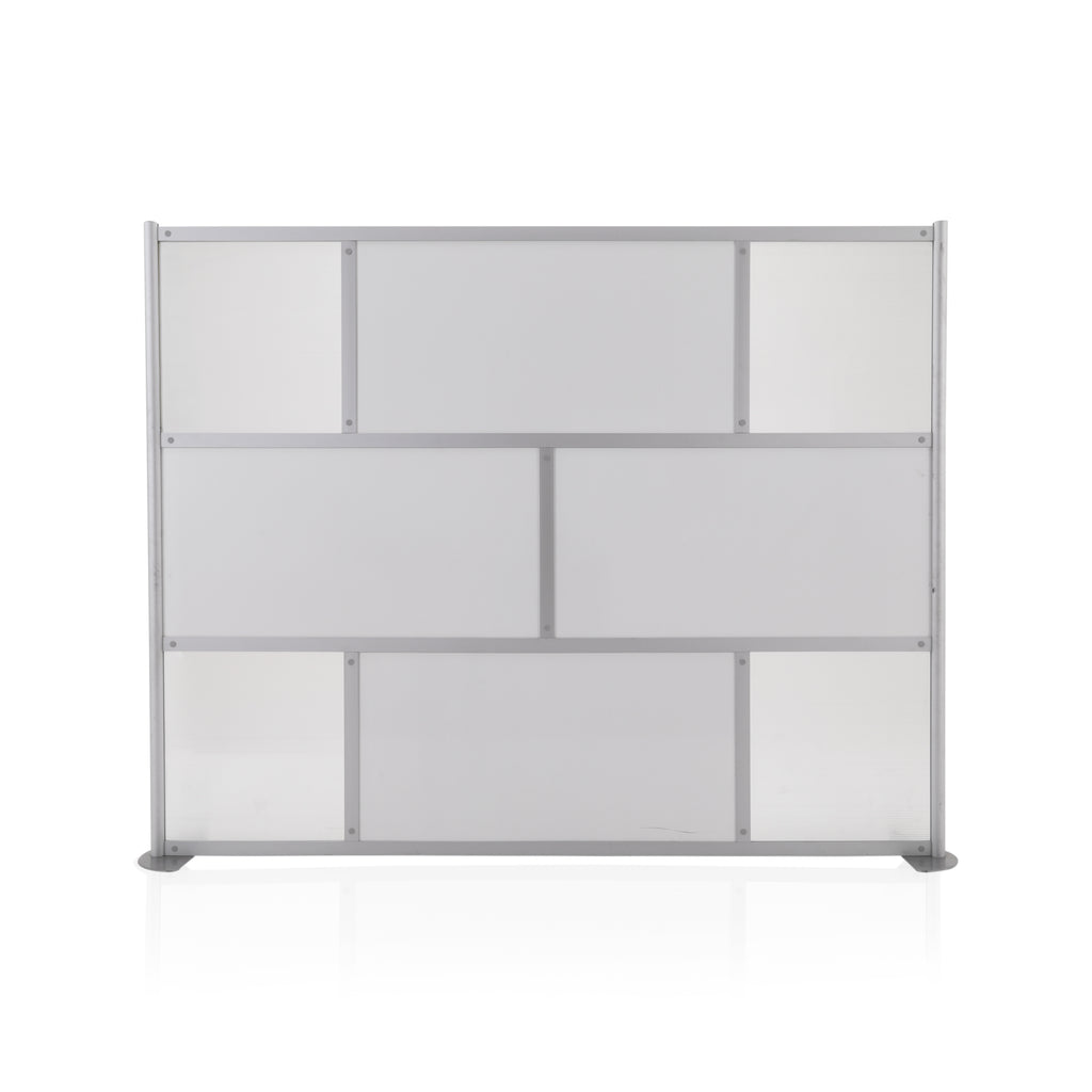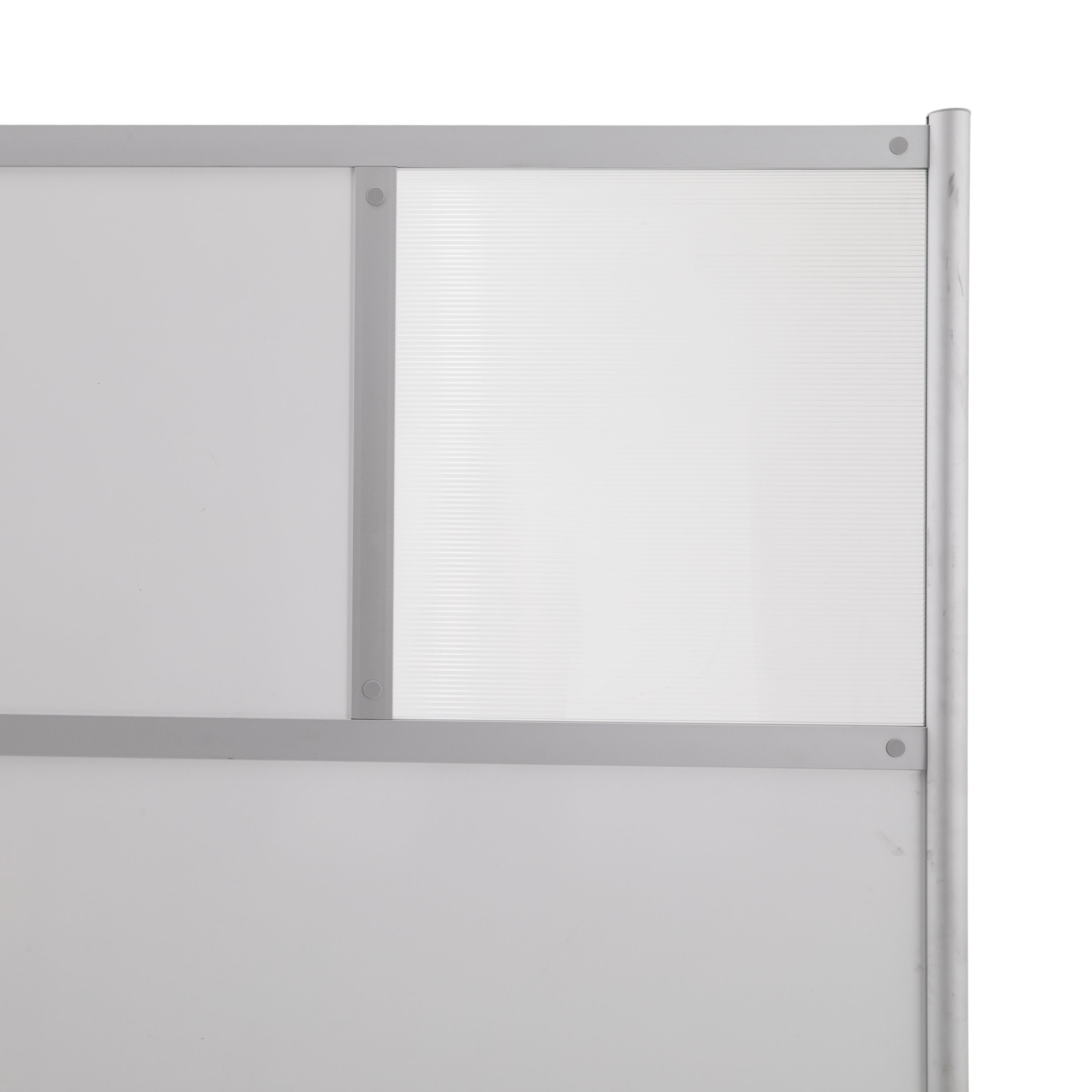 Details: Silver partition with opaque acrylic windows and white board panels. Dimensions: 77.5" H x 100" W x 13" D